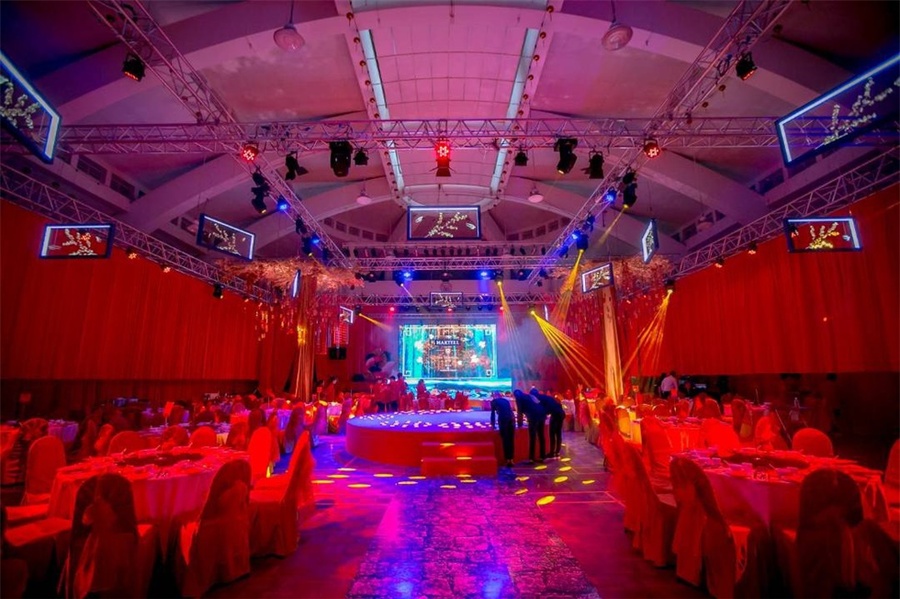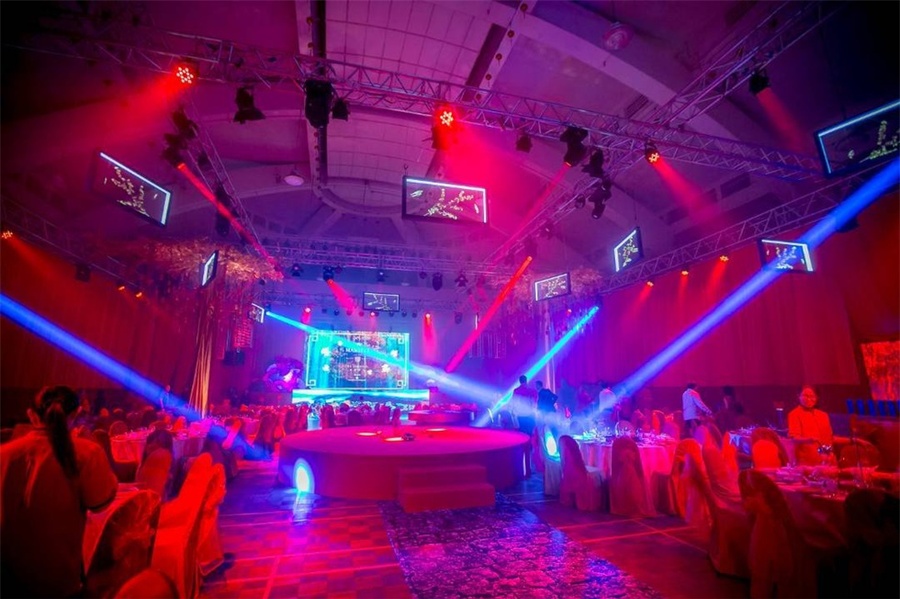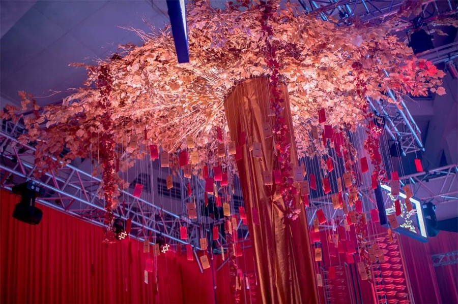 除了常规的主舞台,一个圆形的中央舞台被搭建在活动现场的中心,主舞台上多层的LED屏幕和中心圆形舞台的设计,旨在不断地转移客人的视觉焦点,让现场始终处于动态之中,拉近观众与舞台的交流,让每一次的视觉转移都带来不同的惊喜与体验,让晚会的氛围始终保持热度。