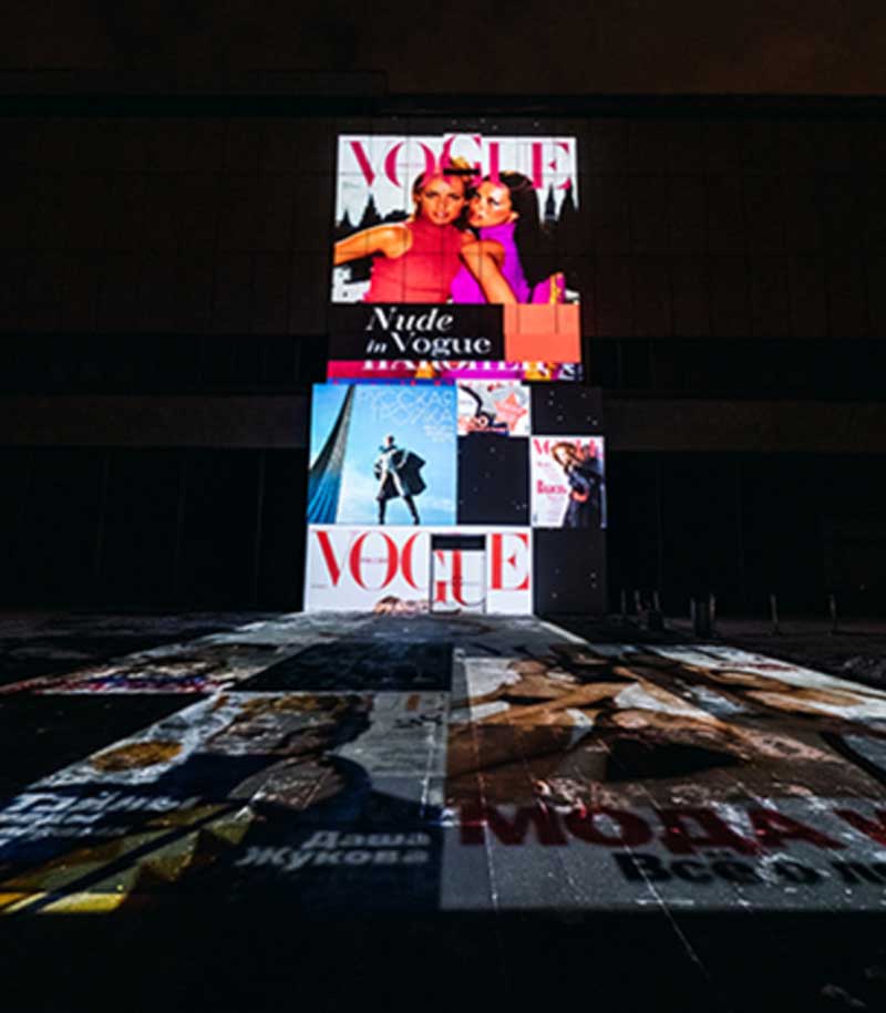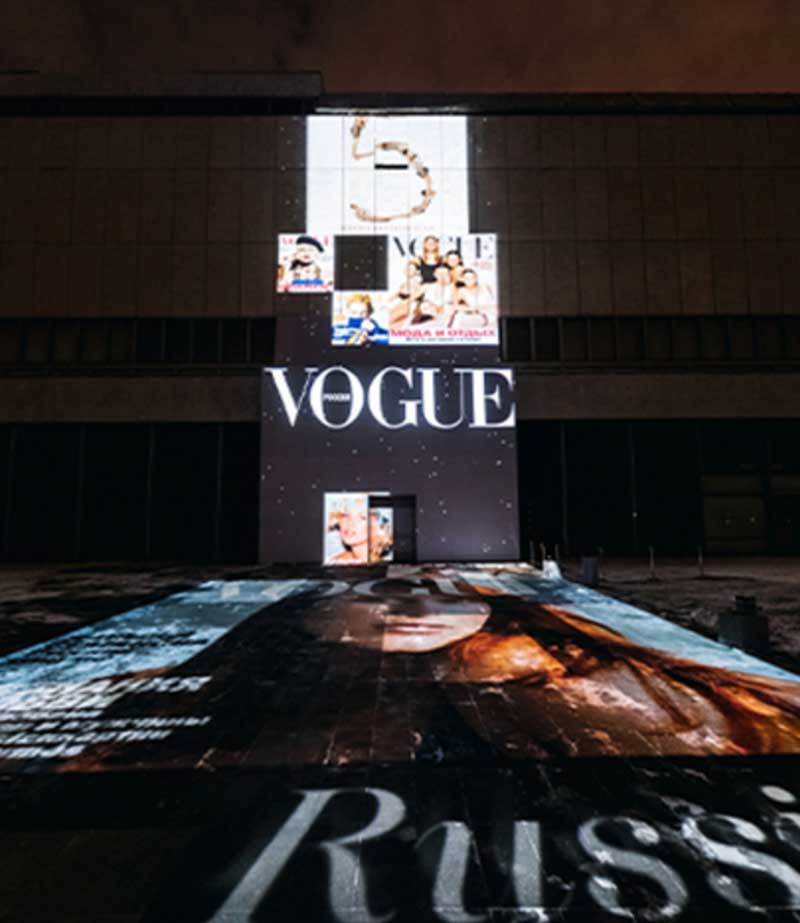 活动现场把博物馆的空间改造成一个大型的艺术装置,用来举办《Vogue》的盛大之夜。受20世纪早期国家先锋主义的启发,综合了光和声音,运用现代技术在这座传奇建筑的立面和庭院墙面打造了一场表演,所有的表达与创意都基于四个主要元素:苏联现代主义、俄罗斯前卫、《Vogue》的历史和Ishome电子音乐。 塞拉·斯韦塔的创意总监亚历山大.Us解释说:“俄罗斯的前卫艺术闻名于世。康定斯基、马列维奇和利西茨基都很有名。他们最好的作品就在特列季亚科夫画廊,所以我们决定以这些收藏品为出发点,在博物馆传奇建筑的墙壁和天花板运用现代技术来重塑这样的风格。”