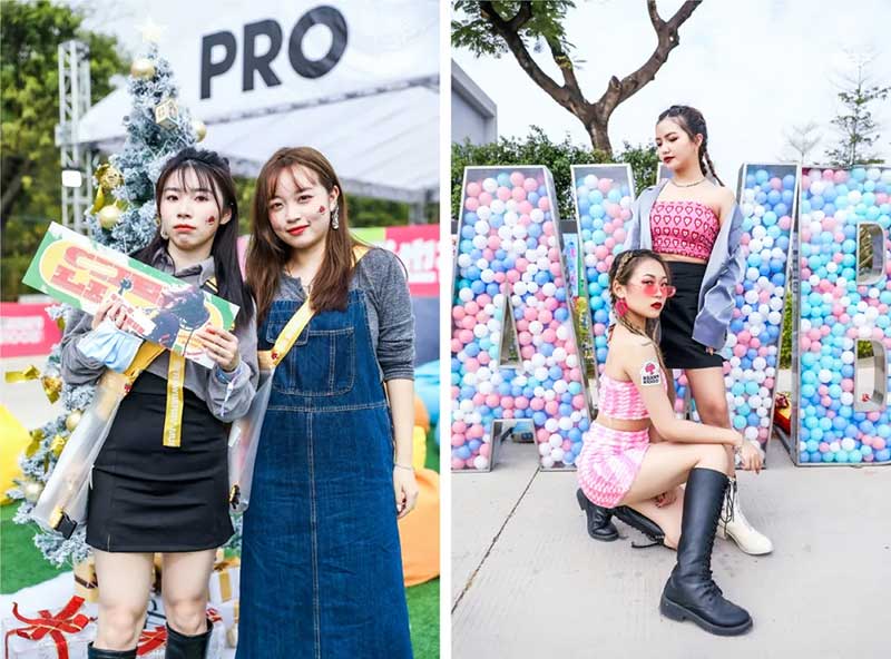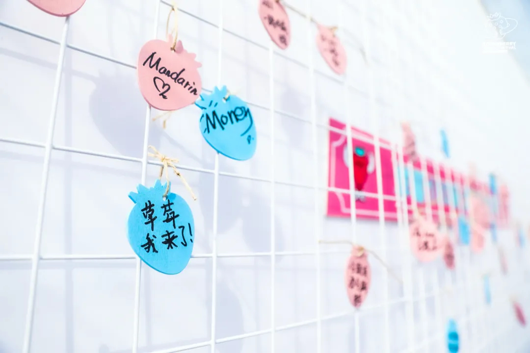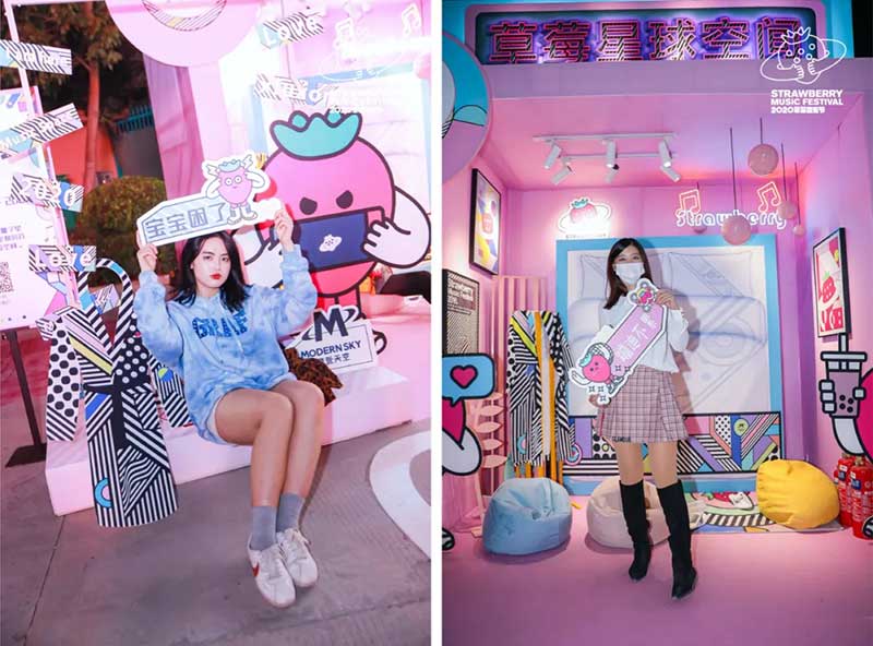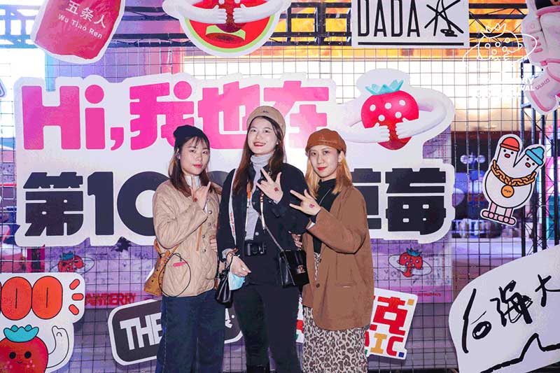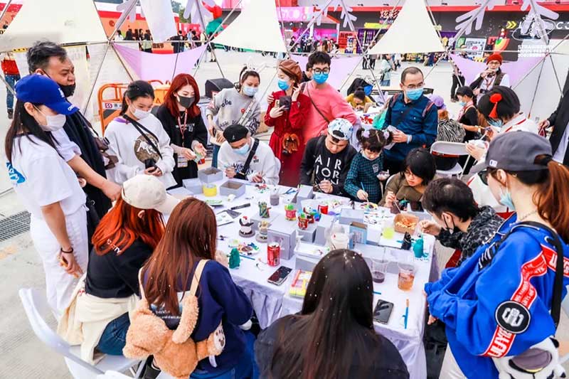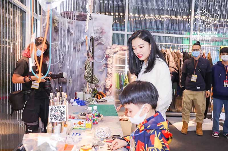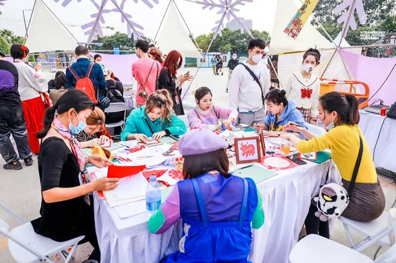 场地中央的Strawberry Hub圣诞主题互动体验区,这里是互动手工坊,也是你玩累了可以停下小憩的休息区。创意手工坊,水泥质感的趴趴熊在大家的巧手涂鸦下变身不同的形象,而一张张平平无奇的纸,在剪纸艺术家郭梦的指导下,被大家变成了鲜活的草莓、小动物。