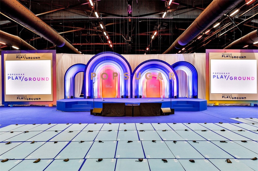 2018年第一次举行的“PopSugar 乐园”取得了巨大的成功,这是一个面向18至34岁女性的为期两天的互动活动,该活动旨在通过论坛、音乐表演、健身课程、引人注目的艺术装置和大型的购物集市等活动项目,将在PopSugar平台上的虚拟内容带入到线下的现实生活中。2019年PopSugar的第二届年度“乐园”活动通过一场独一无二的有趣的展览再次吸引了女性观众,今年活动创造了一个基于渐变的图形套件,无缝地从PopSugar的网站体验过渡到现场体验中,渐变的条纹散发、交织在一起,这是今年的标志性设计语言。