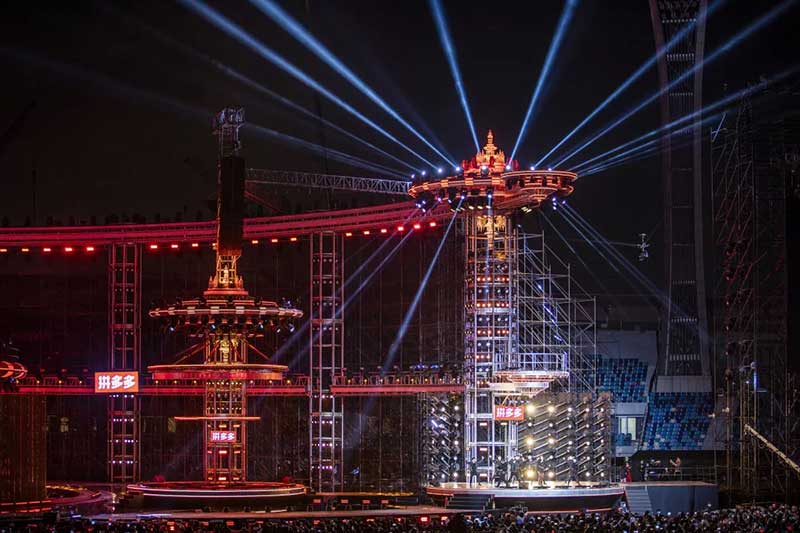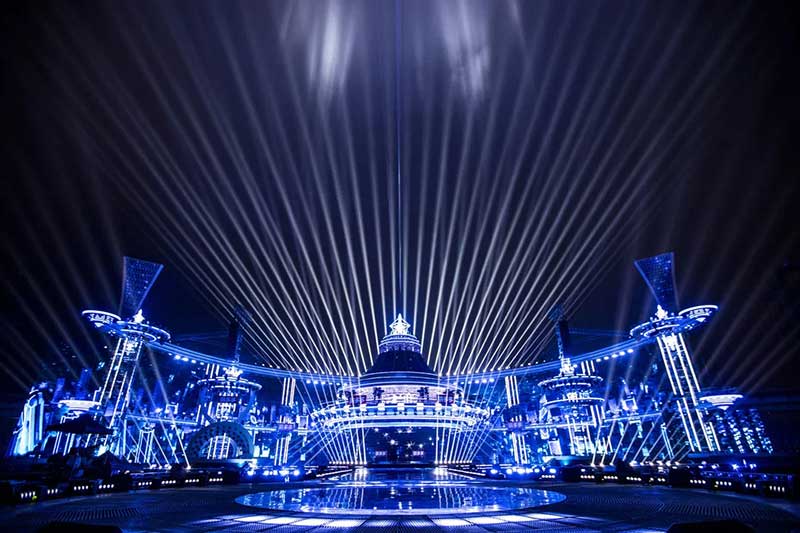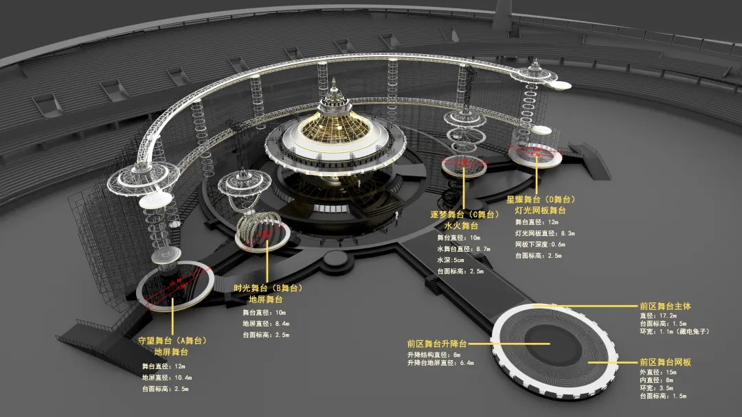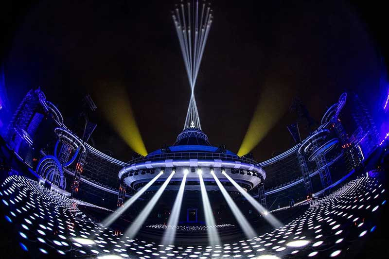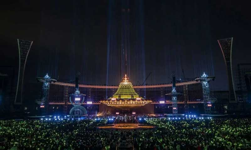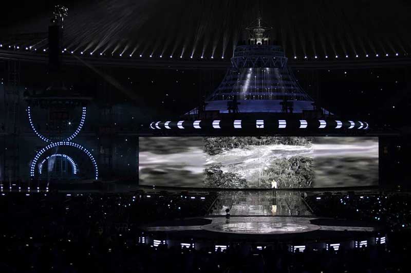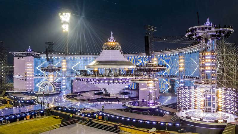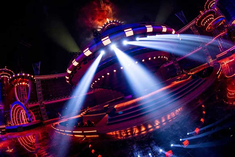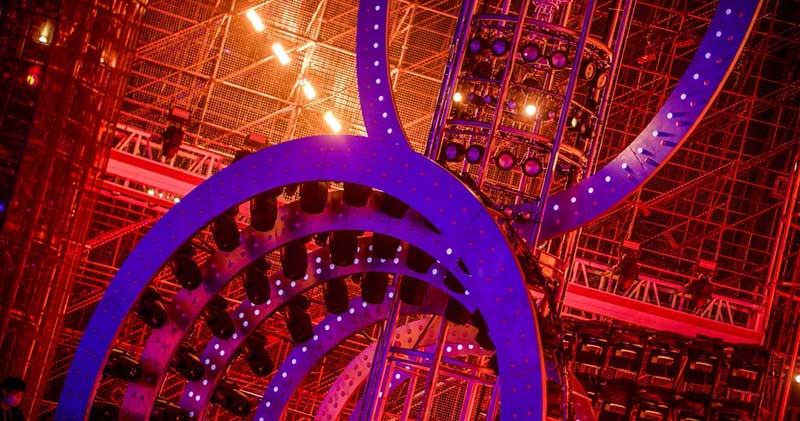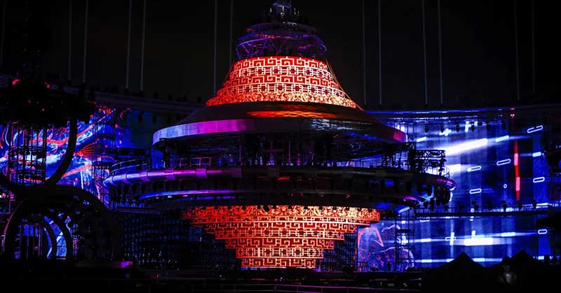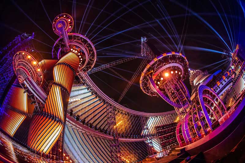 湖南卫视2020—2021跨年演唱会再次在海口市五源体育馆震撼开唱,本次演唱会以“青春同心 乘风破浪”为主题,继续将“青春”作为源动力,用音乐的放肆乘风航行,展现团结奋斗的力量,共谱2021全民心声。本次的设计方案也聚焦于“科技”与“未来”,将以缔造一座“未来之城”为愿景,通过极具空间质感及机械美感的符号意象,让舞台化身为永远向前的“时光机”。