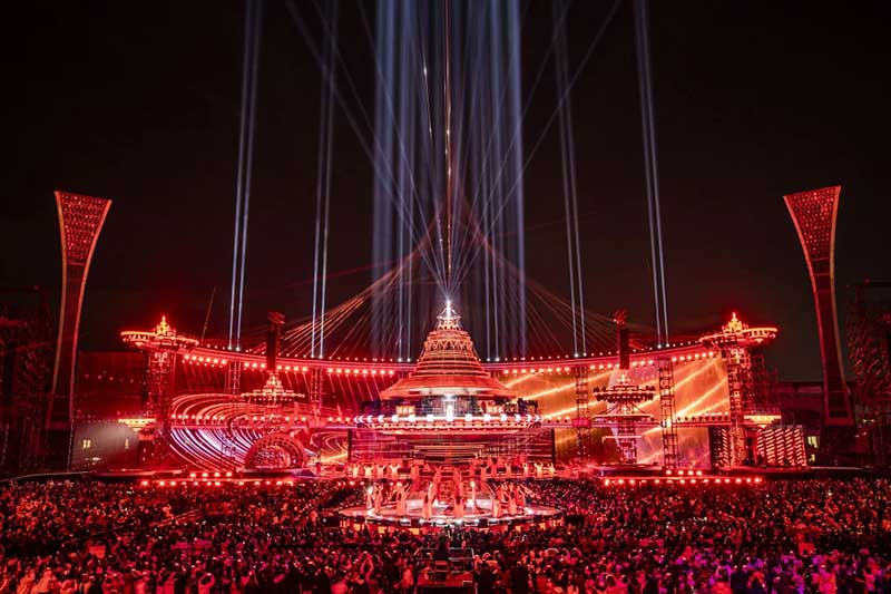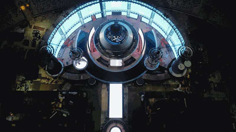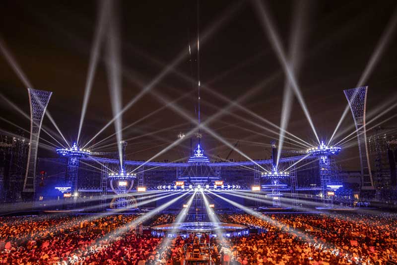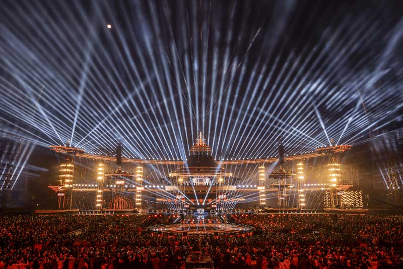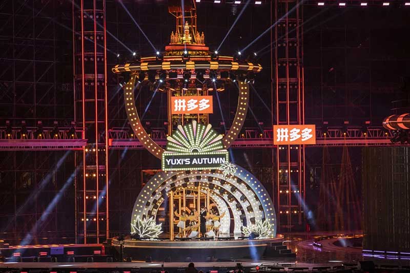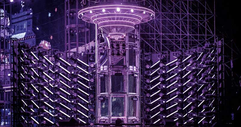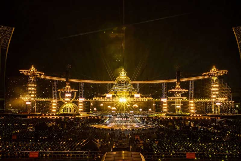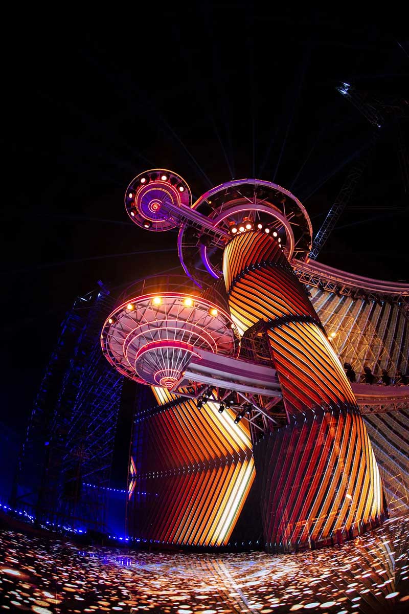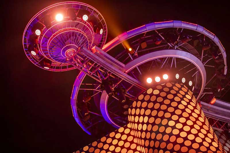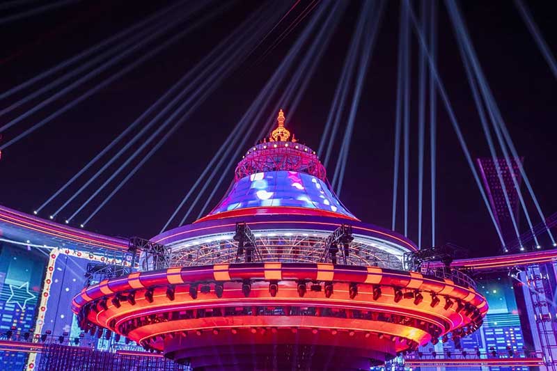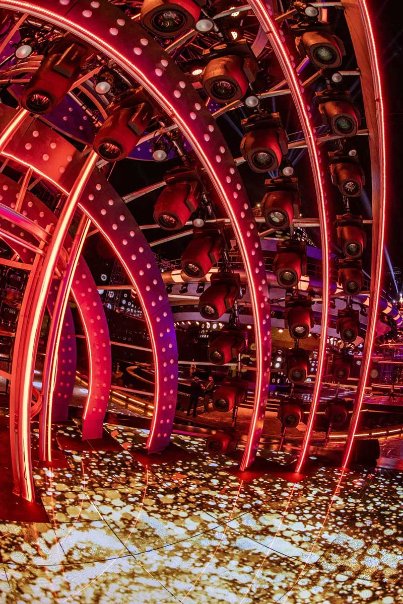 湖南卫视2020—2021跨年演唱会再次在海口市五源体育馆震撼开唱,本次演唱会以“青春同心 乘风破浪”为主题,继续将“青春”作为源动力,用音乐的放肆乘风航行,展现团结奋斗的力量,共谱2021全民心声。本次的设计方案也聚焦于“科技”与“未来”,将以缔造一座“未来之城”为愿景,通过极具空间质感及机械美感的符号意象,让舞台化身为永远向前的“时光机”。