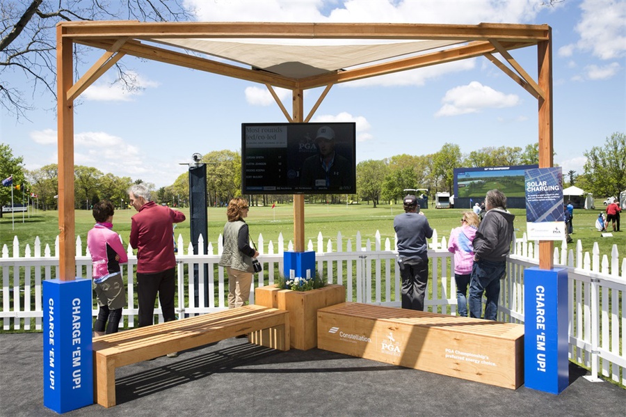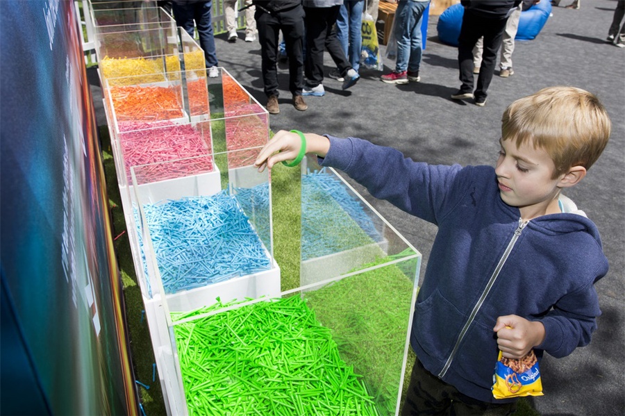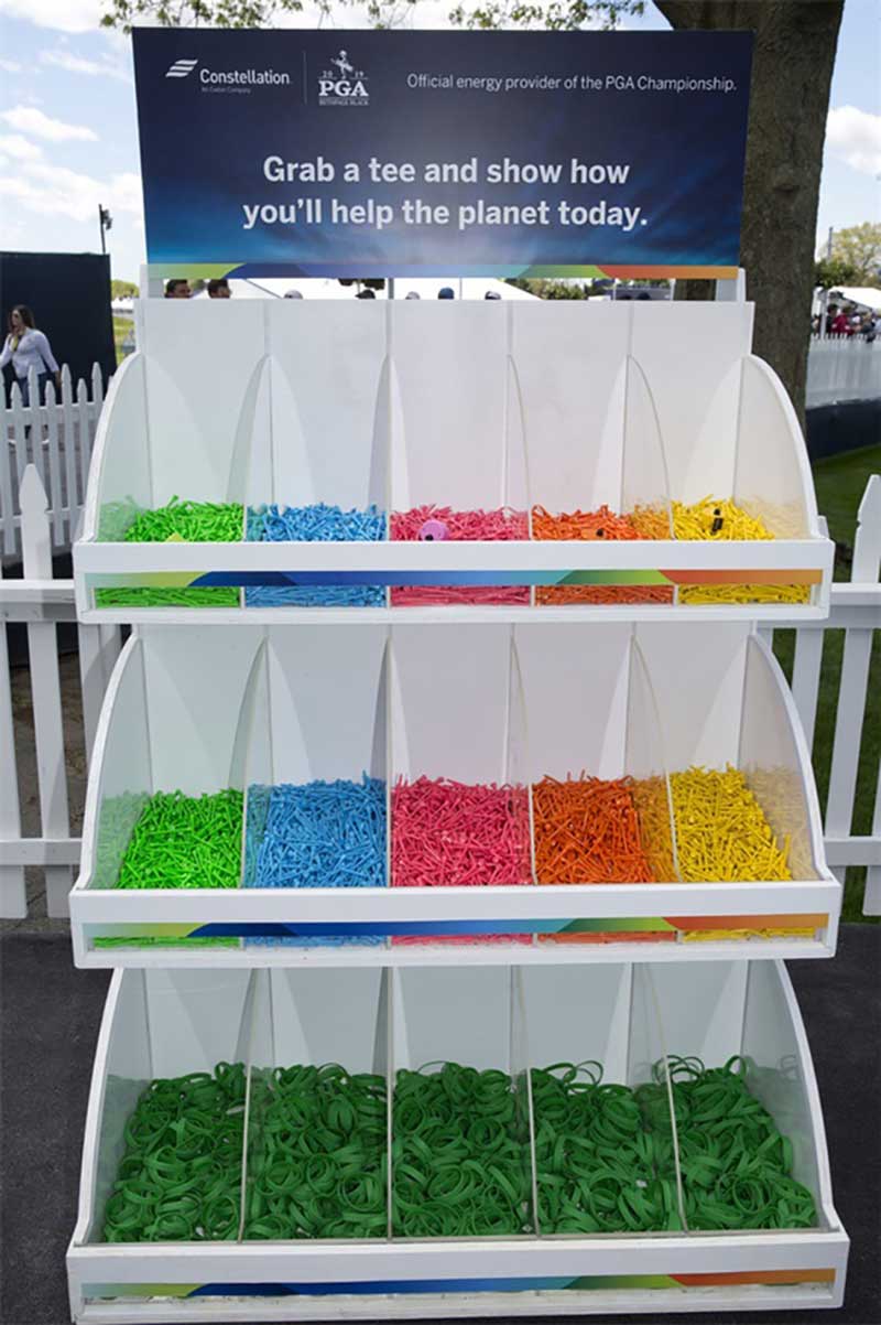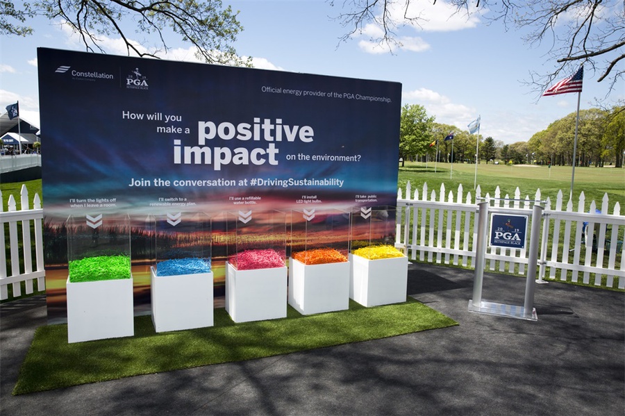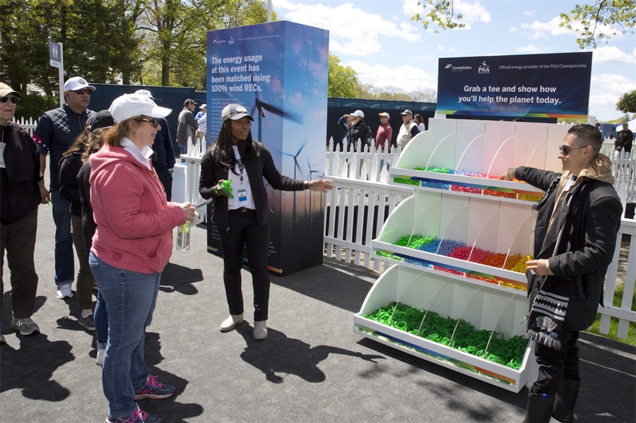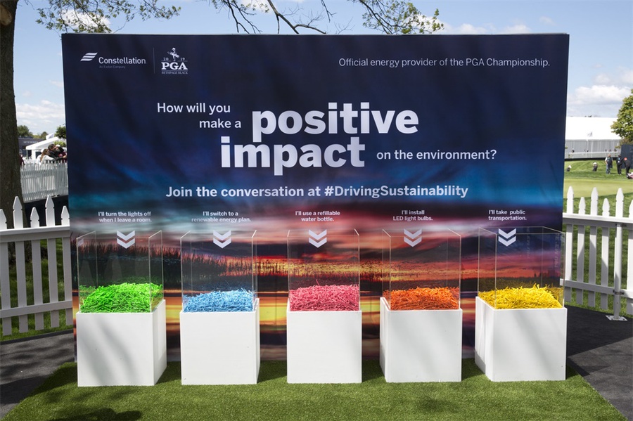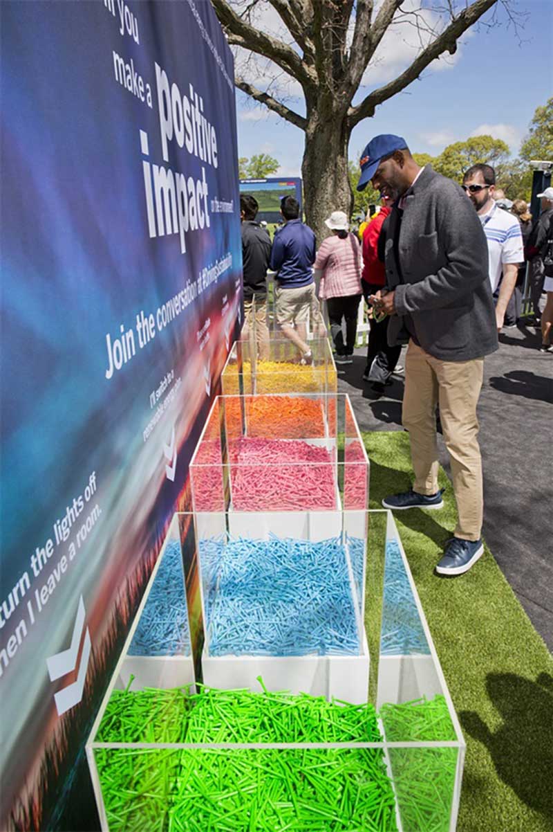 在纽约长岛贝斯佩奇·布莱克高尔夫球场举行的第101届PGA锦标赛上,美国联合能源公司作为本次比赛的官方能源合作伙伴,需要体现该公司注重环境的理念。活动制作了5万个彩色高尔夫球座,参加者可以象征性地将这些球座放置在承诺墙前。