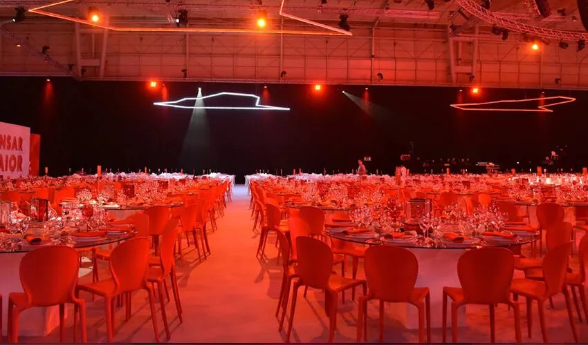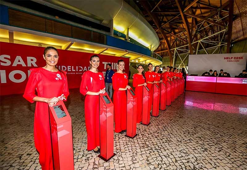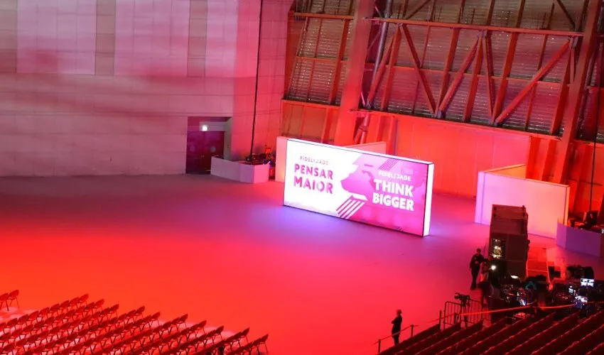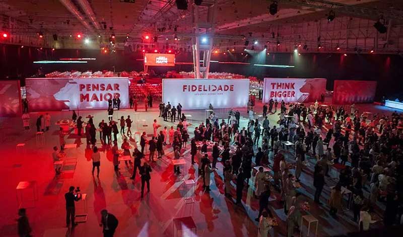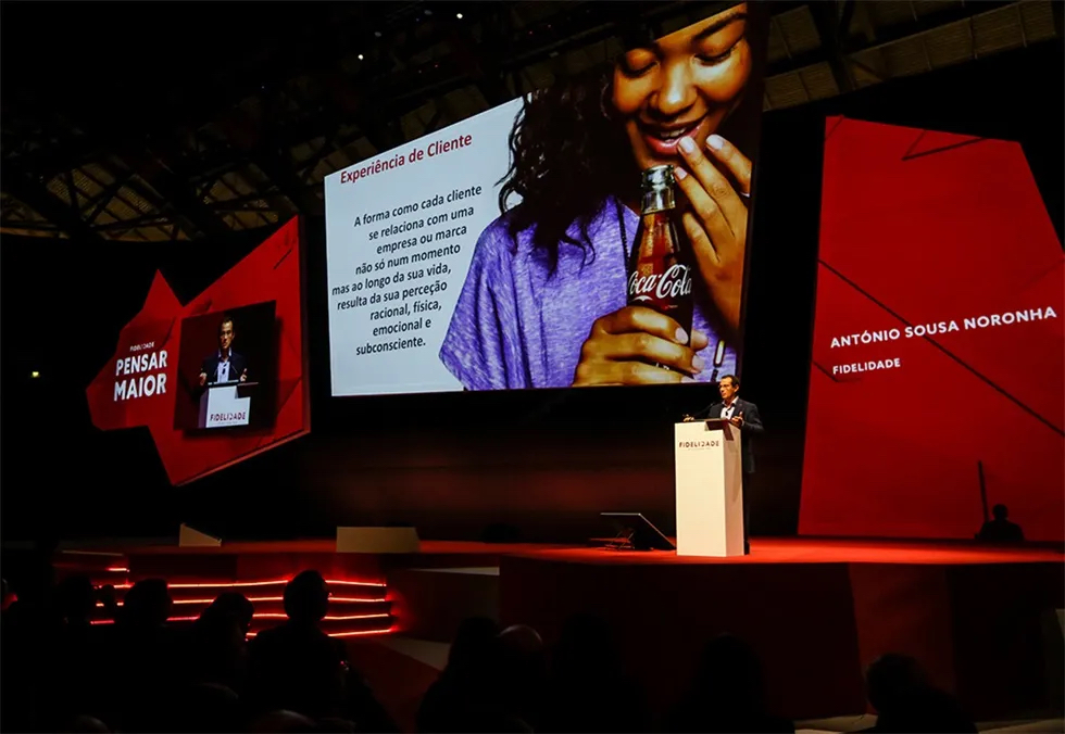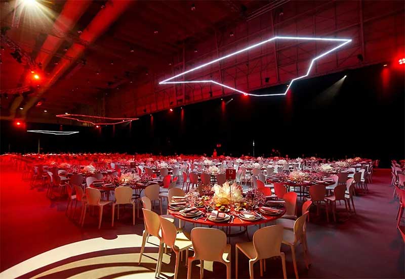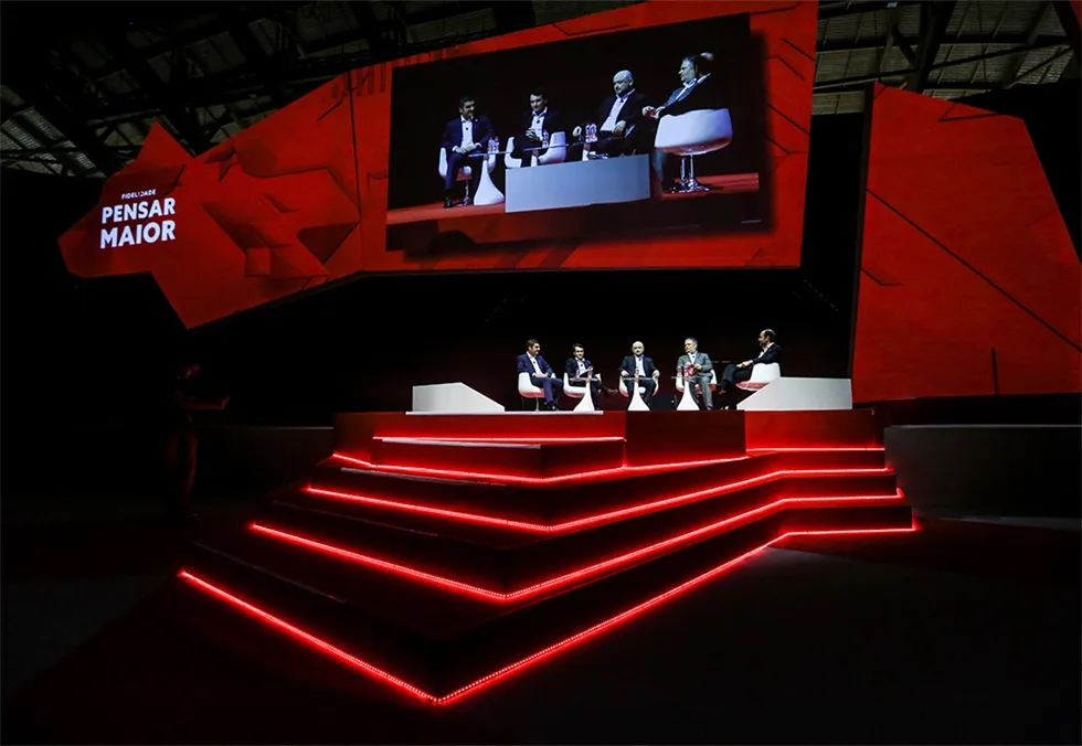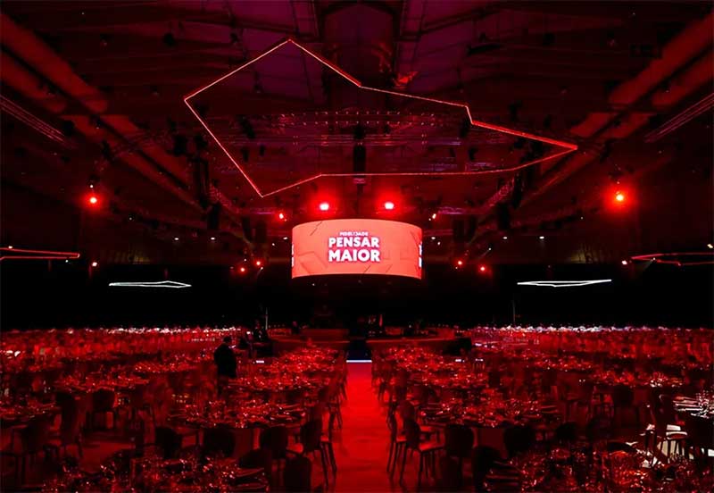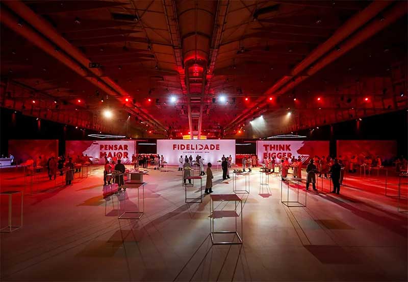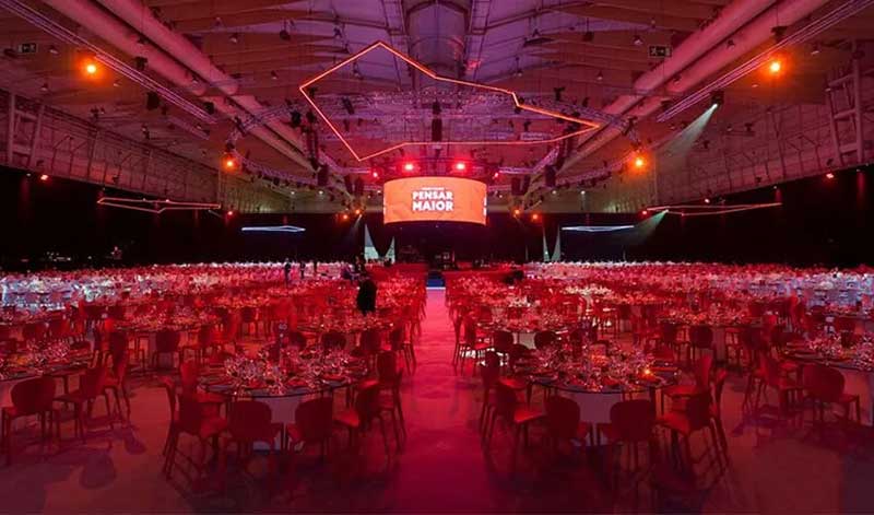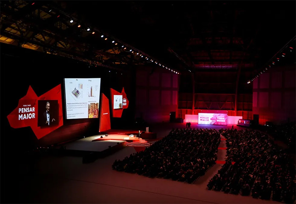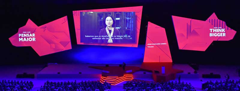 这次忠诚保险葡萄牙年会花了4个月时间进行策划,现场迎来了3600位客人。舞台上使用了宽72米的巨型投影屏幕,使用视频跟踪技术分为四个部分,使用了两台Coolux Pandoras Box Quad Server视频服务器,6台高速跟踪摄像机和16个ID标签,可以识别4个屏幕的位置,以便实时地跟踪舞台屏幕的运动。