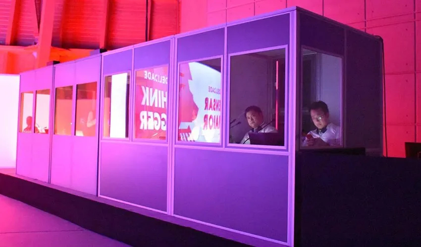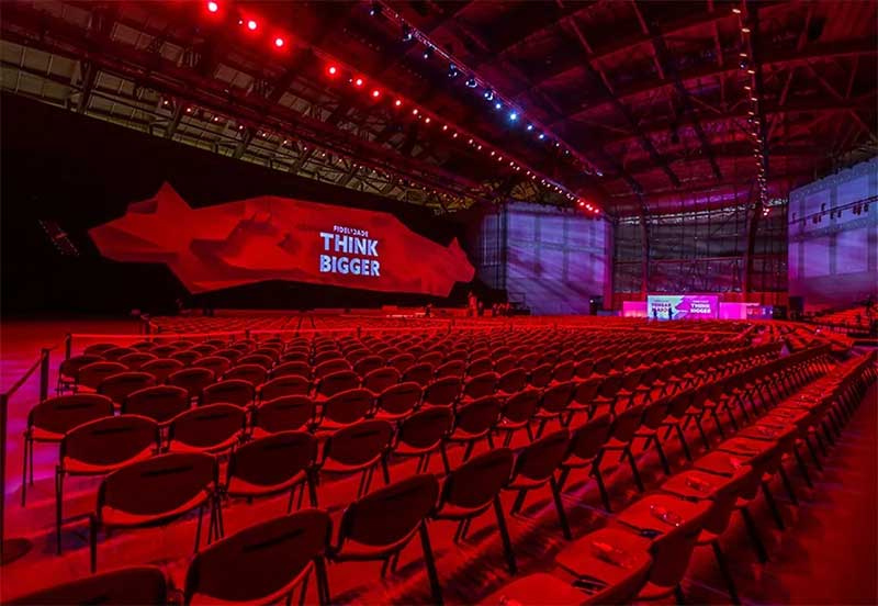 扫码签到加快了大型会议签到流程,提升了参会人员的体验感。会议主舞台背景设计由几块独立的背景组成,运用视频映射进行投影,背景屏幕的内容既可以每个屏幕进行独立投射内容,也可以把它们当作一个整体进行整体画面的投影。最特别之处作为背景屏幕的背景板还可以移动,这样的设计让与会者不至于在冗长的会议中视觉过于疲劳,不同的会议阶段舞台上的背景变化也会激发参会者的注意力。