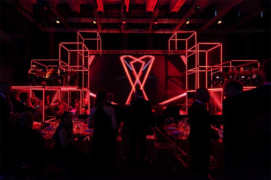 优雅的氛围和盛大的晚宴是为了来自世界各地的最佳传播项目颁奖筹备的,钢管架和LED灯带的组合使用强化了整个舞台考过,活动还特别安排了交响乐团在每一次颁奖和下一个颁奖之间也进行了助兴表演。