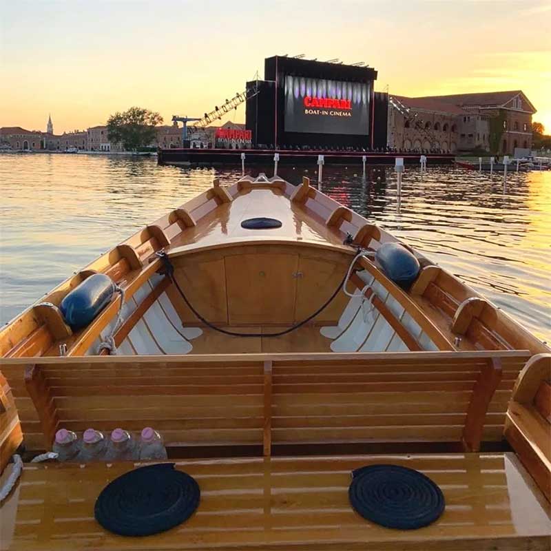完成浮式结构(40mx10m)并运输到最终地点,需要15天的准备时间,整个漂浮的结构,容纳了舞台和屏幕,以充分体验水上电影的特点。30多艘配有座位和靠垫的历史悠久的威尼斯船只,供客人乘坐,并有一个安全的停泊方案,由专业的水上团队提供。