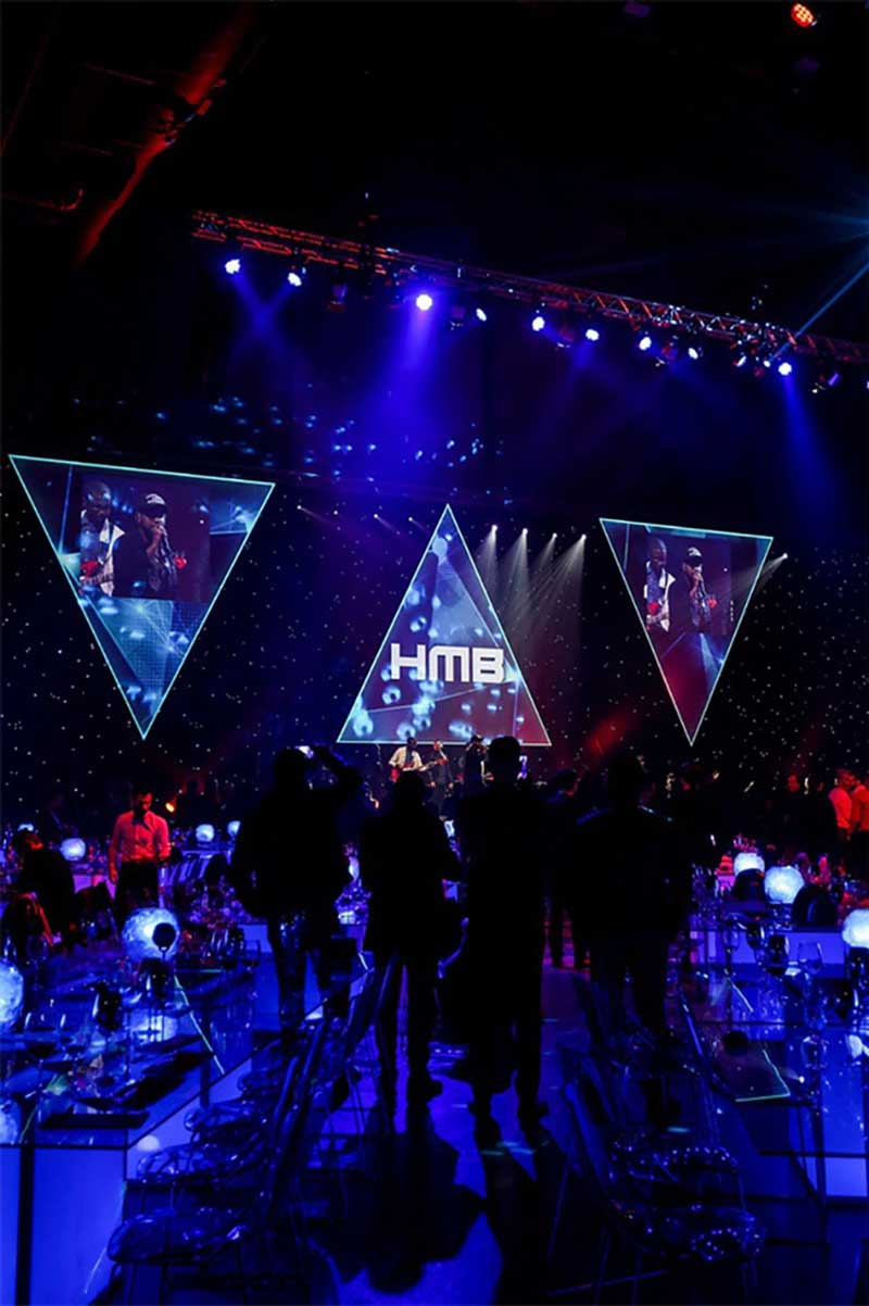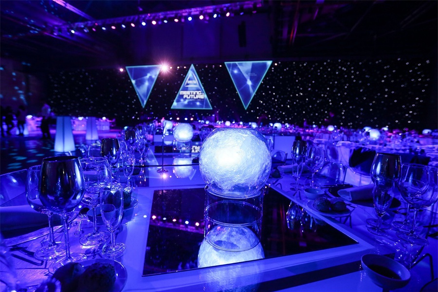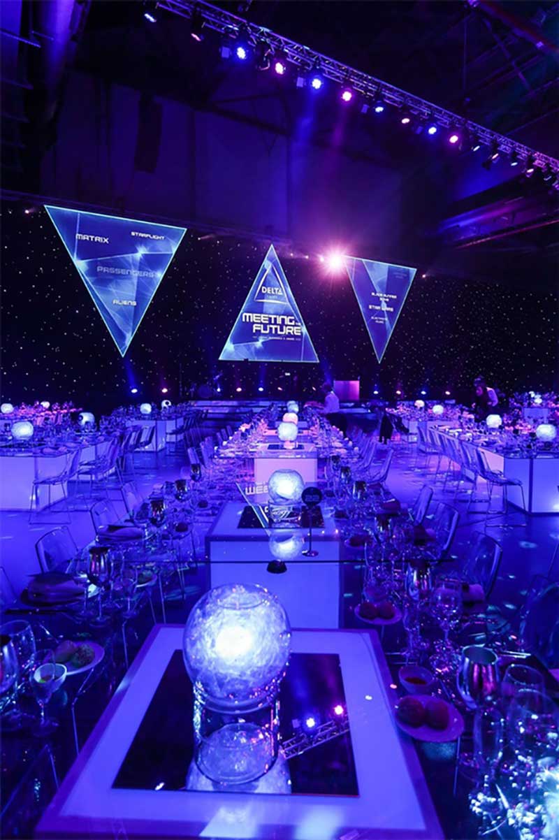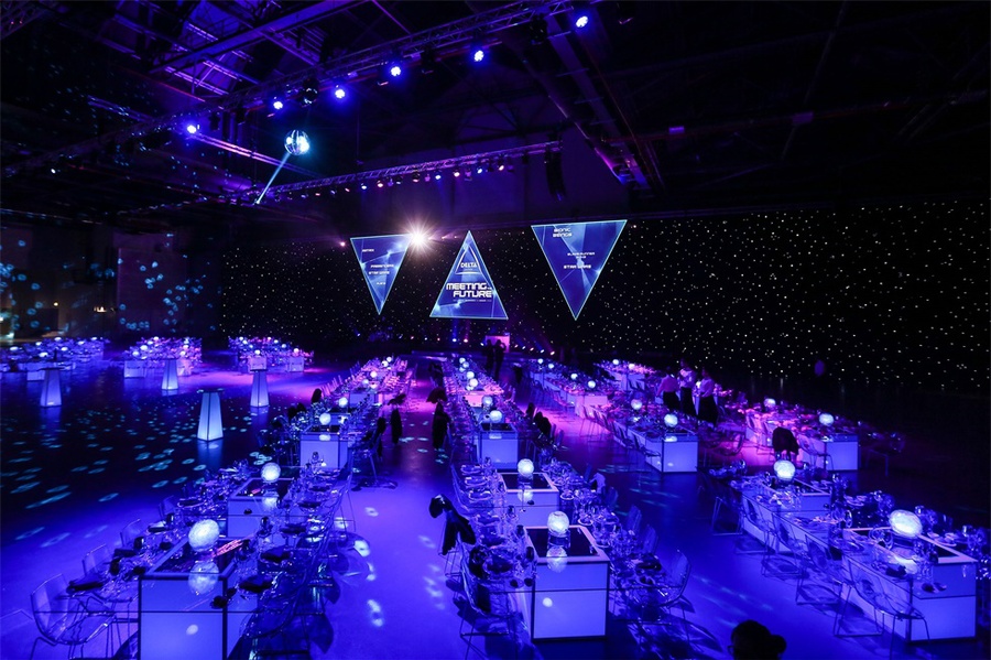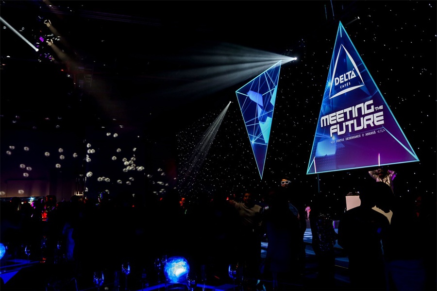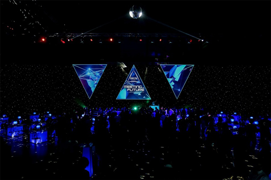 达美咖啡(Delta Cafés)的英文单词中的Delta有三角洲的意思,年会选择了一个代表未来科幻主题的员工活动,从迎宾开始到舞台搭建、服装、画面设计、视频动画素材、演出表演、活动美食都围绕科幻主题进行设计。三块三角形投影屏幕在星光幕布的映衬下,仿佛是茫茫太空中的三角洲,三角形的屏幕也暗示了达美咖啡品牌。