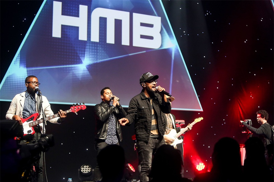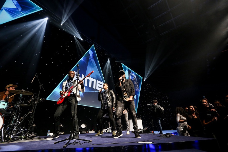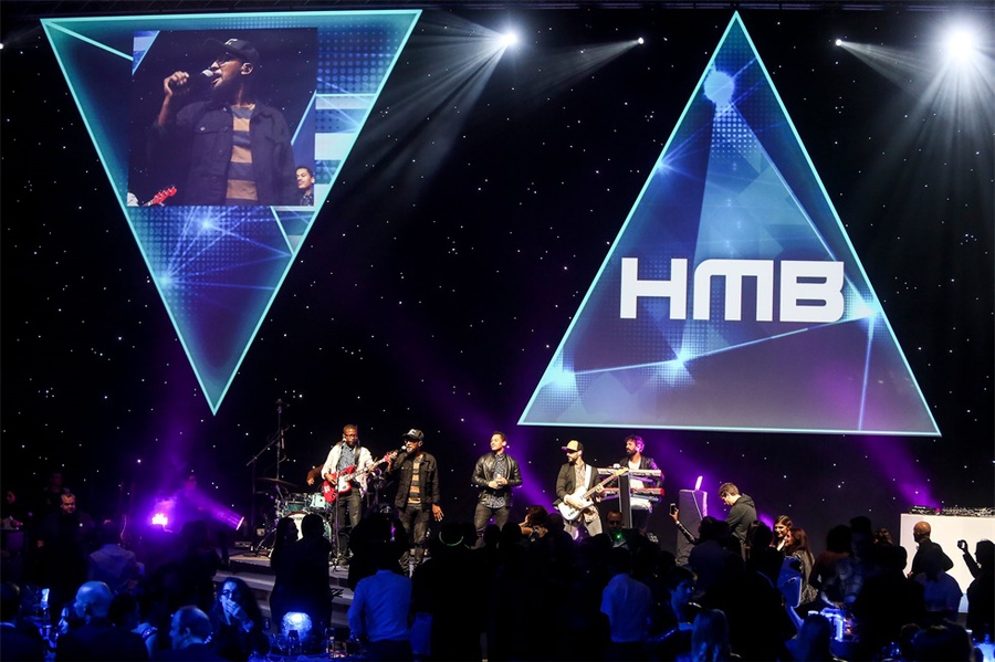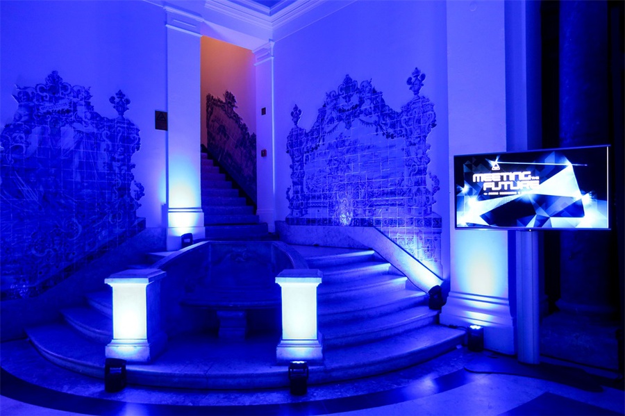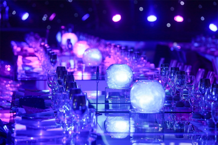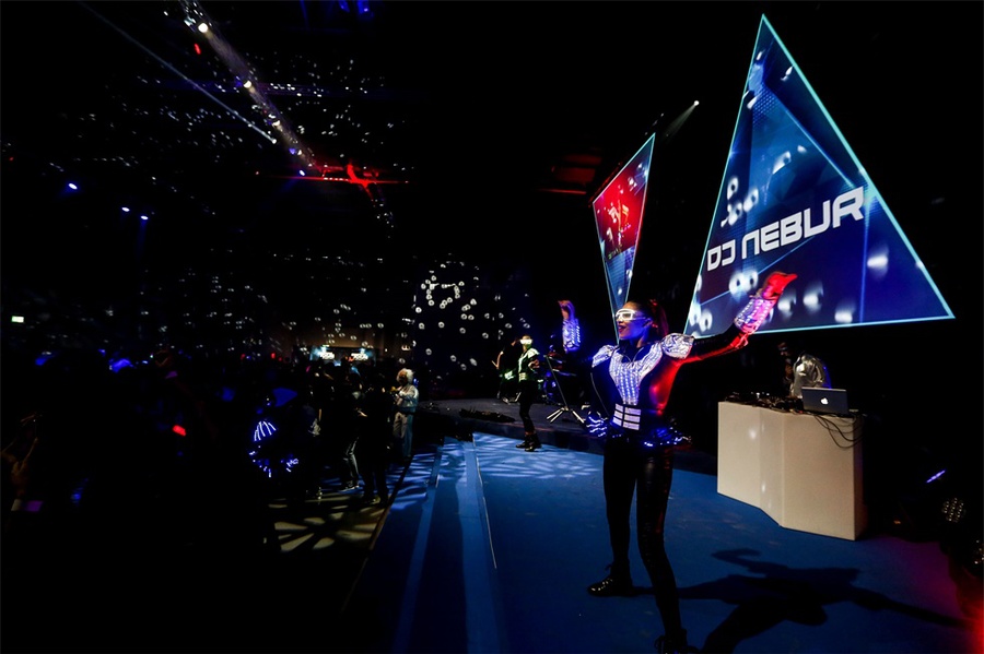 达美咖啡(Delta Cafés)的英文单词中的Delta有三角洲的意思,年会选择了一个代表未来科幻主题的员工活动,从迎宾开始到舞台搭建、服装、画面设计、视频动画素材、演出表演、活动美食都围绕科幻主题进行设计。三块三角形投影屏幕在星光幕布的映衬下,仿佛是茫茫太空中的三角洲,三角形的屏幕也暗示了达美咖啡品牌。