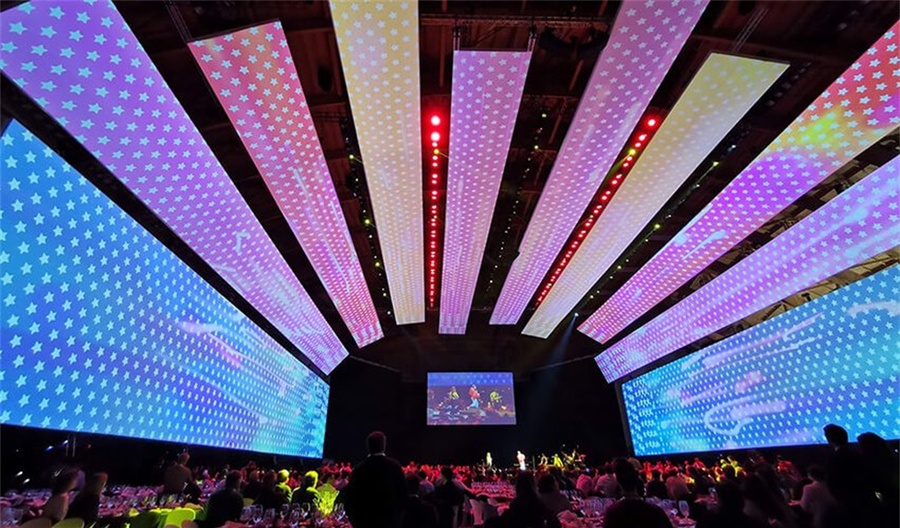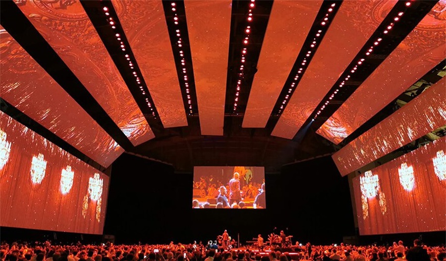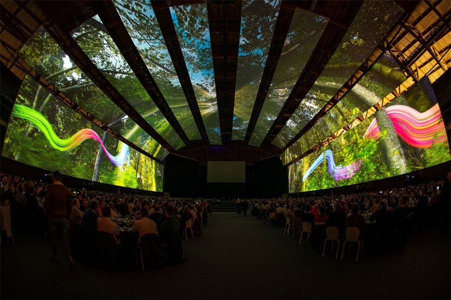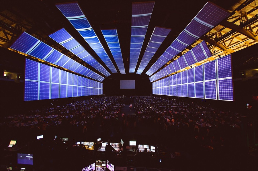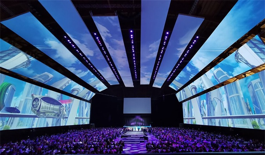 现场3240平方米的投影面积,使用了32台投影机,达到了800000流明的亮度,分辨率10800x8460px,另外还安装了600台电脑灯,2公里长的Truss架,整个舞美效果太震撼人心了。
