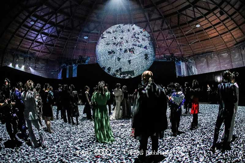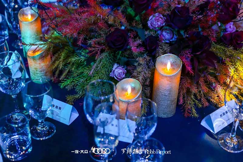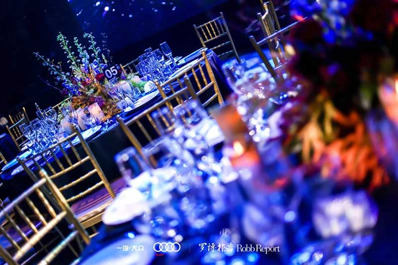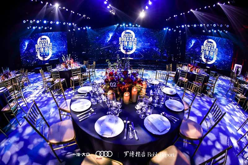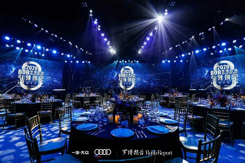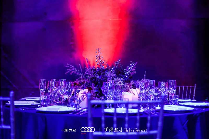 科技聚焦荣耀,艺术化身星光,洒落在盛典红毯之上,众多嘉宾沉醉在光影所打造的场景之中,纷纷留下影像,传承艺术美学,塑造品牌灵魂,悦鉴精彩生活。盛典现场以极具标准化的舞台设计,沉稳大气,融合三面立体LED屏,半开放式面向观众,打造巨型宽屏观看体验,营造TED式演讲模式,视觉体验层次丰富,科技感升级。盛典现场,素雅冷峻的灯光游走在内场处,无数的光束森林垂直而下,自由行走;圆形餐桌整齐摆放,整体格局舒适高级,配以热烈绽放的花束,起到点睛效果,释放无限的想象力,与场地融为一体。