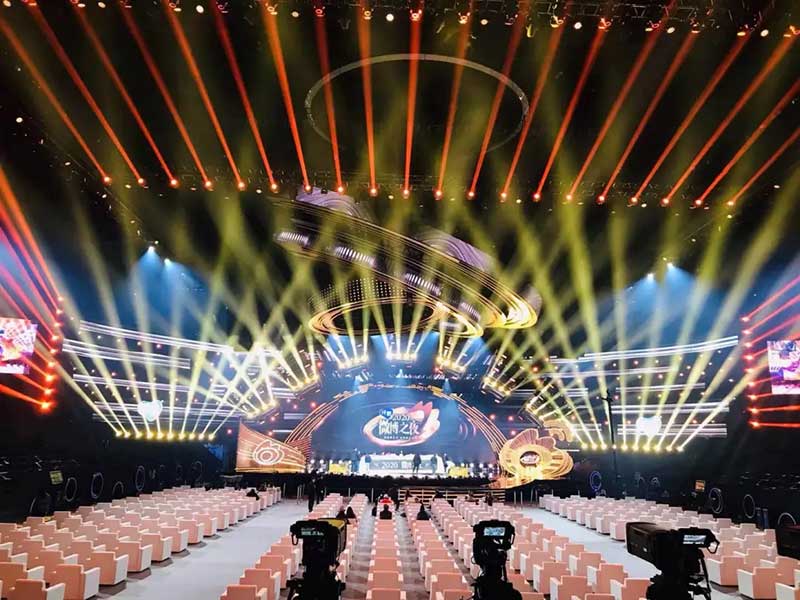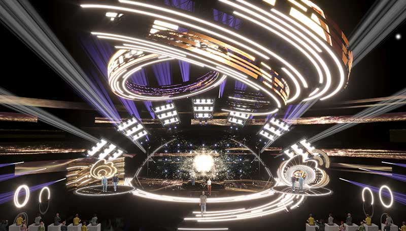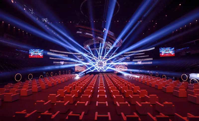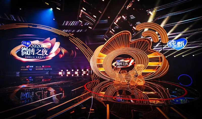 整个舞台以微博的LOGO“眼睛”为设计核心,将主舞台中央设计成眼睛和睫毛的造型,寓意“微博之眼、见证荣耀时刻”,搭配万千变化的光影,使表演嘉宾在舞台上光芒万丈。