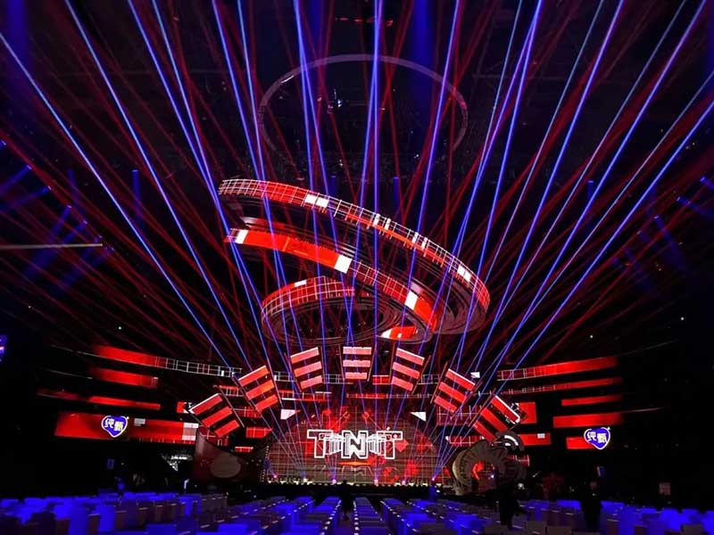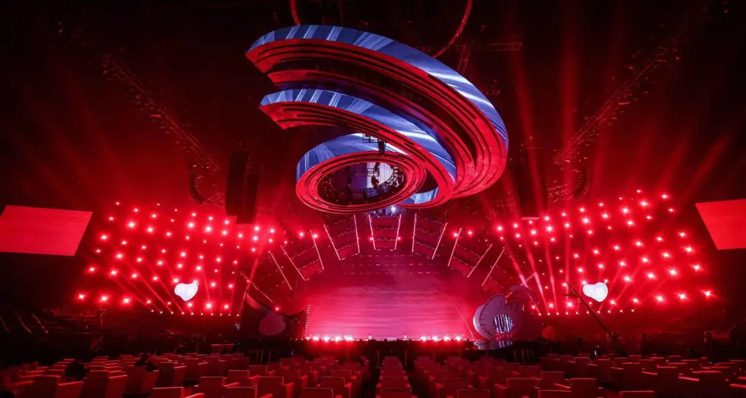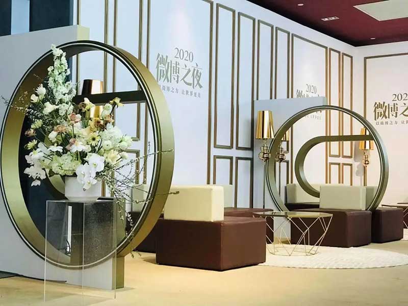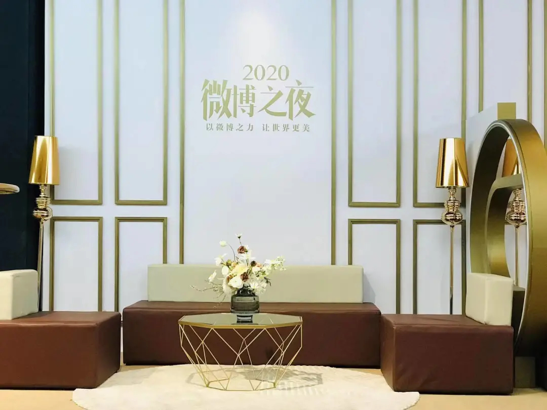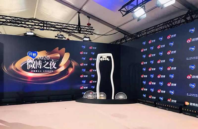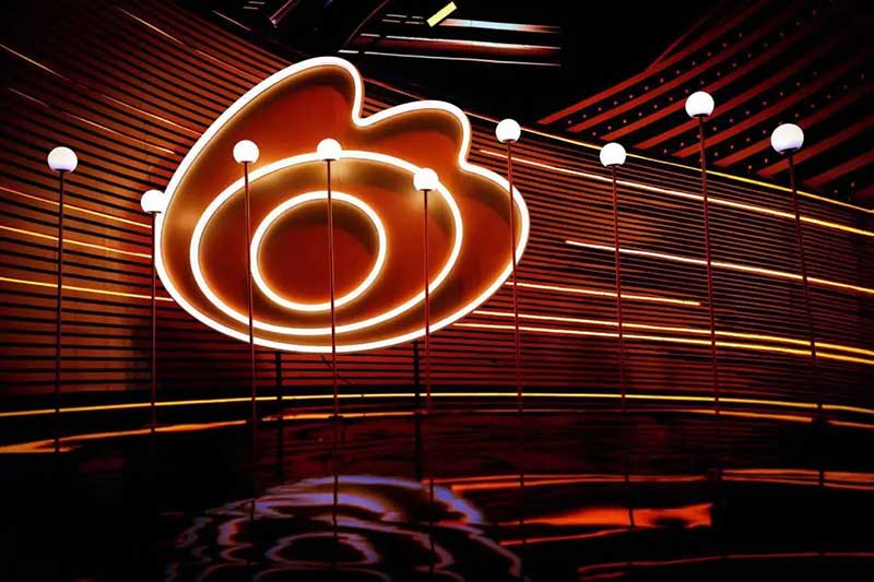 左、右两侧将微博logo直接搬上舞台,左侧区域从功能性上来说,可做副舞台之用,右侧立柱灯泡点缀,增加表演者的画面感,舞台上方立体环形设计,让观众在视觉上得到更好的舞台效果,使现场景深和层次更加丰富、多彩。