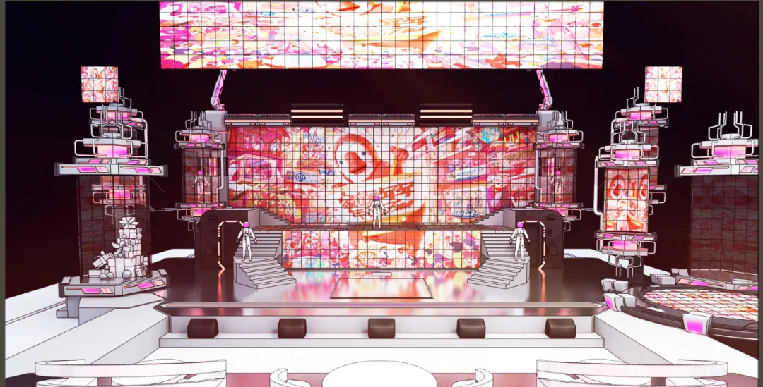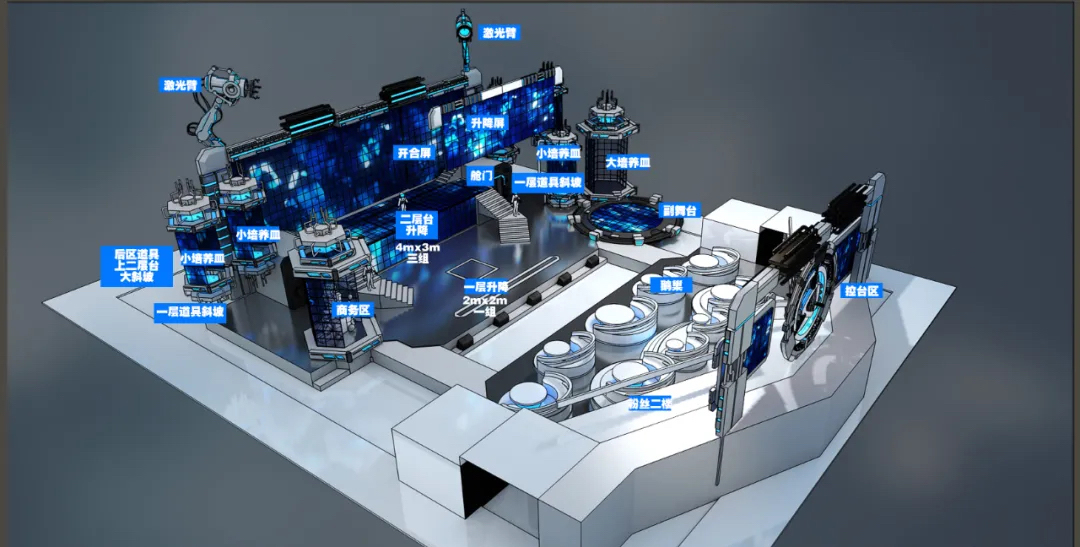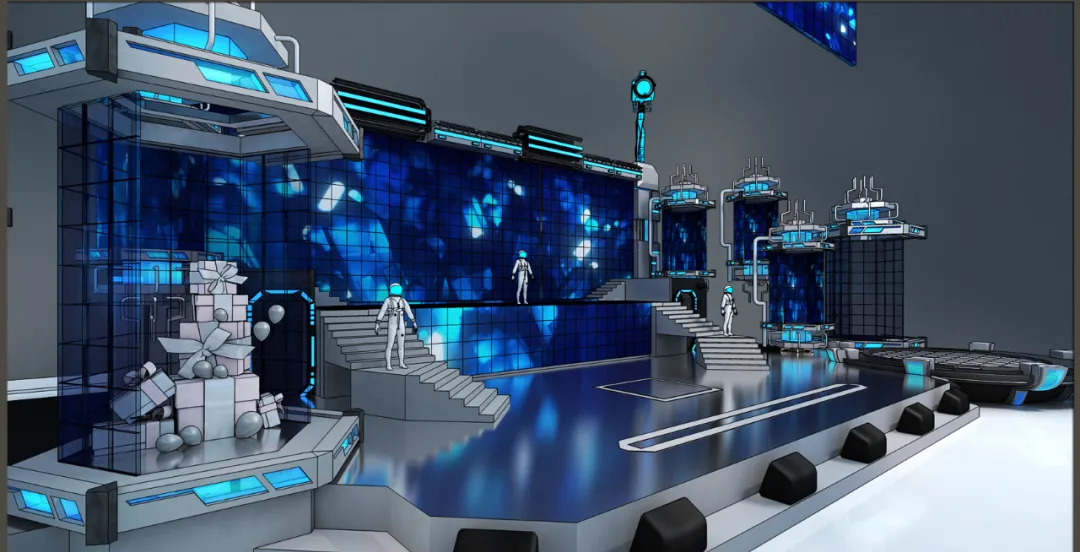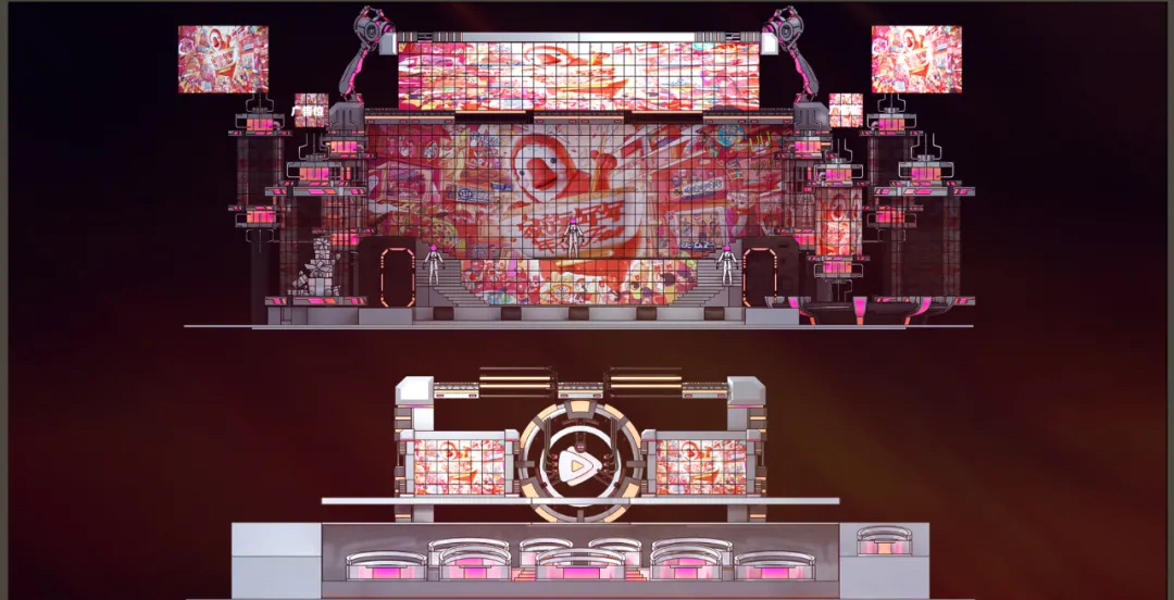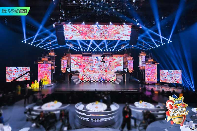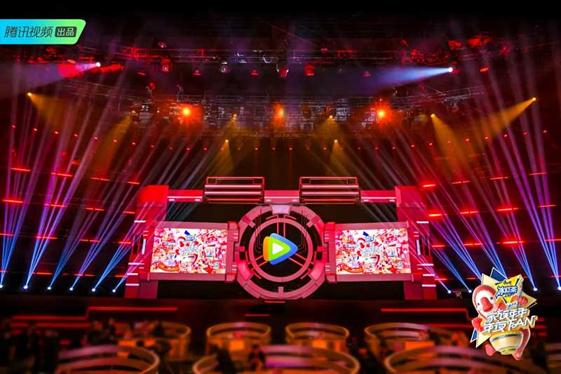 在2020年底,鹅厂奉献出了一场全新策划的内容IP家族小年夜晚会,集结了腾讯视频综艺、剧集、动漫等领域的爆款IP和话题人物,通过创意混搭的节目构思、舞台呈现和趣味互动,与大众一起在撒欢的家族氛围中,重温2020年的娱乐记忆。舞美设计的设计灵感就是鹅厂两个字,用一个科幻风的工厂场景,配合错落的培养皿,展现了腾讯视频对于一个个ip培养的一片苦心。当冰屏构件的一个个培养皿中,一个个ip形象的代表艺人出场,会引来粉丝的一片欢呼。而空中一块巨大的升降屏幕,用落下升起的过程,在完成节目的换景的刚需以后,也给人一种U盘插入接口,输入能量,完成一个ip营造的象征意义。
