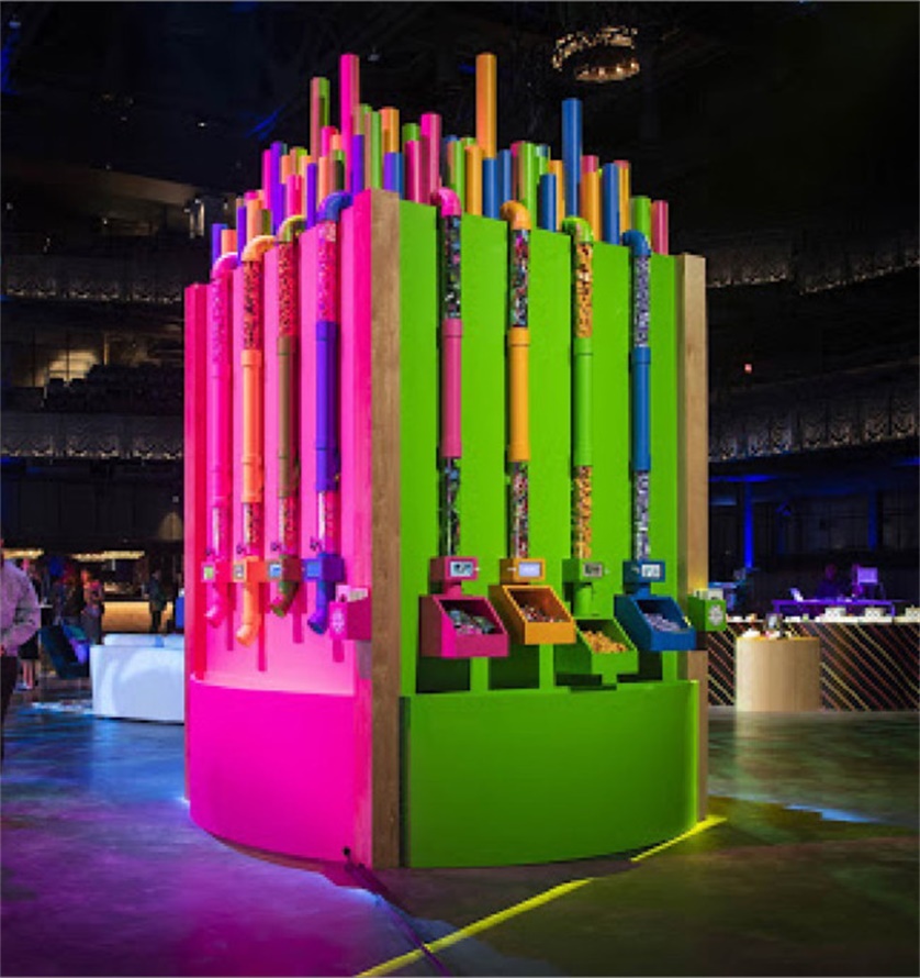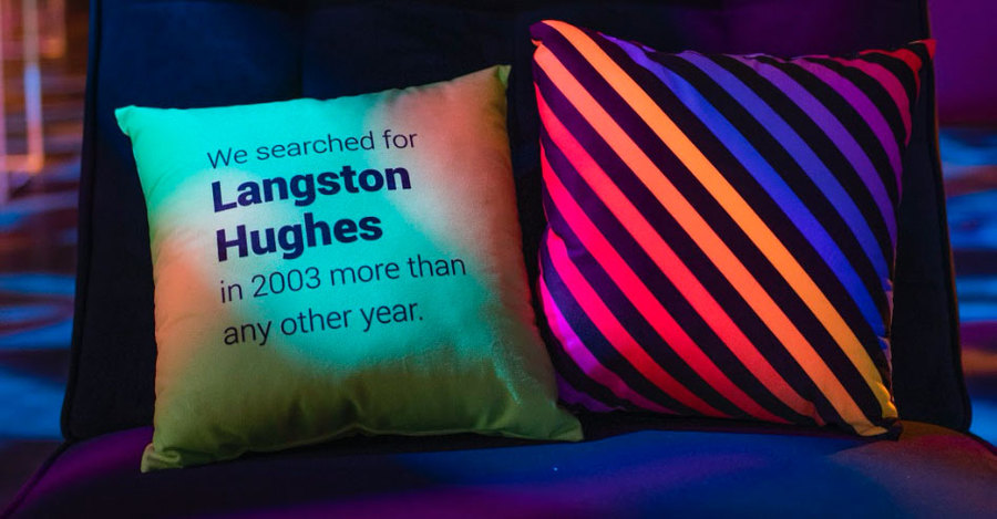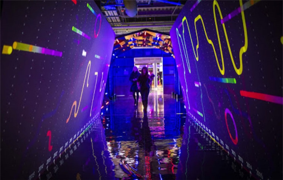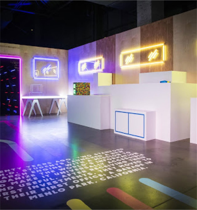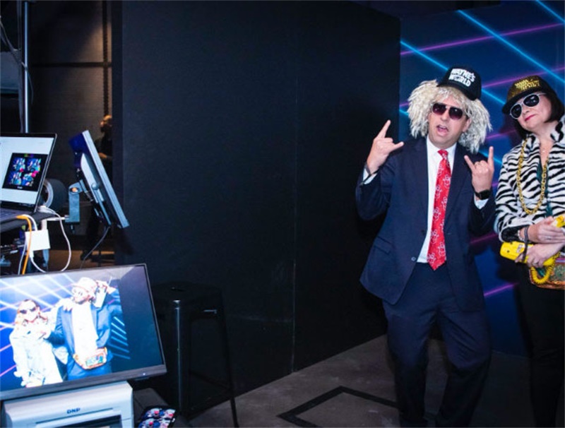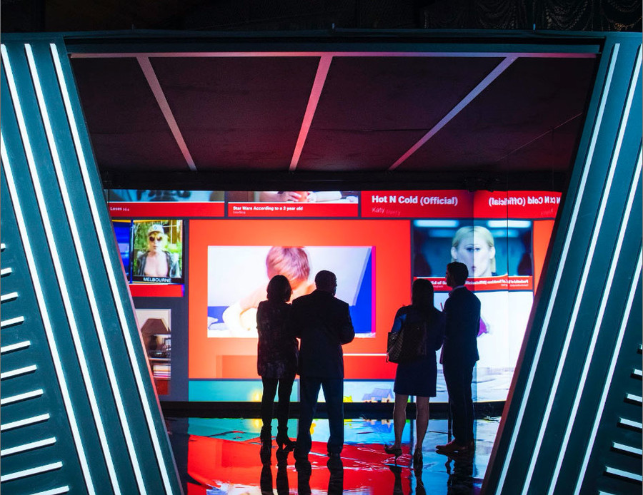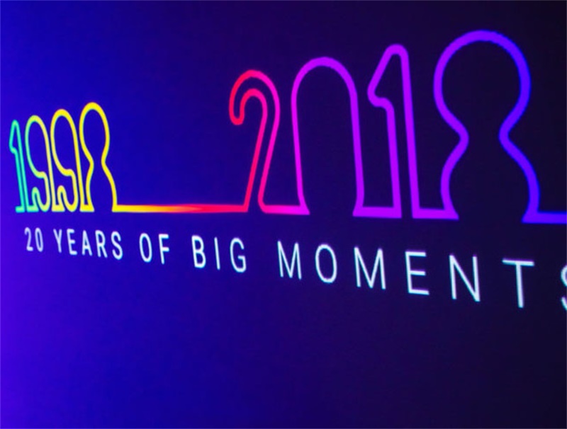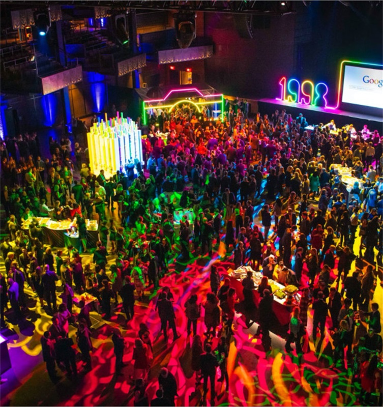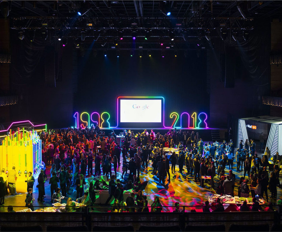 一进入活动现场,客人们就被带回到谷歌创业时的车库,里面有一个乐高玩具复制的谷歌服务器,还有一个柜台,上面有“瑞典鱼”(鱼形的耐嚼糖果),这是谷歌公司早期的一种公司零食。从车库出发,客人们通过一个投影映射的隧道,隧道里播放着过去20年谷歌搜索引擎发展的时间轴。受标志性的表情包和视频的启发,客人可以在一个巨大的糖果机前满足自己对甜食的喜爱,也可以走进YouTube音乐盒播放热门音乐视频,或者在90年代的照相亭沙龙里摆造型拍魅力照。当晚最具标志性的时刻是舞台上的视频内容,它提供了一个定制的时间轴视频,记录了谷歌搜索引擎的演变,包括字体、涂鸦和搜索功能。