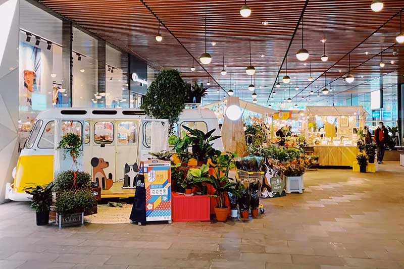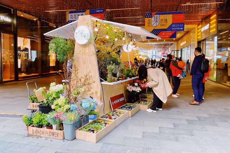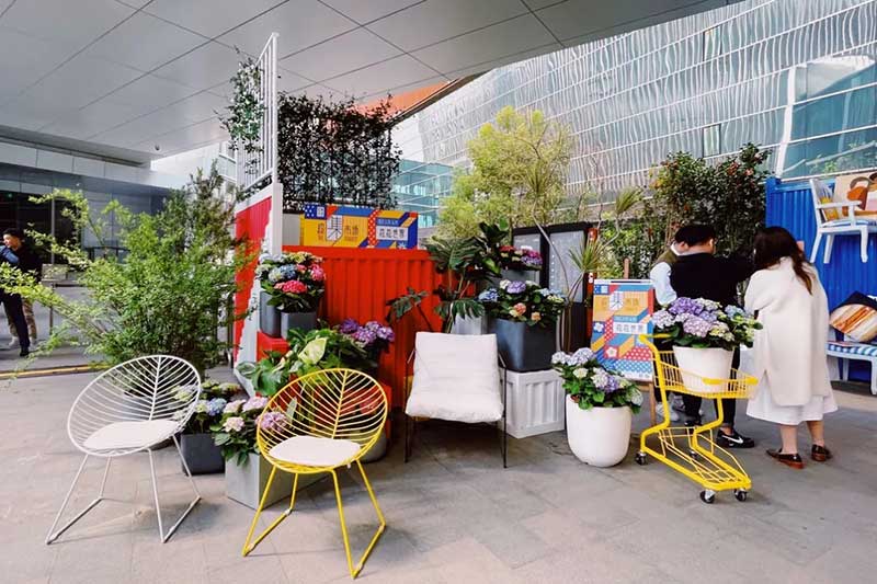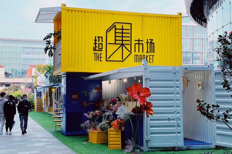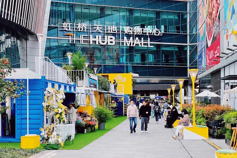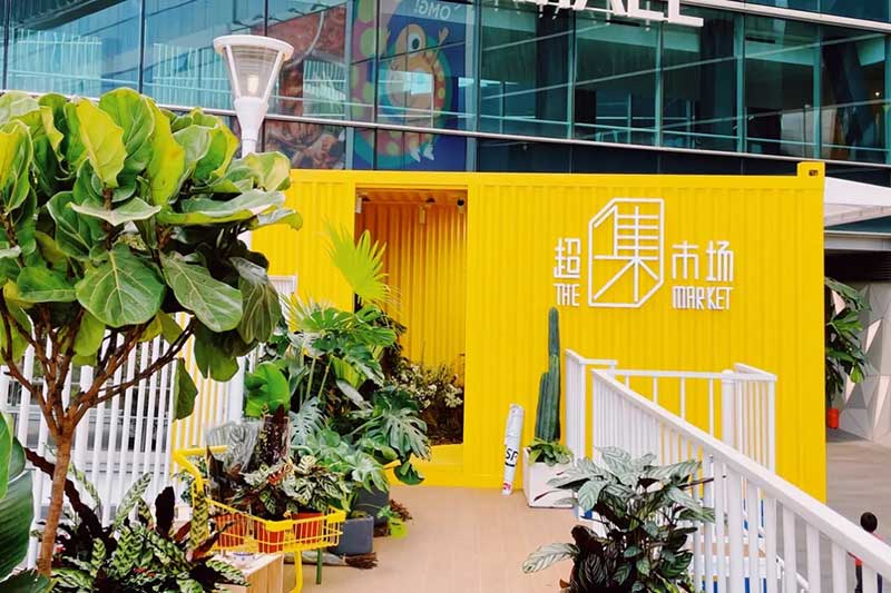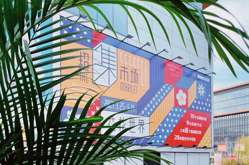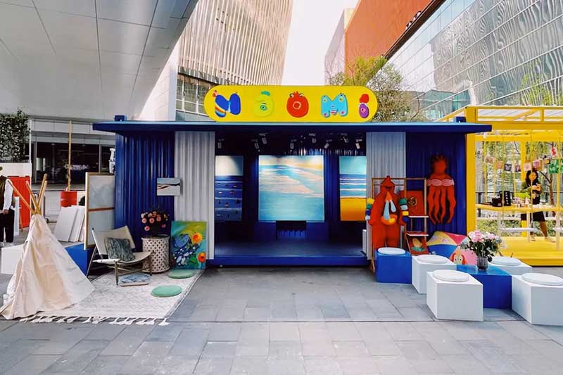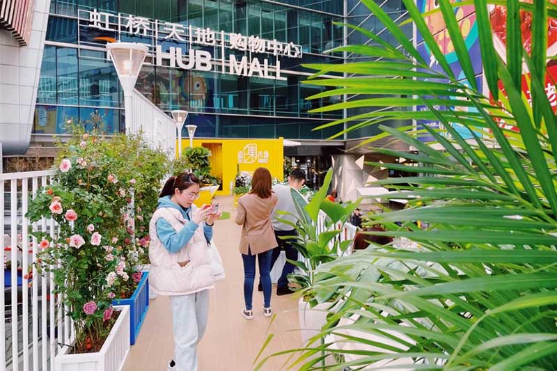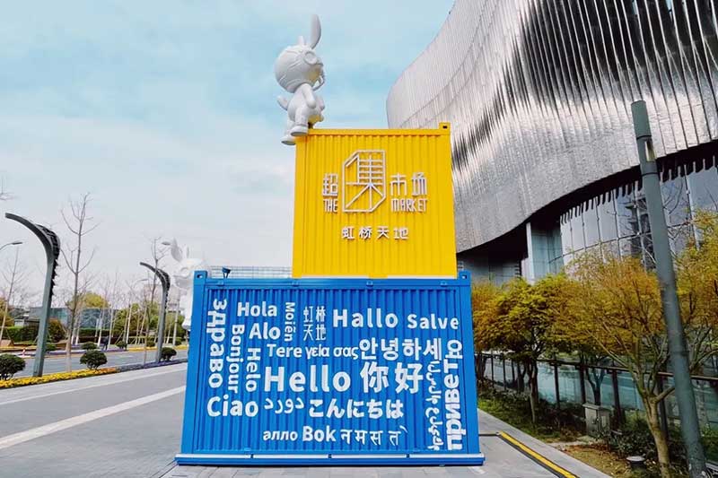 “超集市场THE MARKET”首期始于樱花烂漫开春时,因此取名为“花花世界”。超集市场选址于虹桥天地最具形象感的L1户外长廊,连绵而设的集装箱包括有10个主题快闪店,9大主题打卡地。市集入口位于商场街区核心点位,这里其实并非虹桥天地购物中心的主入口,但可能是形象展示面最好的位置之一,是出租车上下客重地,也是过往商场举办各种大型活动的开幕仪式场地,因此项目还特地设立了一个飞天小兔艺术装置“宇此出发”。商场与“宇此出发”相呼应地设立了一个双层集装箱主题装置,并植入了同款小兔,两者因此不显各自为政。