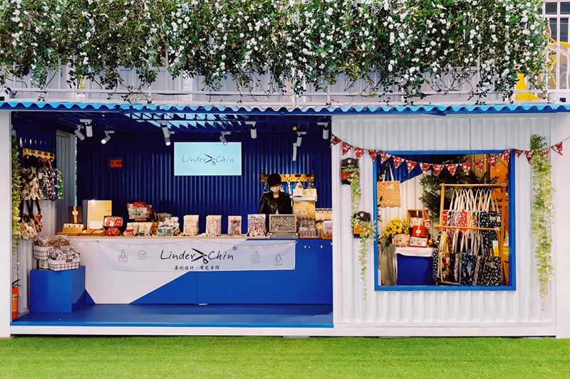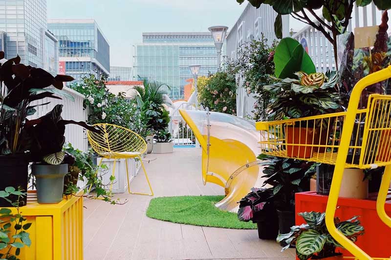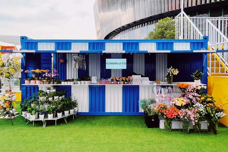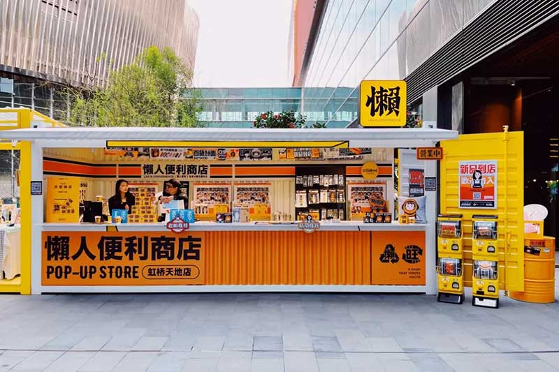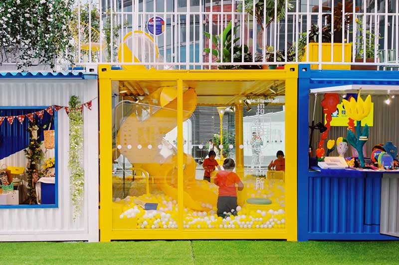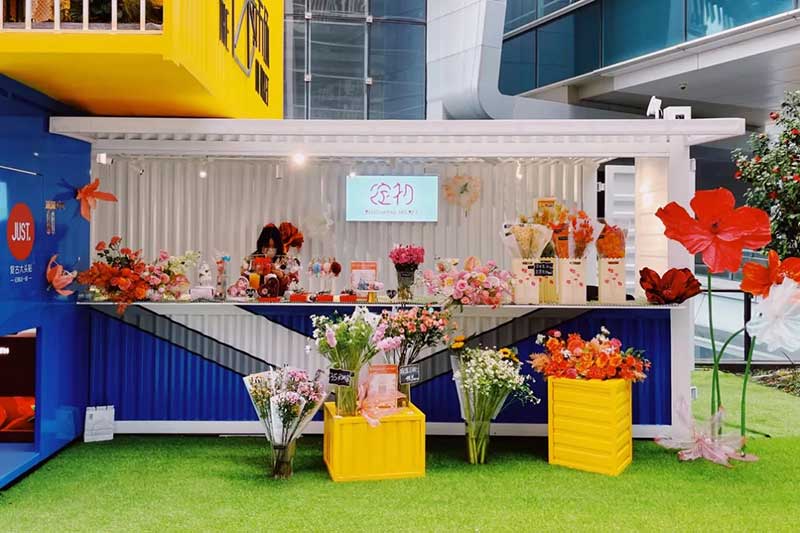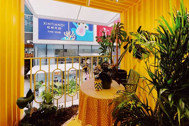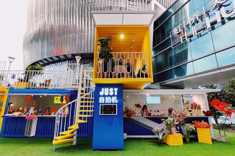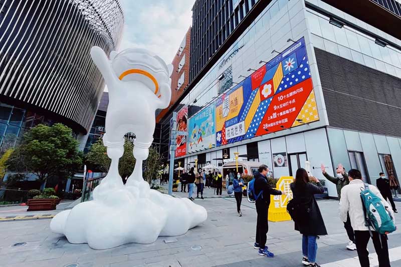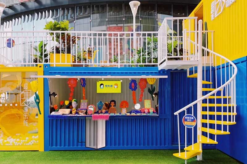“超集市场THE MARKET”首期始于樱花烂漫开春时,因此取名为“花花世界”。超集市场选址于虹桥天地最具形象感的L1户外长廊,连绵而设的集装箱包括有10个主题快闪店,9大主题打卡地。市集入口位于商场街区核心点位,这里其实并非虹桥天地购物中心的主入口,但可能是形象展示面最好的位置之一,是出租车上下客重地,也是过往商场举办各种大型活动的开幕仪式场地,因此项目还特地设立了一个飞天小兔艺术装置“宇此出发”。商场与“宇此出发”相呼应地设立了一个双层集装箱主题装置,并植入了同款小兔,两者因此不显各自为政。