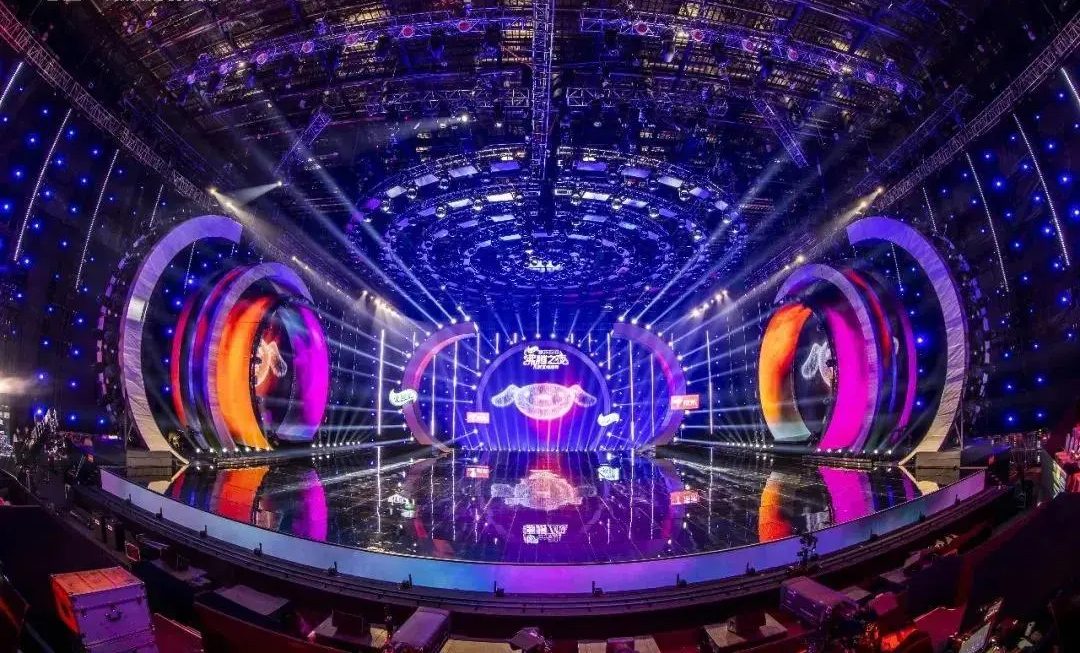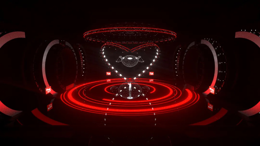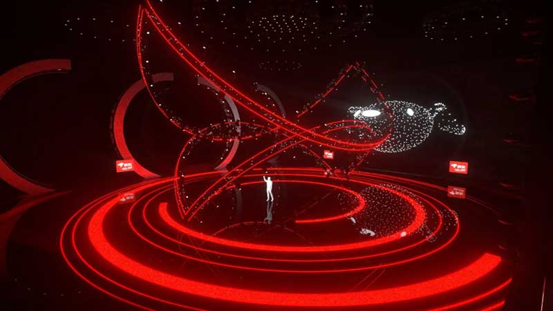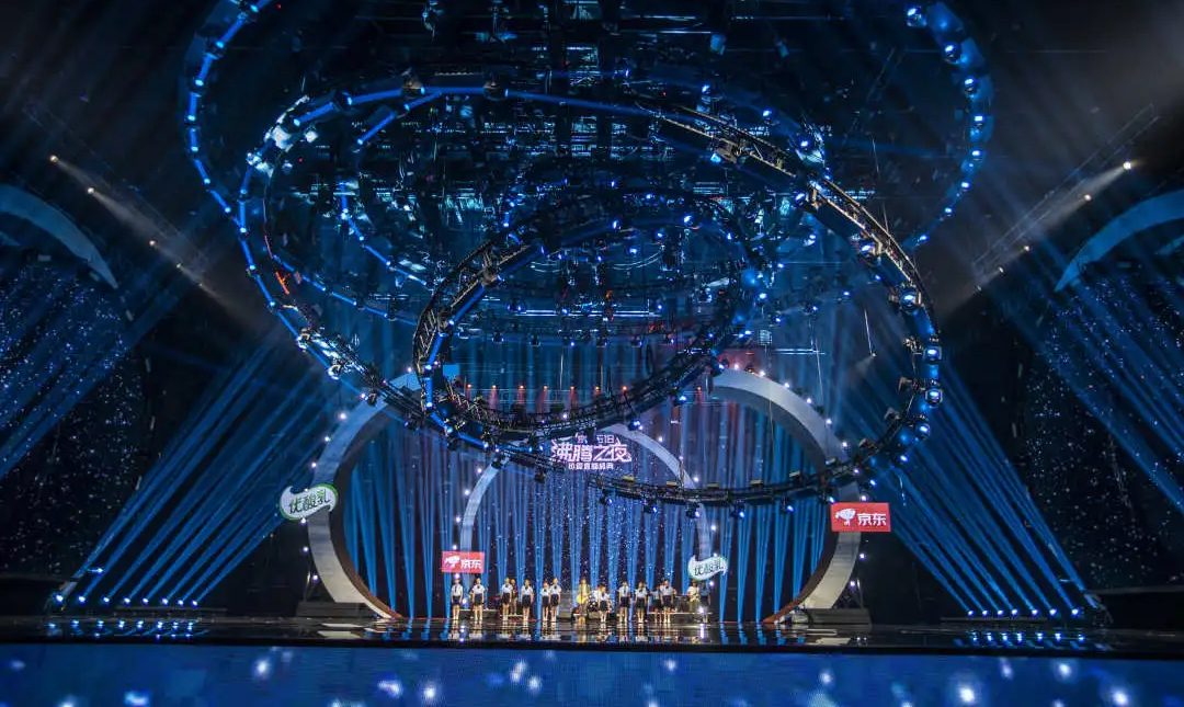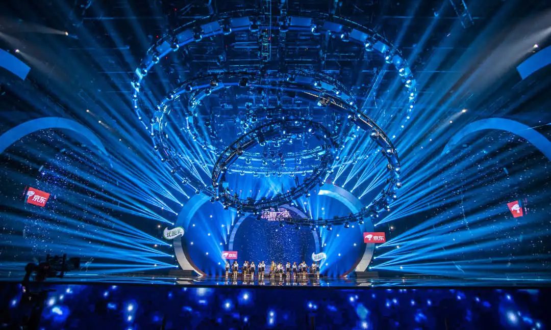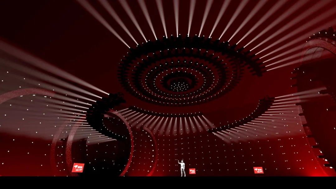 本次舞美设计开创了直播“空间馆”与主秀场联动的新模式,首创性地将舞美设计、空间设置、视觉风格进行相互联动。映入眼帘的表演主舞台由一块近900㎡的超大地屏组成,内置8组升降组合,可配合表演形成千变万化的地面影像和灵活多变的立体空间。舞美方案则以“圆形”为基本元素进行设计整合,引用圆形的不同形态组成的不同空间,用极大的包容感和无限的可能性,承载来自各个区域阶层的希望与梦想。旨在用视觉感官,打破边界,把“消除舞台”的概念与“沸腾”的舞台效果相结合,打造出不同维度的视觉空间体验。整体设计也以首尾相接的形态单纯而直接地传递出“圆满”、“幸福”、“满足”等美好信息。舞台上圆形被解构成4组弧形机械装置,在这些机械装置上通过技术手段有机整合进透明屏幕、灯具等设备,巧妙结合机械移动和旋转,为表演带来无限的可能。全域舞台数控系统吊装11组圆形和弧形装置,在升降和翻转之外,还可以将一个整圆一分为二甚至一分为四,再次进行独立的升降和角度变化。这种对吊装圆形元素极致的使用方式,配合表演呈现出悬浮光束、空中爱心、沸腾之翼的图形重组,在表演过程中带来更多震撼的视觉效果。其中舞台上不同大小、不同运动方式、不同表演功能的圆形机械结构,也代表着的不同文化层级维度,构成了多领域丰富多彩的世界。而界、域之间的突破和共融也为舞台带来了无限的生机和无穷的可能性。此次舞美通过了极致丰富的变化,配合表演完成了象征着各个维度的视觉呈现,以“沸腾”的舞台效果表现出在不同领域中,无论多远的地方,都有京东陪伴!