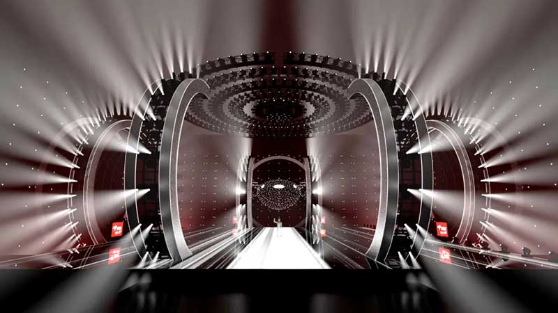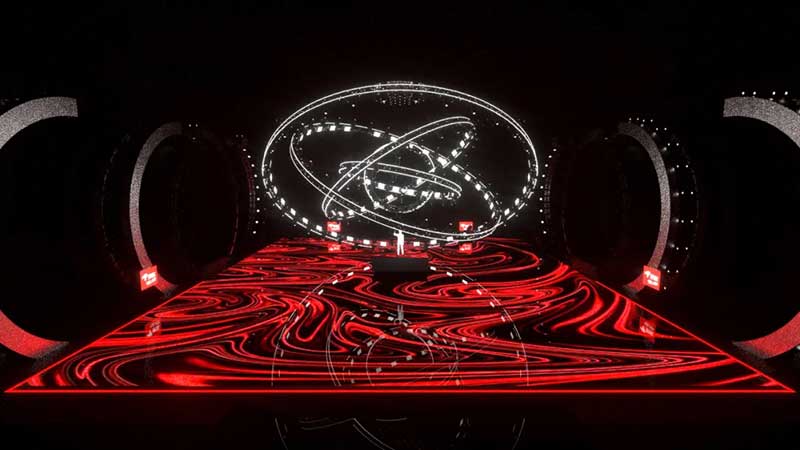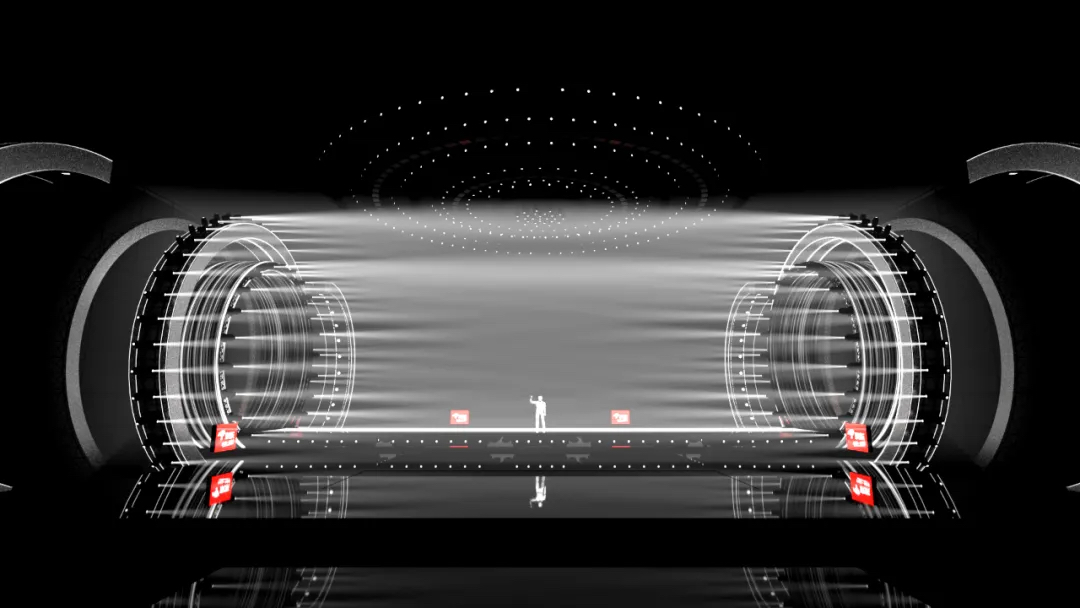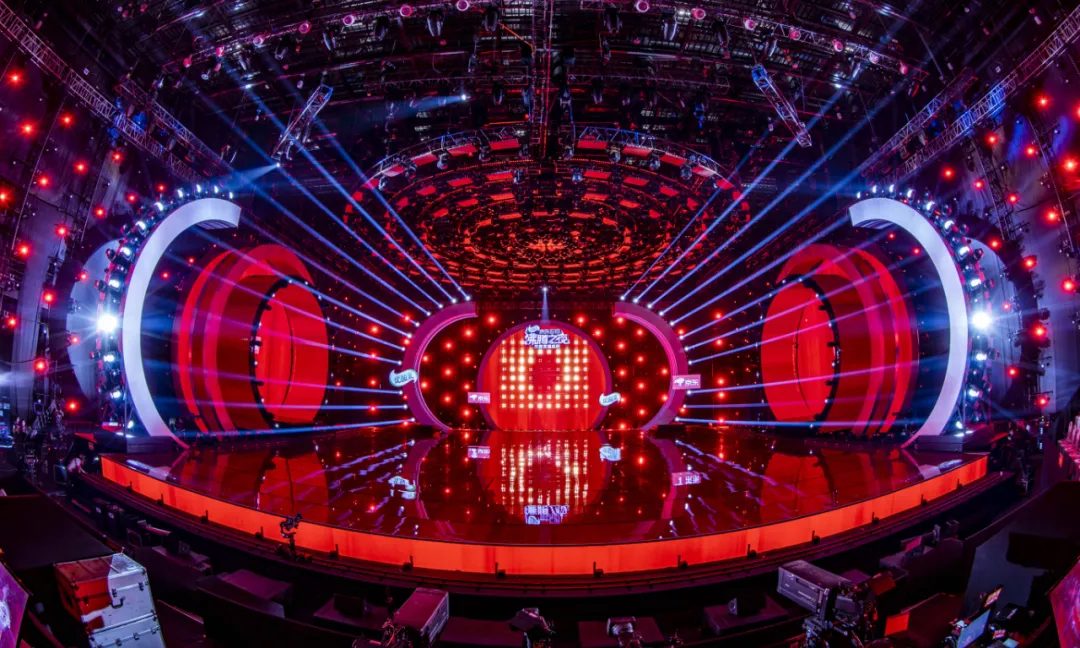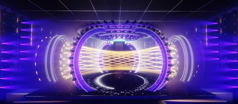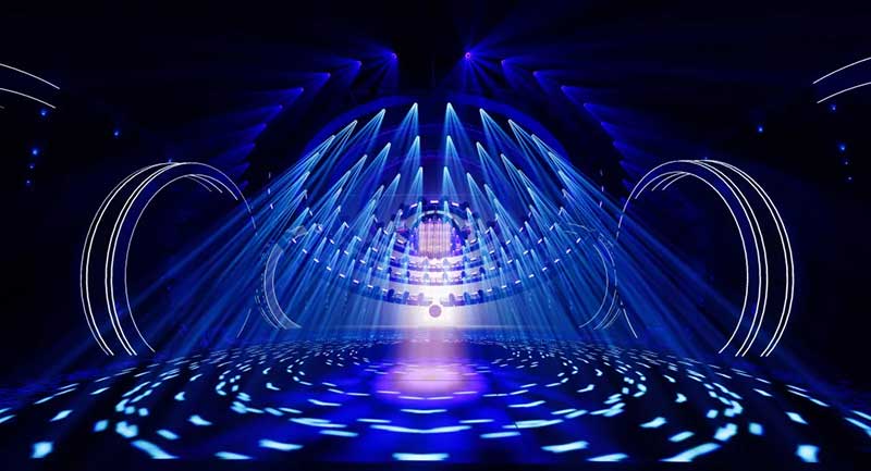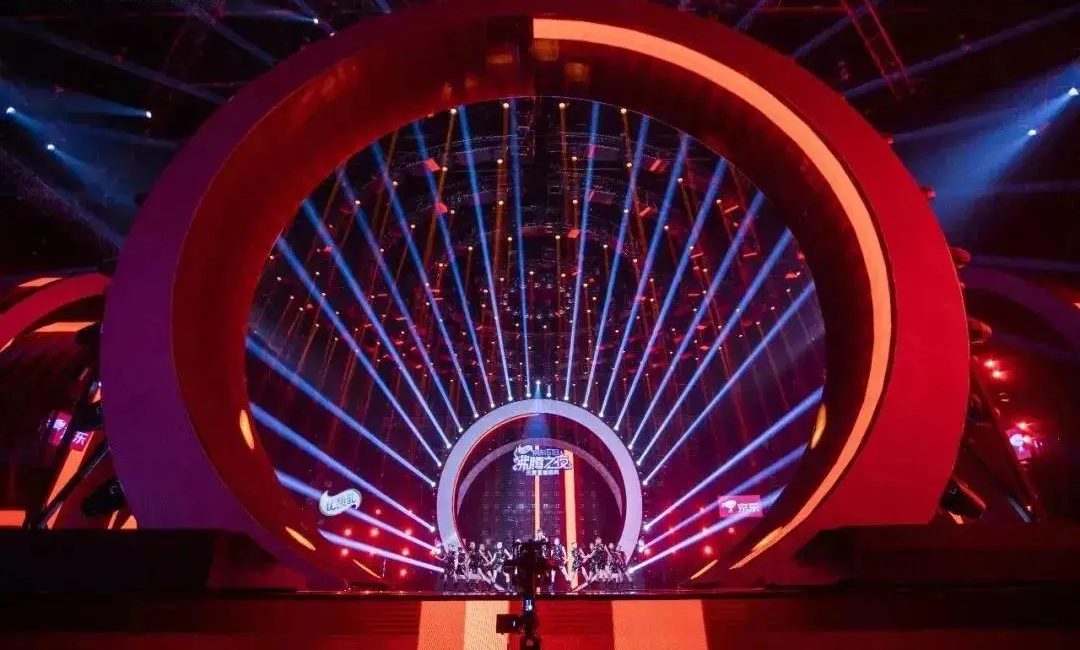 本次舞美设计开创了直播“空间馆”与主秀场联动的新模式,首创性地将舞美设计、空间设置、视觉风格进行相互联动。映入眼帘的表演主舞台由一块近900㎡的超大地屏组成,内置8组升降组合,可配合表演形成千变万化的地面影像和灵活多变的立体空间。舞美方案则以“圆形”为基本元素进行设计整合,引用圆形的不同形态组成的不同空间,用极大的包容感和无限的可能性,承载来自各个区域阶层的希望与梦想。旨在用视觉感官,打破边界,把“消除舞台”的概念与“沸腾”的舞台效果相结合,打造出不同维度的视觉空间体验。整体设计也以首尾相接的形态单纯而直接地传递出“圆满”、“幸福”、“满足”等美好信息。舞台上圆形被解构成4组弧形机械装置,在这些机械装置上通过技术手段有机整合进透明屏幕、灯具等设备,巧妙结合机械移动和旋转,为表演带来无限的可能。全域舞台数控系统吊装11组圆形和弧形装置,在升降和翻转之外,还可以将一个整圆一分为二甚至一分为四,再次进行独立的升降和角度变化。这种对吊装圆形元素极致的使用方式,配合表演呈现出悬浮光束、空中爱心、沸腾之翼的图形重组,在表演过程中带来更多震撼的视觉效果。其中舞台上不同大小、不同运动方式、不同表演功能的圆形机械结构,也代表着的不同文化层级维度,构成了多领域丰富多彩的世界。而界、域之间的突破和共融也为舞台带来了无限的生机和无穷的可能性。此次舞美通过了极致丰富的变化,配合表演完成了象征着各个维度的视觉呈现,以“沸腾”的舞台效果表现出在不同领域中,无论多远的地方,都有京东陪伴!
