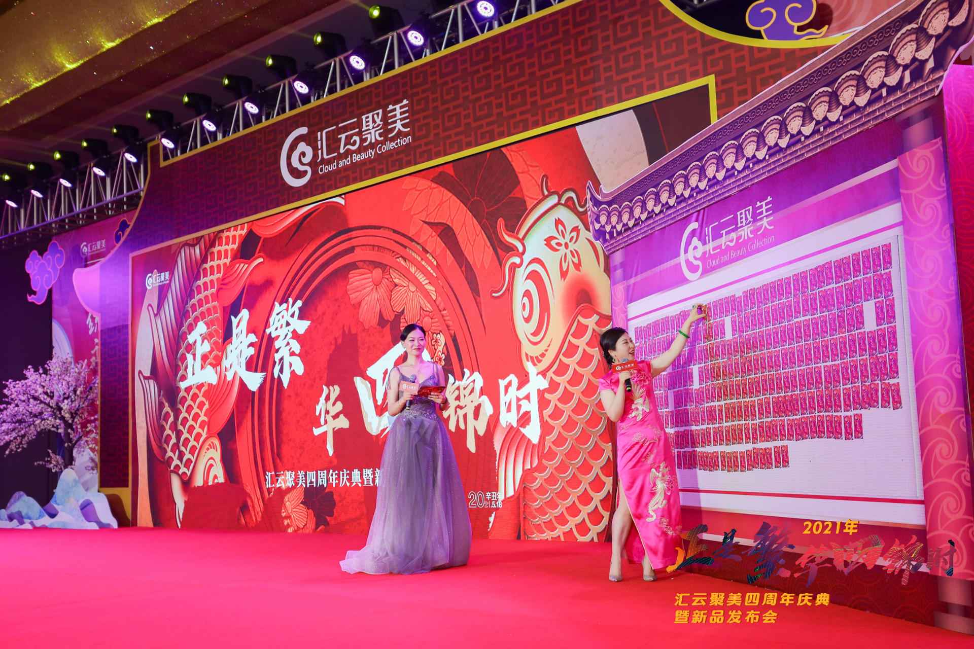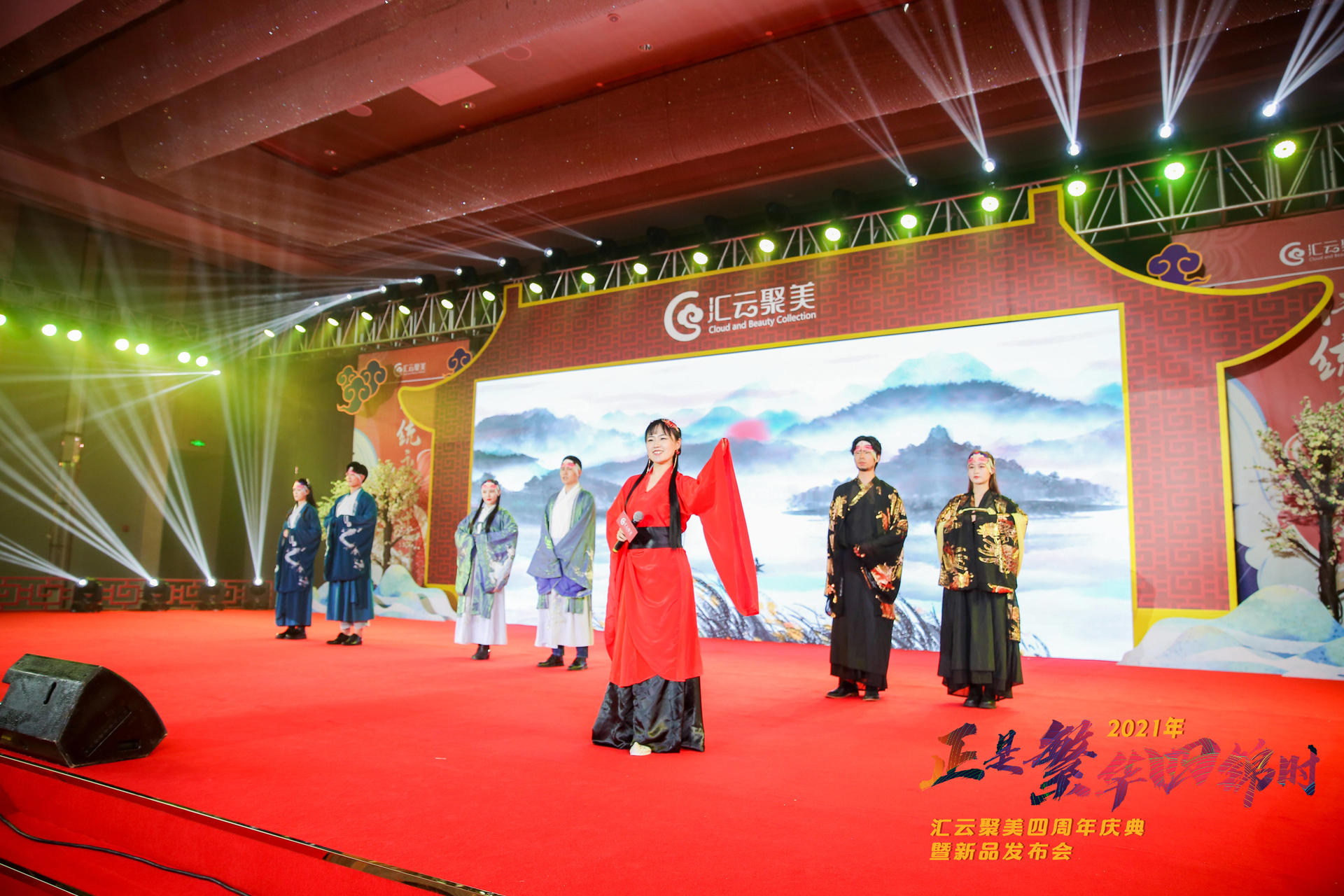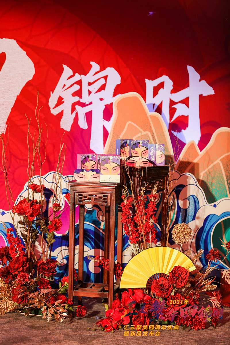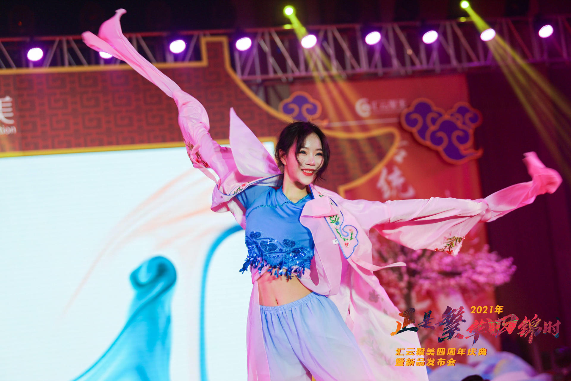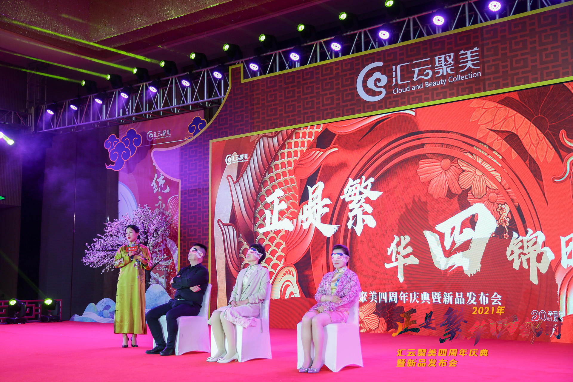 汇云聚美品牌四周年庆典暨新品发布会以“正是繁华四锦时”为主题,寓意汇云聚美成立四周年的盛景,并将在未来的赛道上继续砥砺前行,闪耀璀璨。本次四周年庆典,汇云聚美将电影殿堂级的置景搬进了现场,大量中国风的陈设布置在红毯和舞台周边。开场节目古风墨舞,婉若游龙的表演,惊艳了全场,更惊艳了观看直播观众;舞蹈演员一袭纱衣,轻歌曼舞,成为多少人心中的白月光,举手投足间,无不散发出古风和古韵。