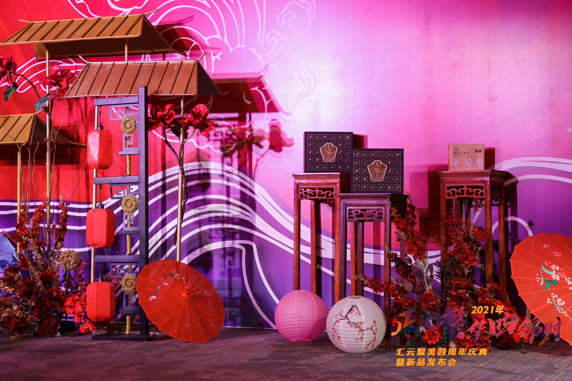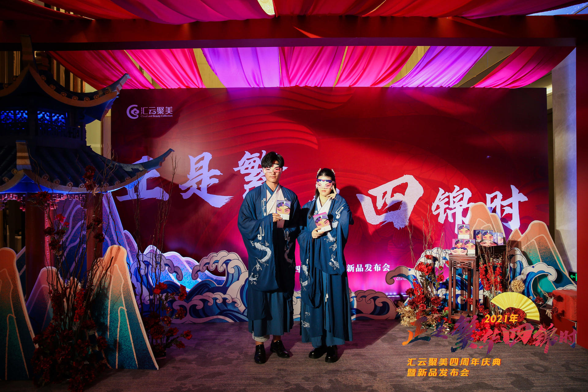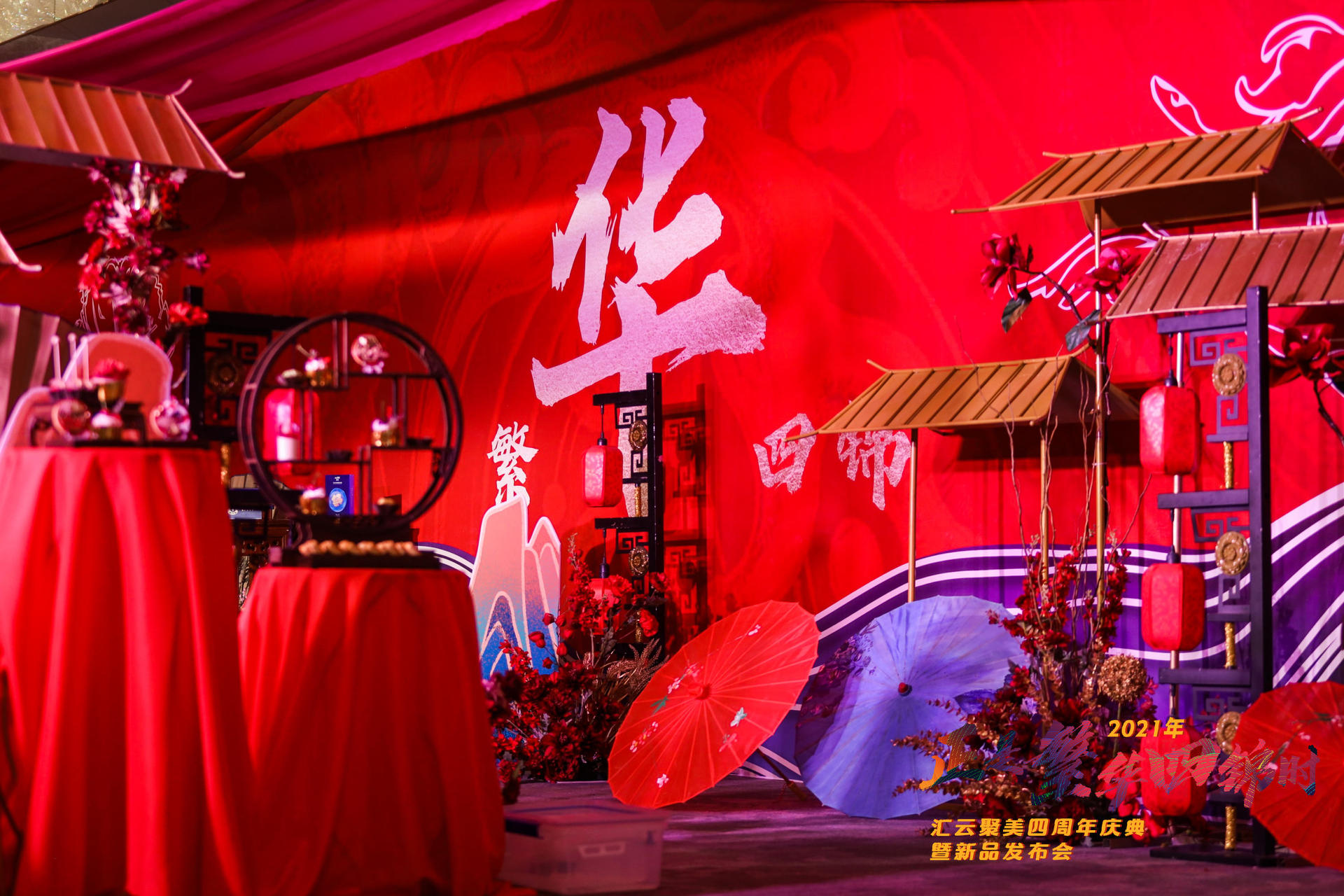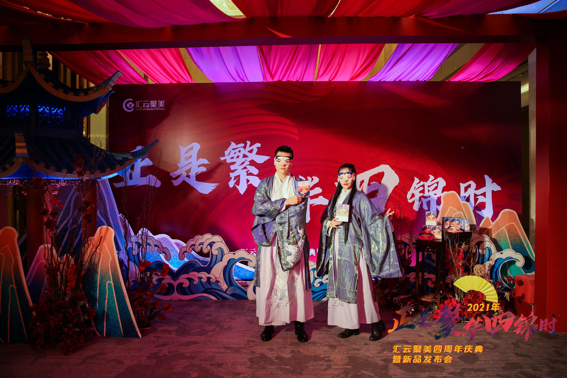 汇云聚美品牌四周年庆典暨新品发布会以“正是繁华四锦时”为主题,寓意汇云聚美成立四周年的盛景,并将在未来的赛道上继续砥砺前行,闪耀璀璨。本次四周年庆典,汇云聚美将电影殿堂级的置景搬进了现场,大量中国风的陈设布置在红毯和舞台周边。开场节目古风墨舞,婉若游龙的表演,惊艳了全场,更惊艳了观看直播观众;舞蹈演员一袭纱衣,轻歌曼舞,成为多少人心中的白月光,举手投足间,无不散发出古风和古韵。