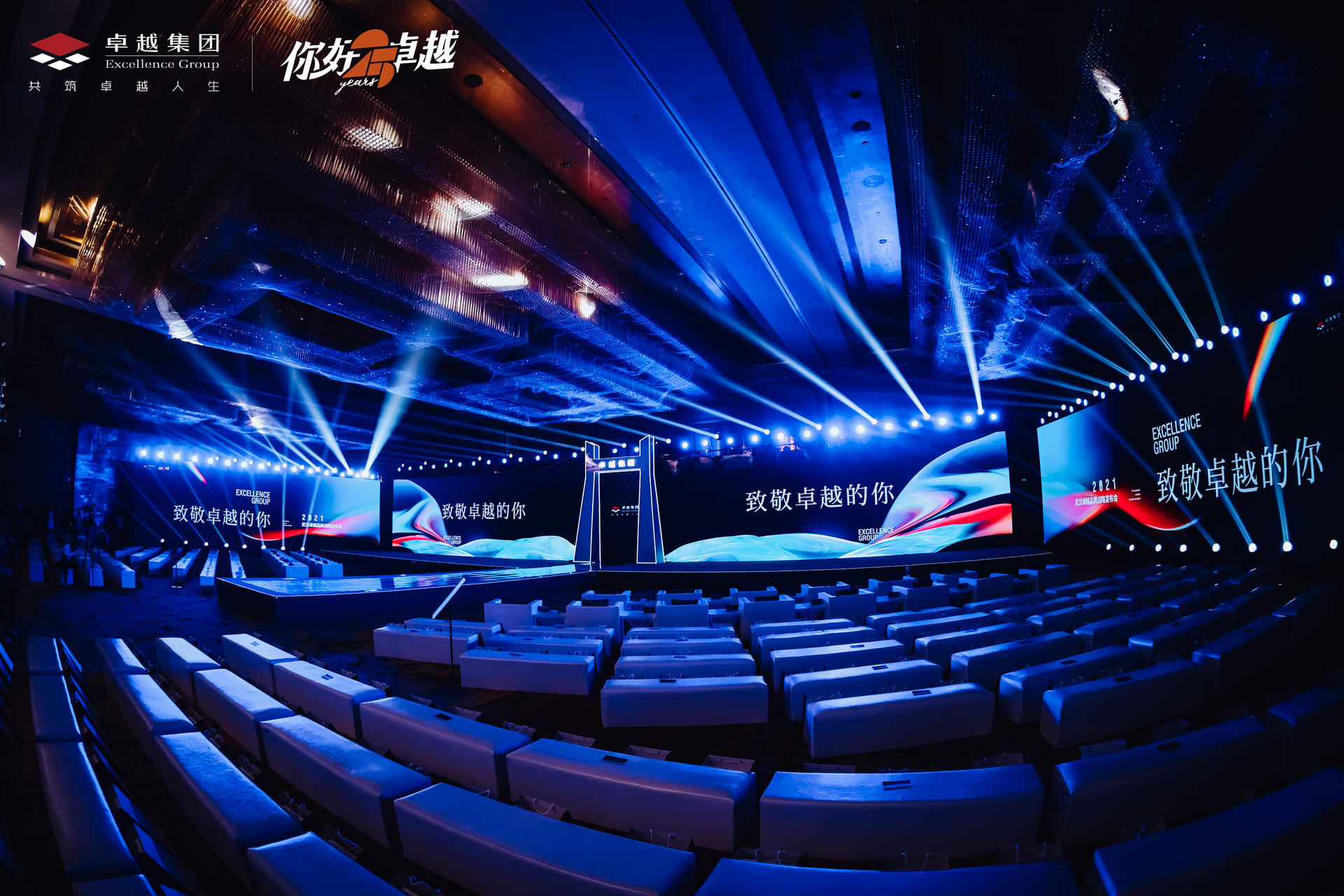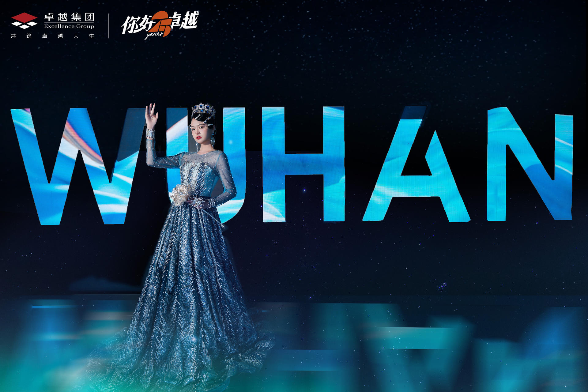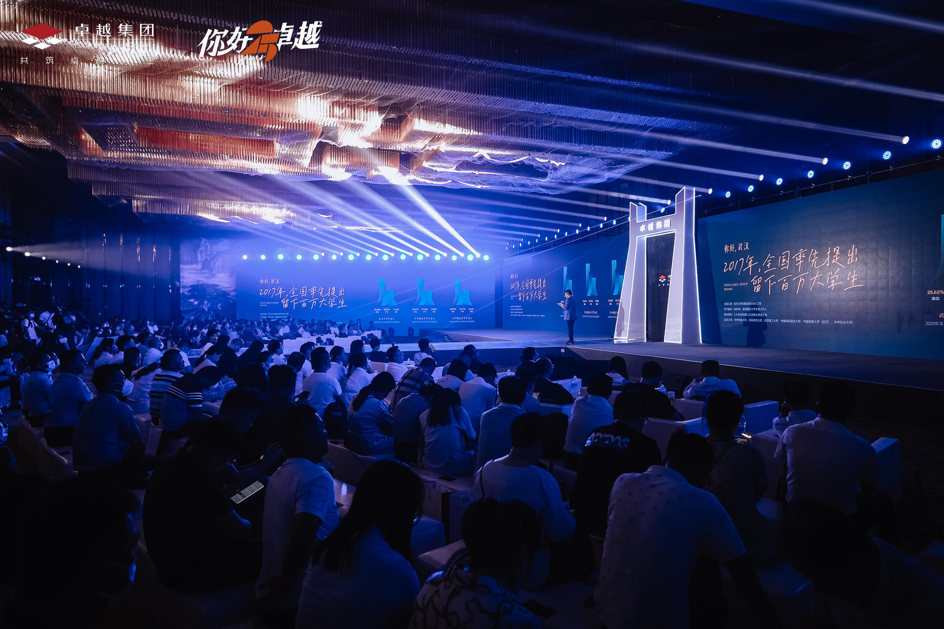 致敬卓越的你—— 2021卓越武汉品牌战略发布会于武汉富力威斯汀酒店宴会厅震撼启幕,以一场视听盛宴,宴邀全城致敬城市荣耀。这场艺术与人文交织、建筑与城市对话的璀璨盛会,恢弘开篇!正如卓越的布局战略沿长江而行,为此发布会的开场舞也以 ” 水 ” 相呼应,水幕遮天的舞台效果、人屏互动的水世界舞蹈、演绎品牌内涵的 3D 特效,让观众直观感受到震撼大气的场面,行云流水般的表演,象征着生机勃勃的姿态直面江城荆楚文明的浪潮,更启迪着全场宾客对未来生活景象的美好共鸣。