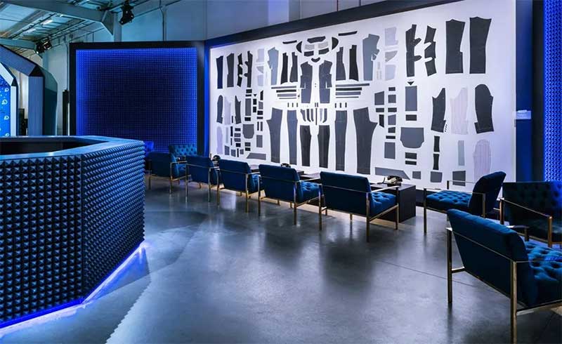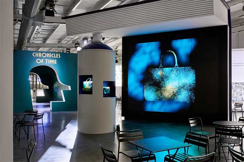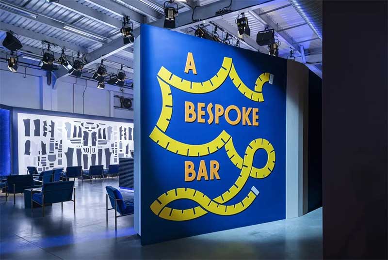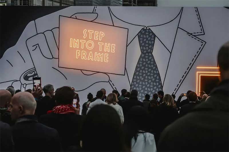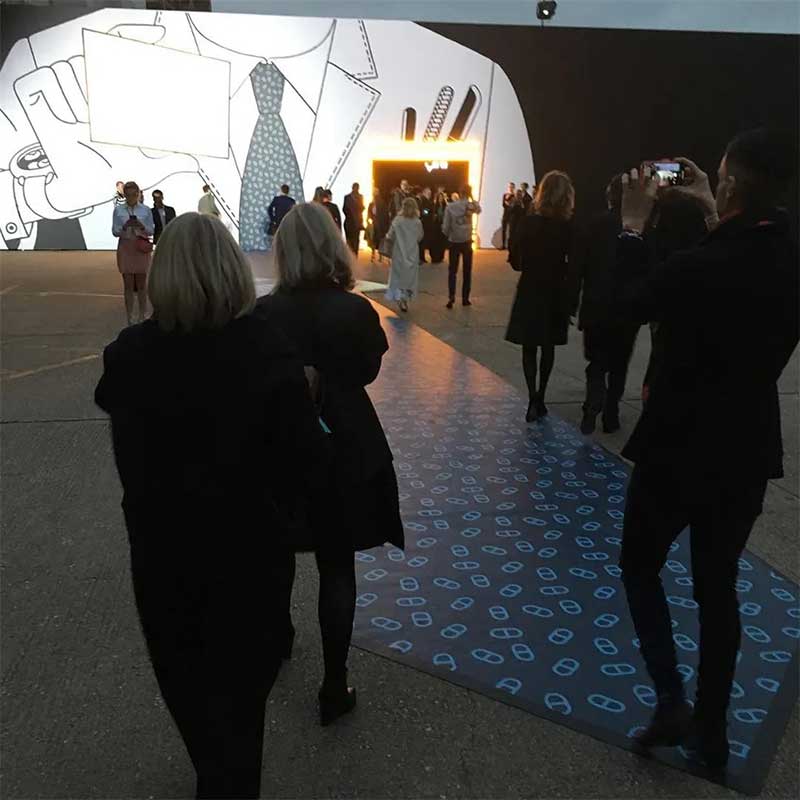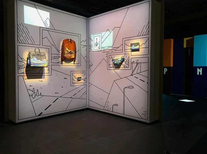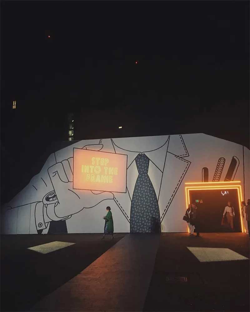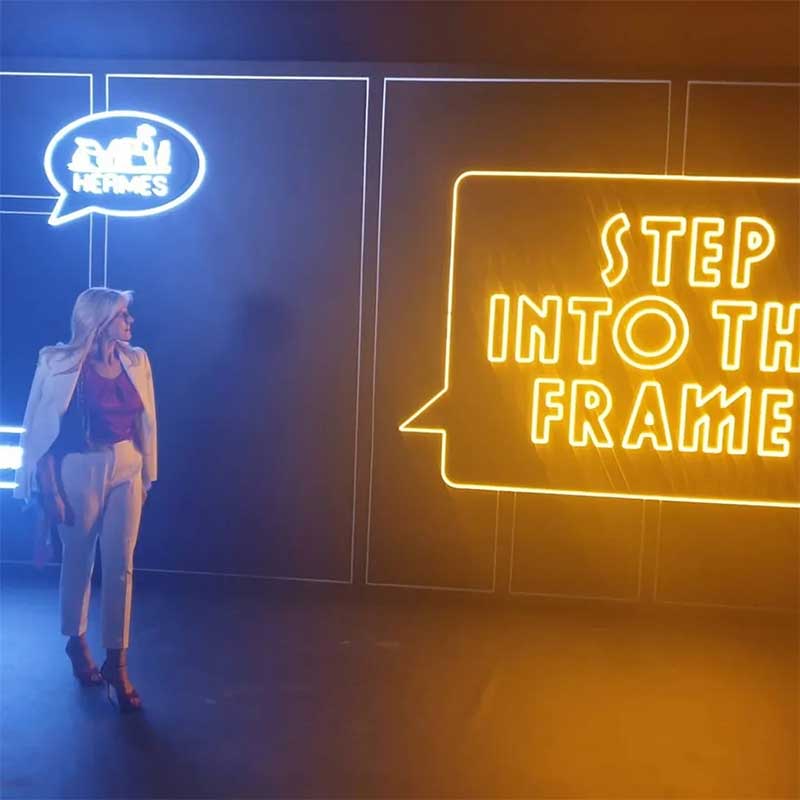 这场沉浸式活动充满创意,完全原创,绝对是以Instagram(社交平台)为代表的自媒体时代而设计,活动现场入口处是一条长长的“蓝色领带地毯”迎接客人的到来。活动被恰如其分地命名为“漫绘梦境”,踏入活动现场就像进入了一本漫画书。客人们必须穿过一个被霓虹灯照亮的通道,接着会会看到一些图形元素,比如一本巨大的书,上面有爱马仕的配件产品跳出页面,还有其他一些动态显示。一个充满霓虹灯的走廊将客人们带进了一个以爱马仕(Hermés)的历史为基础的世界,在这里,客人们将享受到独特而不同的夜晚。