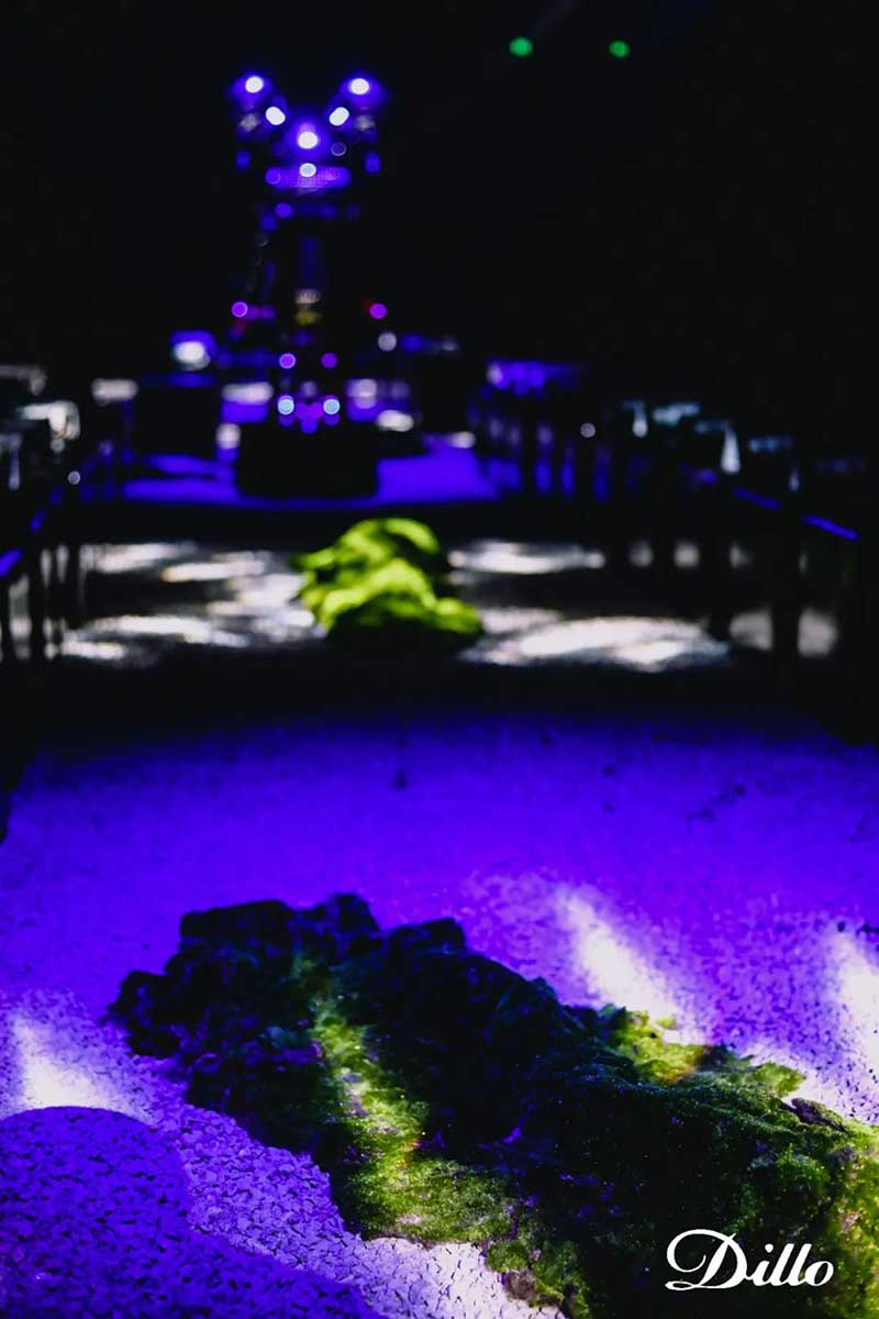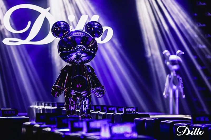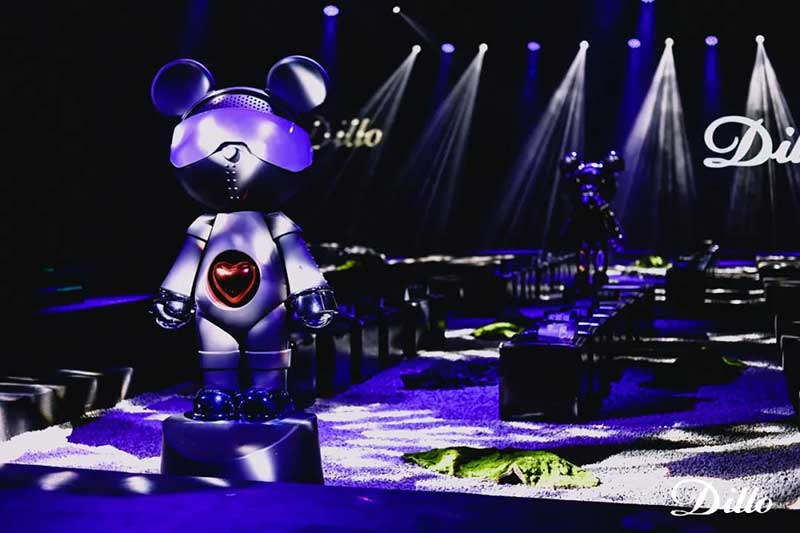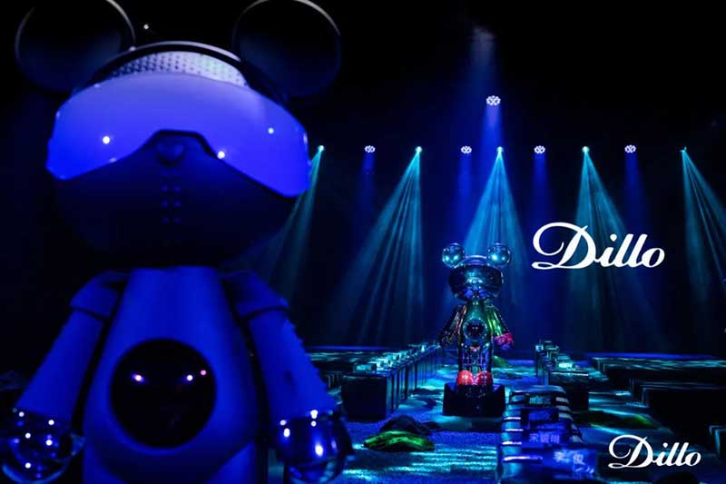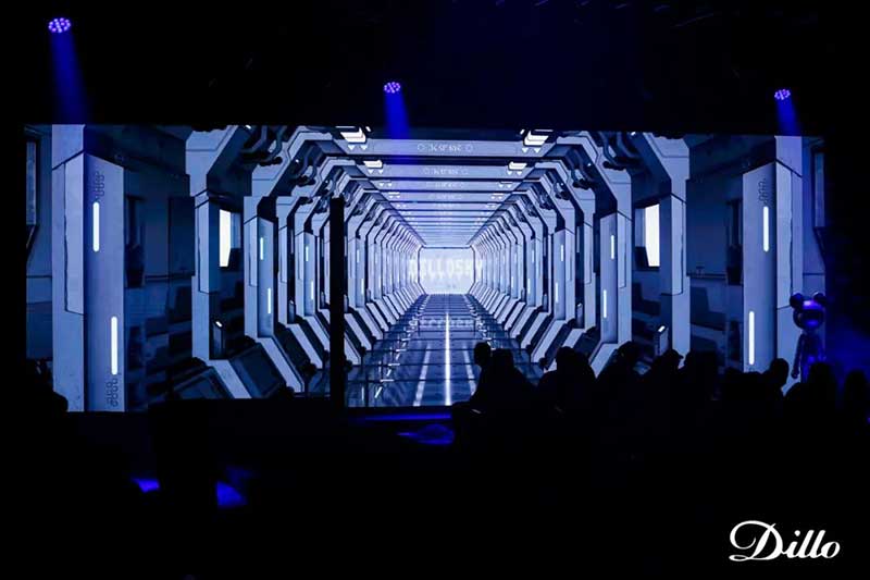 本次大秀一共展出了DILLO的经典、高街运动和星际熊三大系列。在现场使用大屏视频的动效——舱门的开启来切换串联各系列走秀,并且利用大屏和音效来增加现场的沉浸感,让现场的嘉宾和观众可以肆意享受这场春夏大秀。在发布会的内外场精心布置了星空熊,使现场内外造景联动,让来宾可以沉浸景中。同时,在大秀舞台的周围布置了一些苔藓植物,在灯光的配合下让其栩栩如生,使得整个秀场沉浸在春夏的氛围中,带现场观众和嘉宾穿越到2022年的春夏,给大家身临其境的感觉。