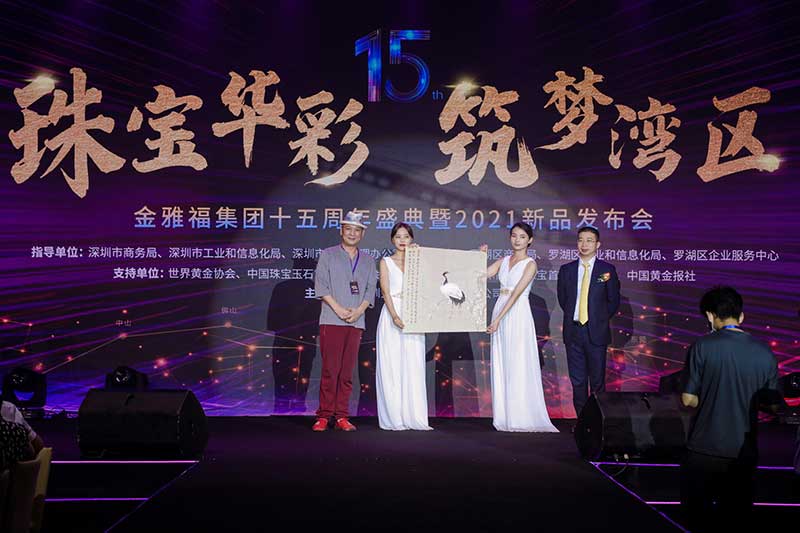 以“珠宝华彩 筑梦湾区”为主题的金雅福集团十五周年盛典暨新品发布会活动现场,设有金雅福集团15周年历程成果展及精品IP展。嘉宾们通过华彩走廊,感受到金雅福以客户为中心、勇担社会责任,从初创者成长为中国企业500强的奋斗历程。在最新IP成果展区里,金雅福2021珠宝新品展、金雅福唯有金系列精品精彩呈现;潮酷萌飒的虎年IP新品:龙梓嘉虎年开财礼盒以及虎墩小镖师一一揭开神秘面纱;非遗大师合作IP项目阶段成果展和大师作品展,以及联名航天IP新品沉浸式展馆也闪亮登场。新品发表会上,首发中国航天主题贵金属产品及唯有金品牌新品,并举行大师签约、IP合作签约仪式,重磅发布金雅福智能黄金回收机,全面呈现金雅福在新智造、新文创、新零售等领域的综合成就。