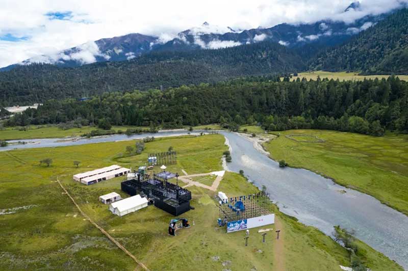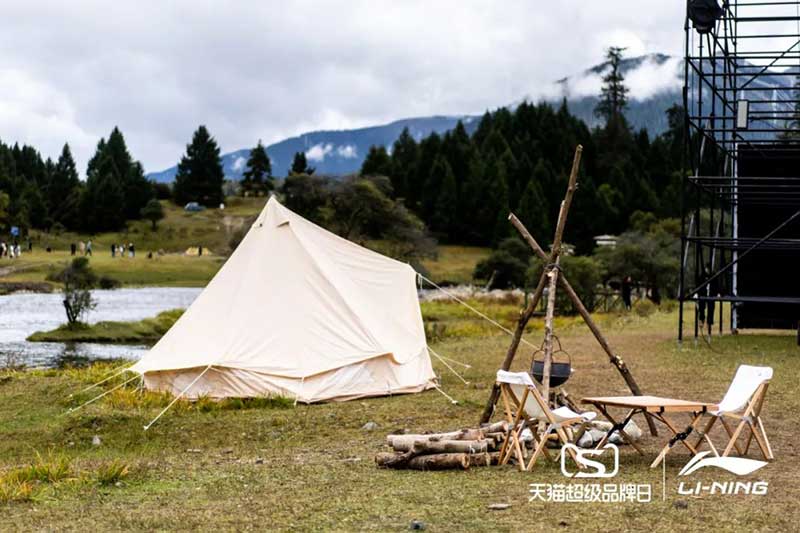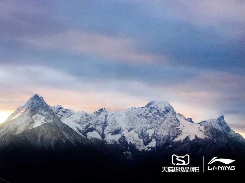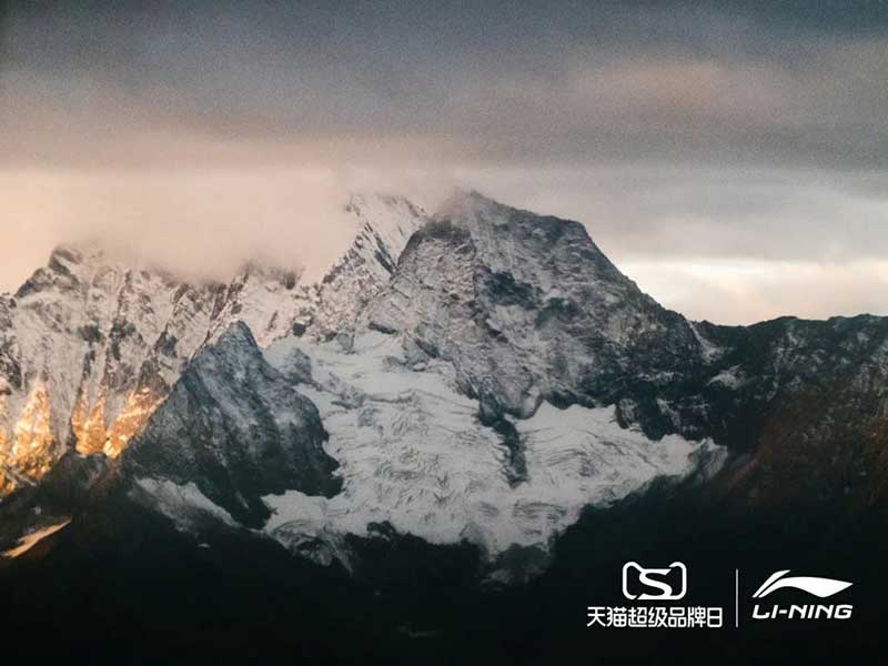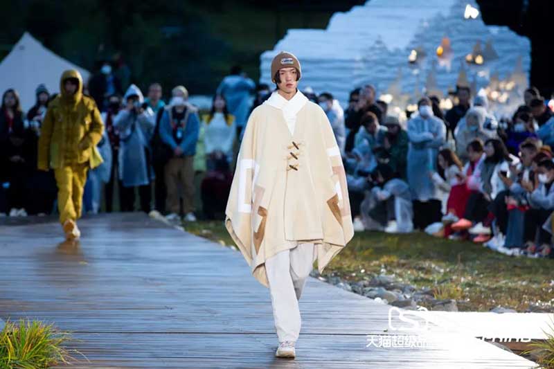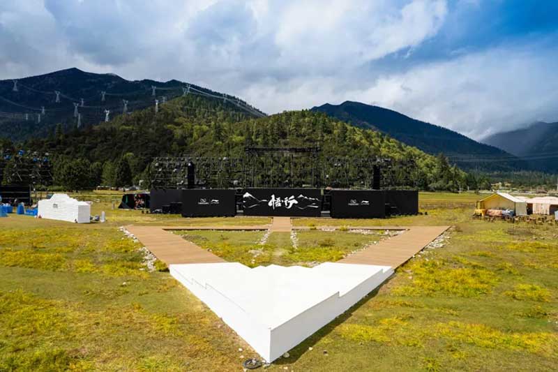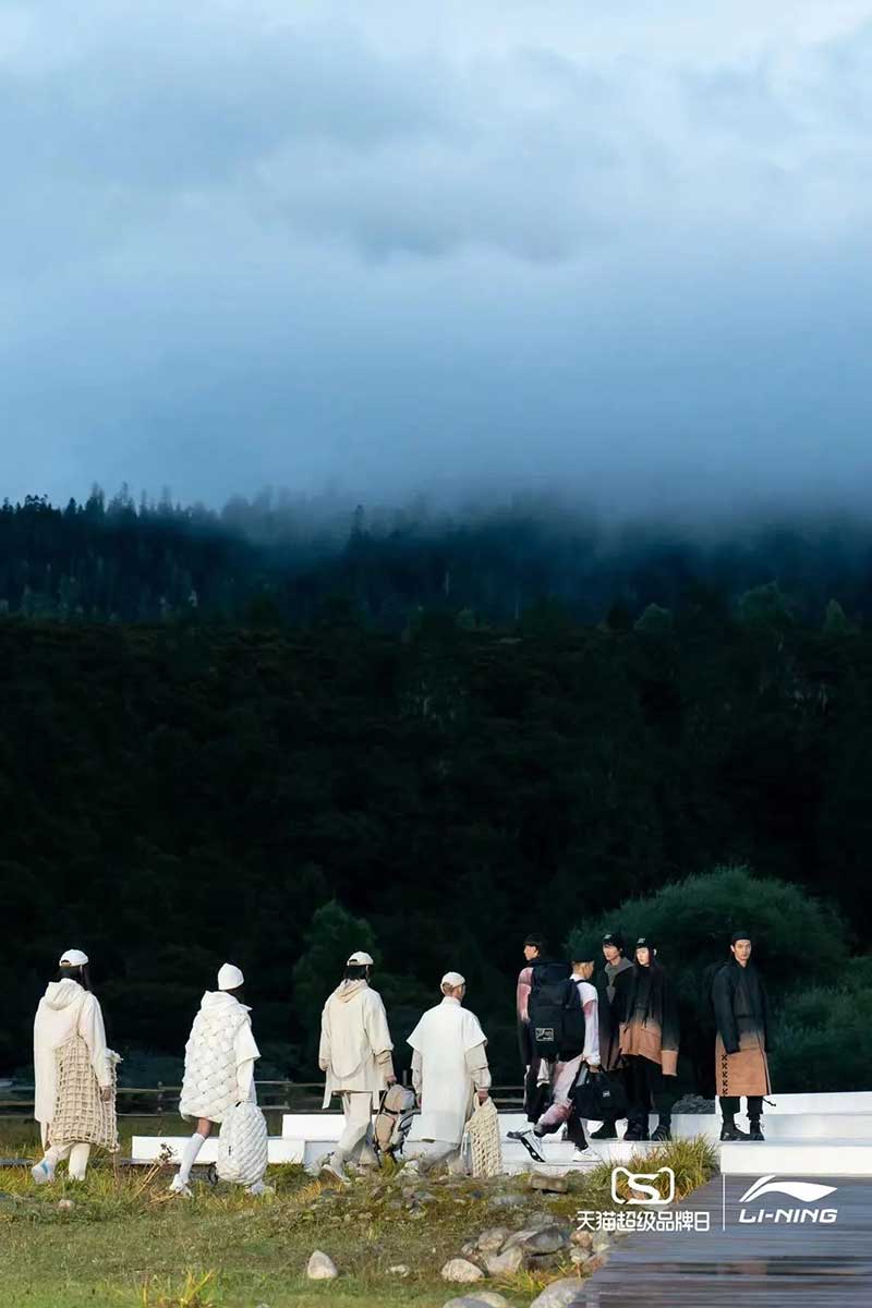 2021年的李宁,步履不停,来到了喜马拉雅山脉旁,逆流而上,在高山之巅体悟攀行意义,这可能是2021行业内最值得期待的一场大秀。李宁以“悟·行”为主题,将今年的秋冬大秀搬到了林芝鲁朗贡措景区举行,鲁朗在藏语里有着“龙王谷”的美称,贡措,藏语的意思是“山势到此就结束”,这里是喜马拉雅山脉和念青唐古拉山脉的分界处,山势到了这里变得比较平缓,所以这里既是川藏线上的天然氧吧,也可以是攀登雪山高峰的起点。3300米的海拔和地理位置,让鲁朗成为了为数不多的可以适合大型线下活动的地方。以天地为背景,雪山为衬托,依水而搭建,群山环绕之中看到秀场。主舞台的设计满富巧思,借助雪山的自然景色搭建起三角形的回环构图,寓意积蓄的生命之力不断迸发,同时也将对悟行的思考融于其中——无论起点在哪,终点永远会在山顶上。