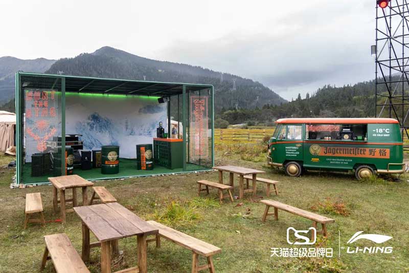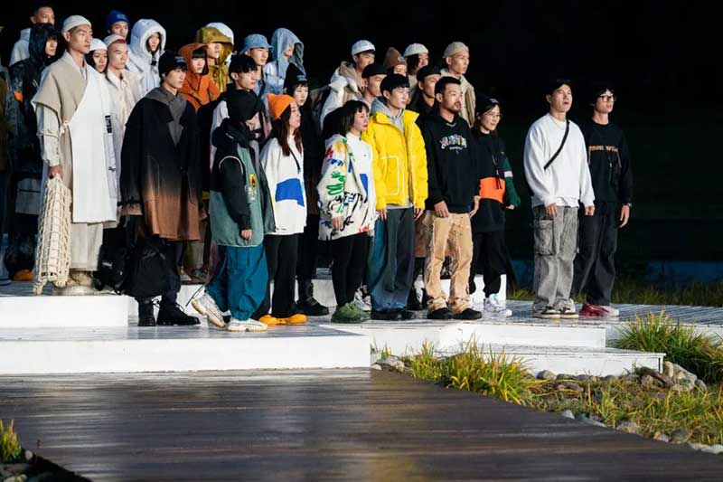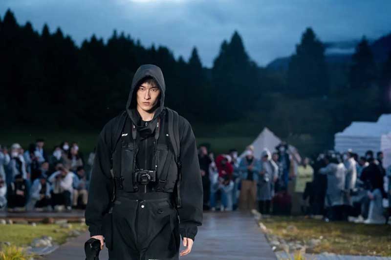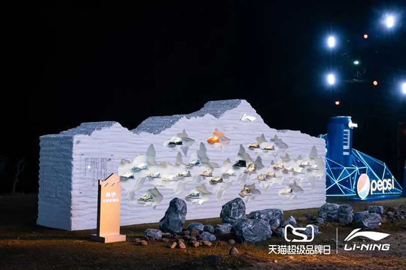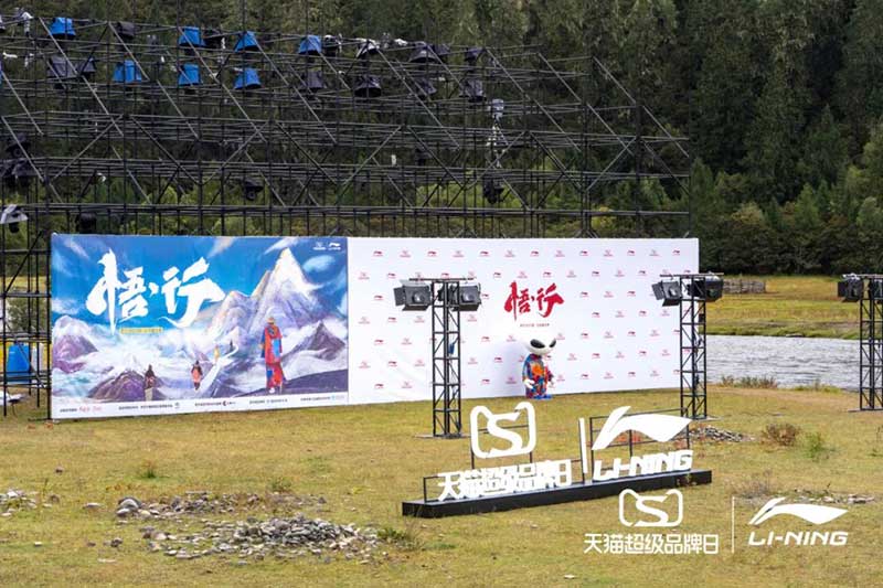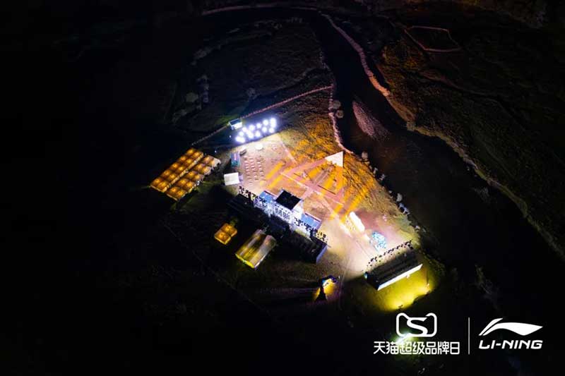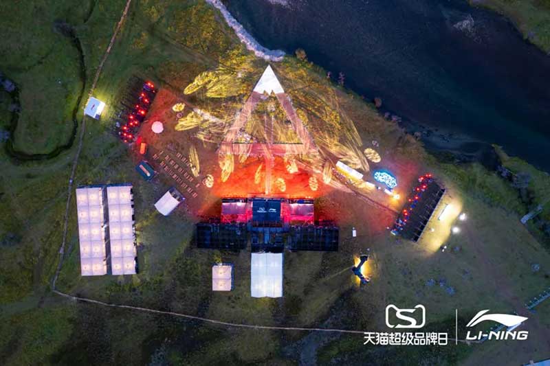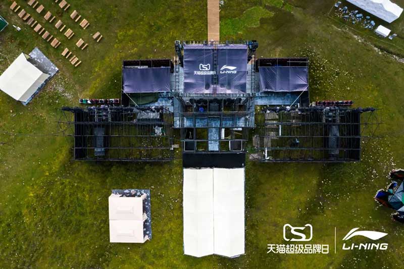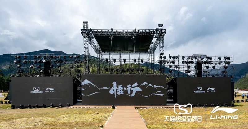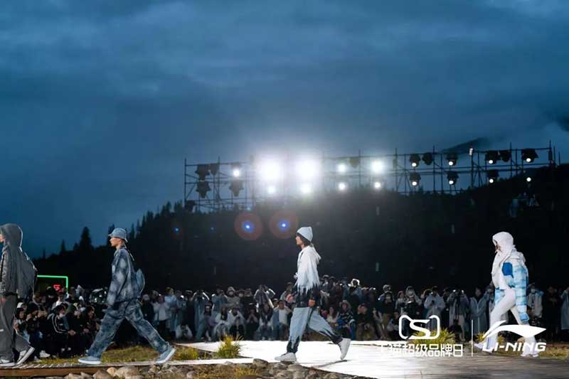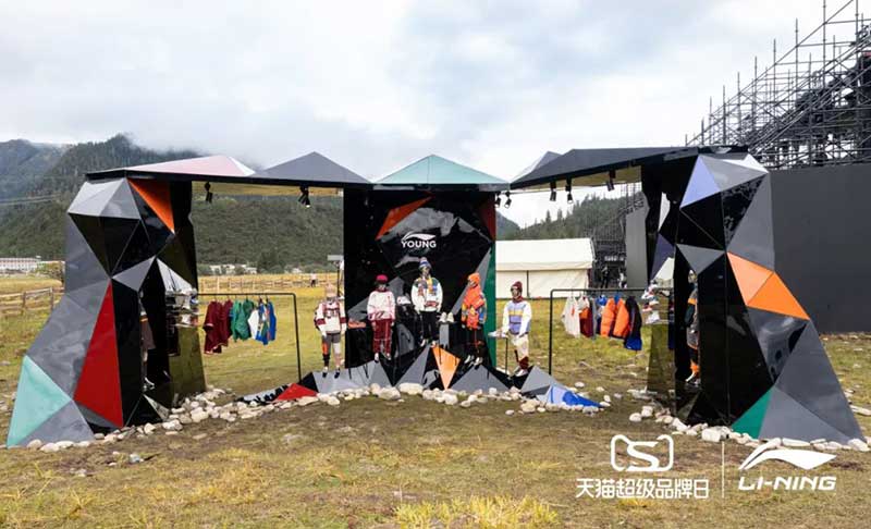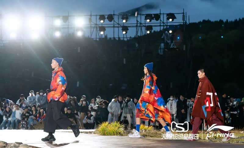 开放式活动场地让人感受与天地相融,每个展区都有不同的创意和设计,为了保证环保大量使用木结构和可回收材料。山间气候多变,晴雨难料,所以防水防雨等措施也提前做好了预案。本场大秀共设置了三个主题板块,分别为天之愿景、地之溯源和人之远方,通过对话天地、自省内心,李宁将“悟”的真谛通过服饰的艺术设计进行极致表达,让人更能体悟到李宁的攀行精神,并将这种精神传递给每一位不断向着心中高峰攀行的行者。