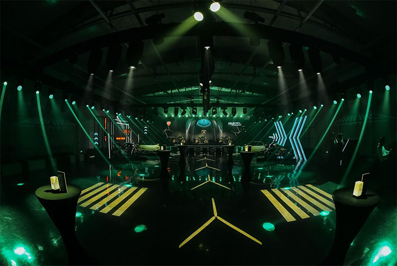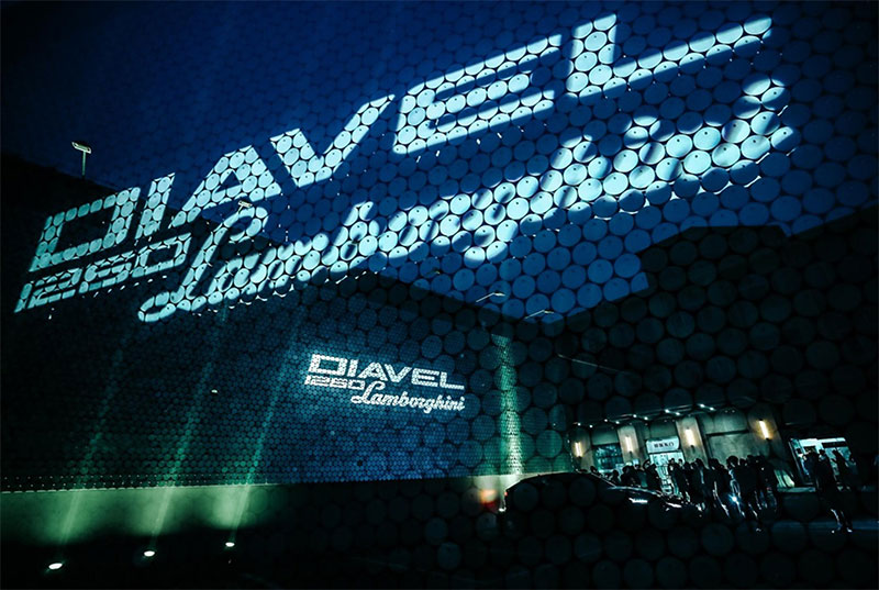 整个活动概念的灵感来自兰博基尼迪亚维尔1260车型在博洛尼亚机场拍摄的的发布视频。因此,活动的主题围绕着机场跑道的灵感元素,整体的地下气氛唤起了一个类似机库的环境。工作人员和演员们都穿着飞行员风格的服装,现场设计和灯光效果也重现机场跑道的感觉,从登记区到有一块令人印象深刻的LED屏幕的舞台。进入主活动区,感觉就像走在机场跑道上,将穿过展示杜卡迪摩托车和兰博基尼汽车的停车场。活动现场设计结合了屏幕、灯光、墙体投影和移动灯的使用,创造了一个整体的地下氛围,突出了两个品牌的创新和时尚定位。