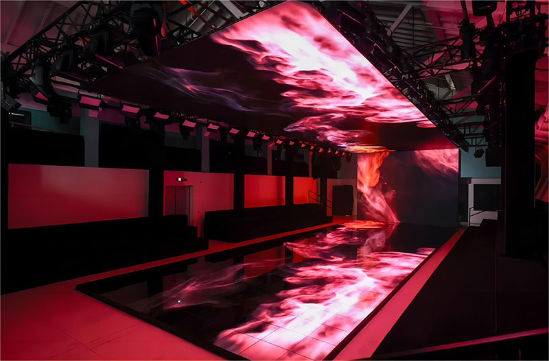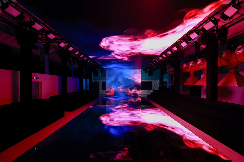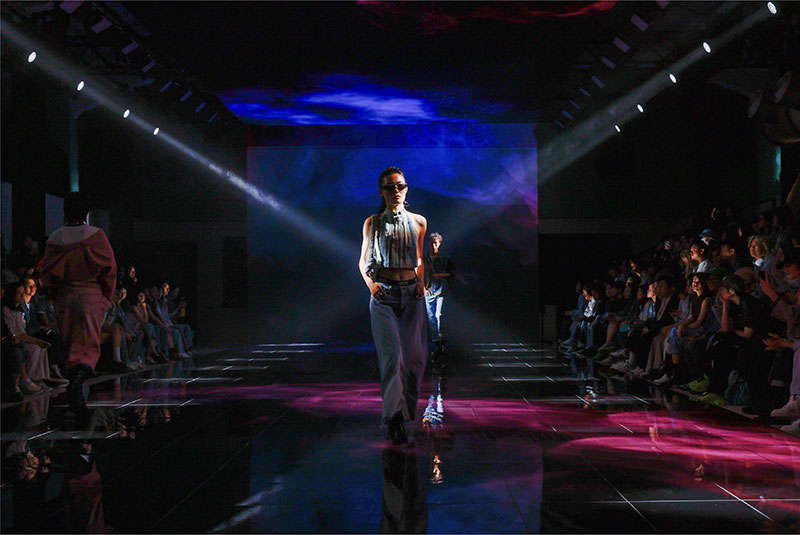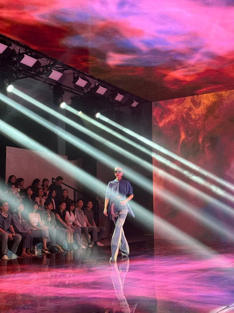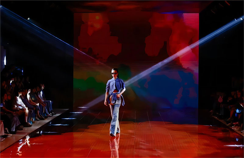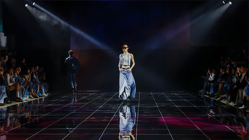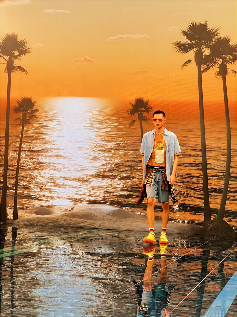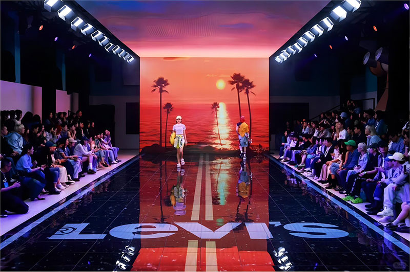 走秀现场三重创意层叠累加!丹宁大秀的现场让精心舞台技术形成的媒介,将冰酷系列产品的裸感、凉感、性感属性表现成了更有效的舞台语言。用舞者充满力量与柔韧性的舞蹈和模特的极致肢体展示表现裸感;用视觉技术描绘的加州海岸沉浸式场景配合清凉海岛秀来描述凉感;用镭射、灯光、烟雾的组合形成高荷尔蒙场景张力描述性感,将大秀拉入高潮的同时观众的现场感受也都达到巅峰。