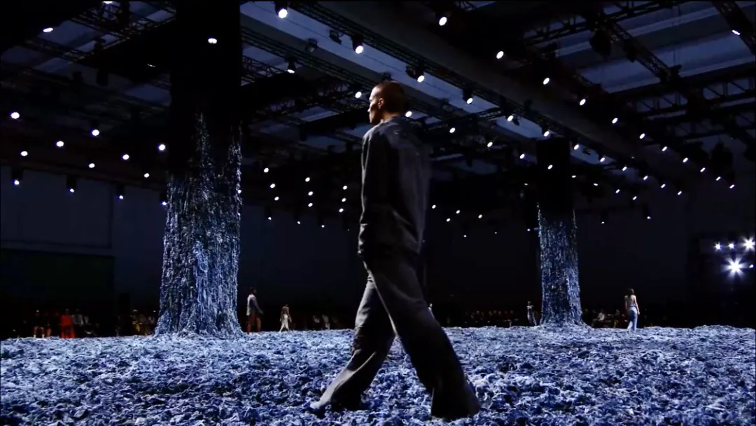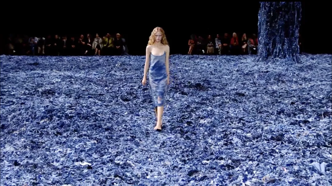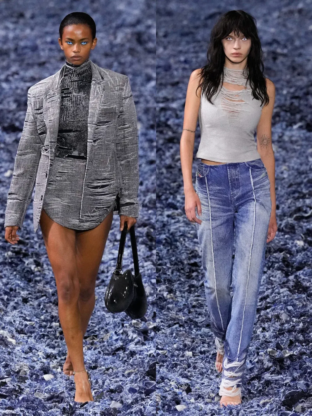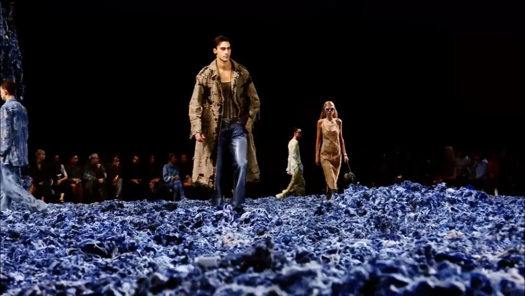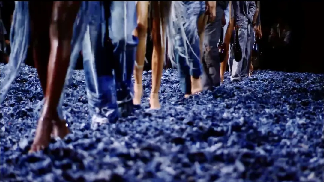 Diesel2025春夏系列时装秀,以再生面料为灵感,借以宣扬时装的可持续性,使用了14,800公斤牛仔布废料打造了一个极具视觉冲击力的沉浸式秀场。不仅仅模特身穿的服饰是由回收印花丝巾、纱线等材料制作而成,现场这14800公斤牛仔废料也都会在秀后重新回收利用制作服饰,艺术时尚与环保可持续完美结合。满地的牛仔废料,感官刺激的同时也是对末日一种艺术化表达,当然更是对模特台步功底的考验。