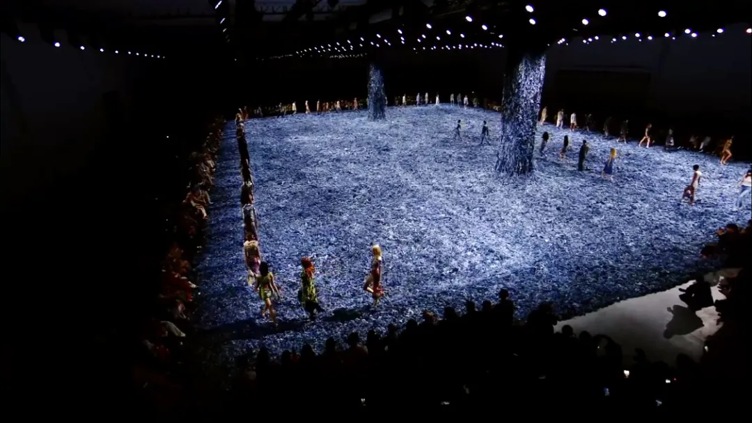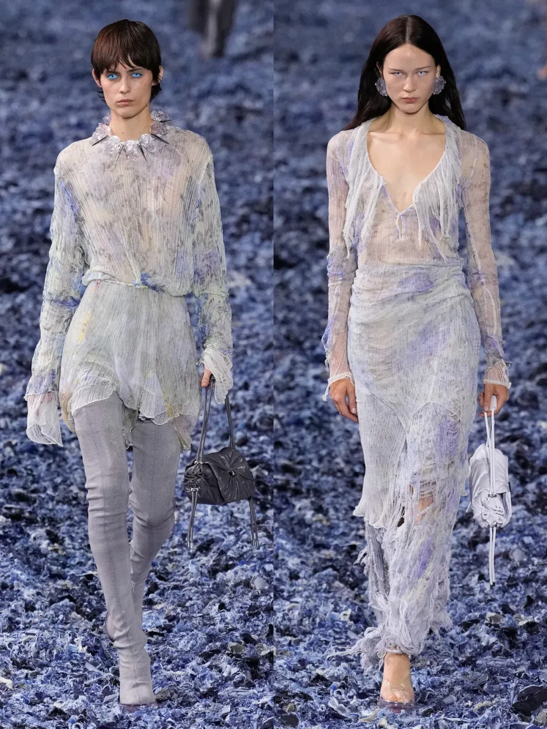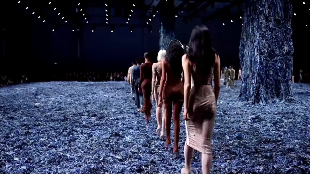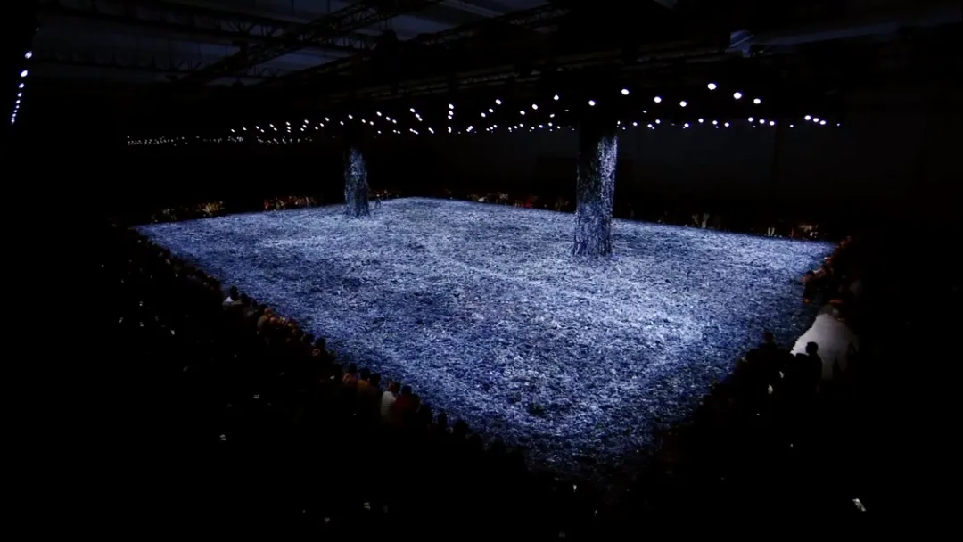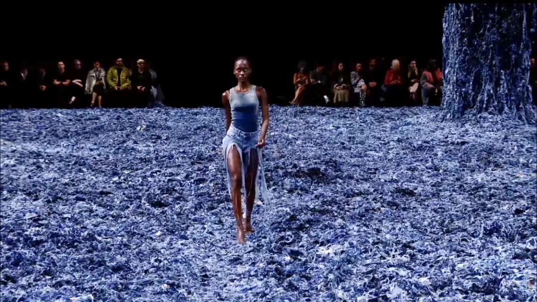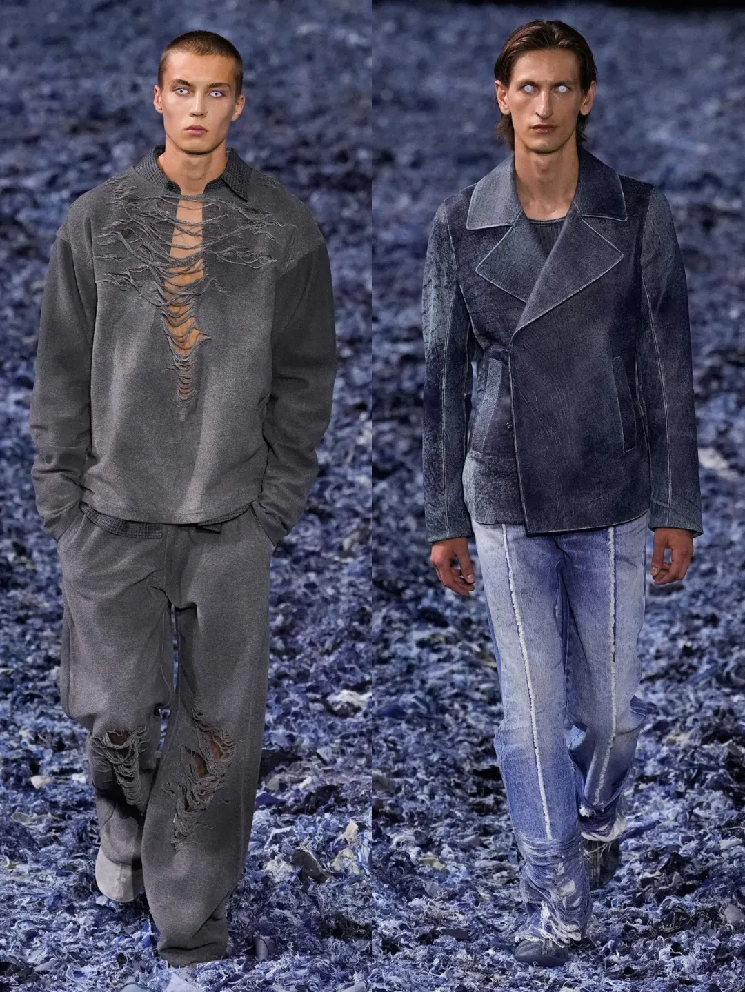 Diesel2025春夏系列时装秀,以再生面料为灵感,借以宣扬时装的可持续性,使用了14,800公斤牛仔布废料打造了一个极具视觉冲击力的沉浸式秀场。不仅仅模特身穿的服饰是由回收印花丝巾、纱线等材料制作而成,现场这14800公斤牛仔废料也都会在秀后重新回收利用制作服饰,艺术时尚与环保可持续完美结合。满地的牛仔废料,感官刺激的同时也是对末日一种艺术化表达,当然更是对模特台步功底的考验。