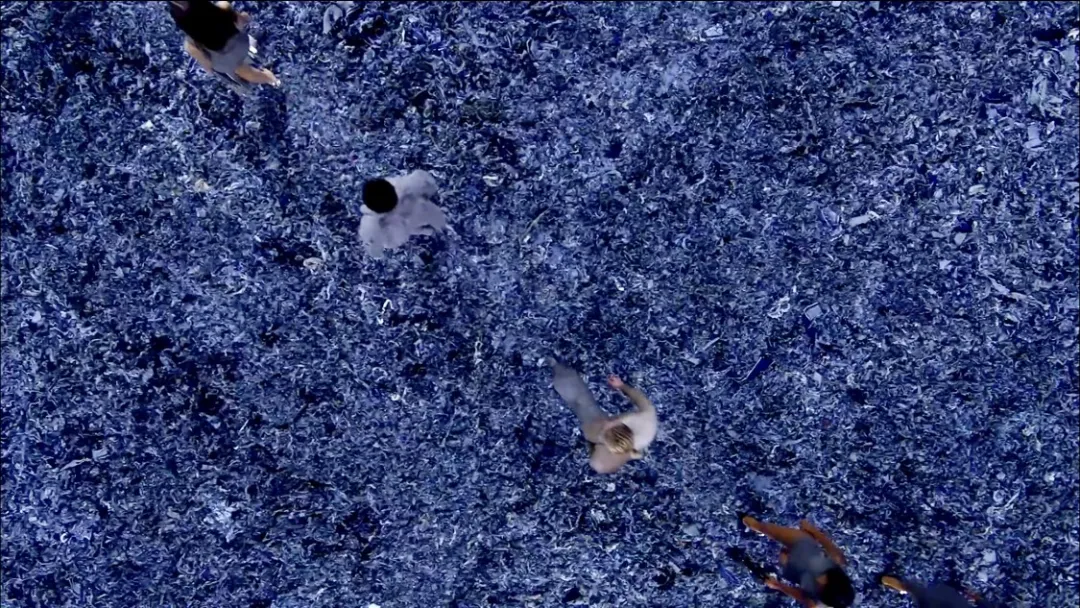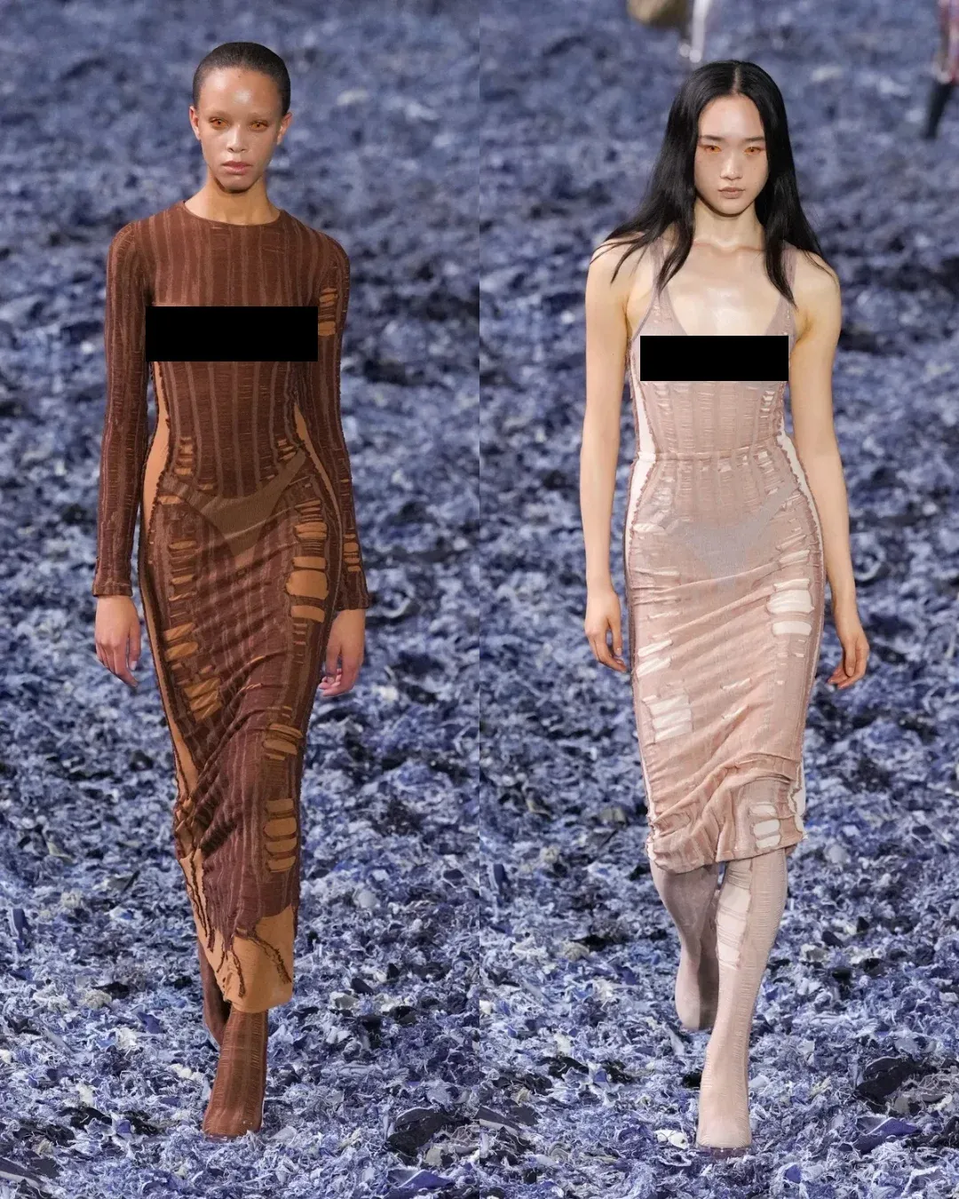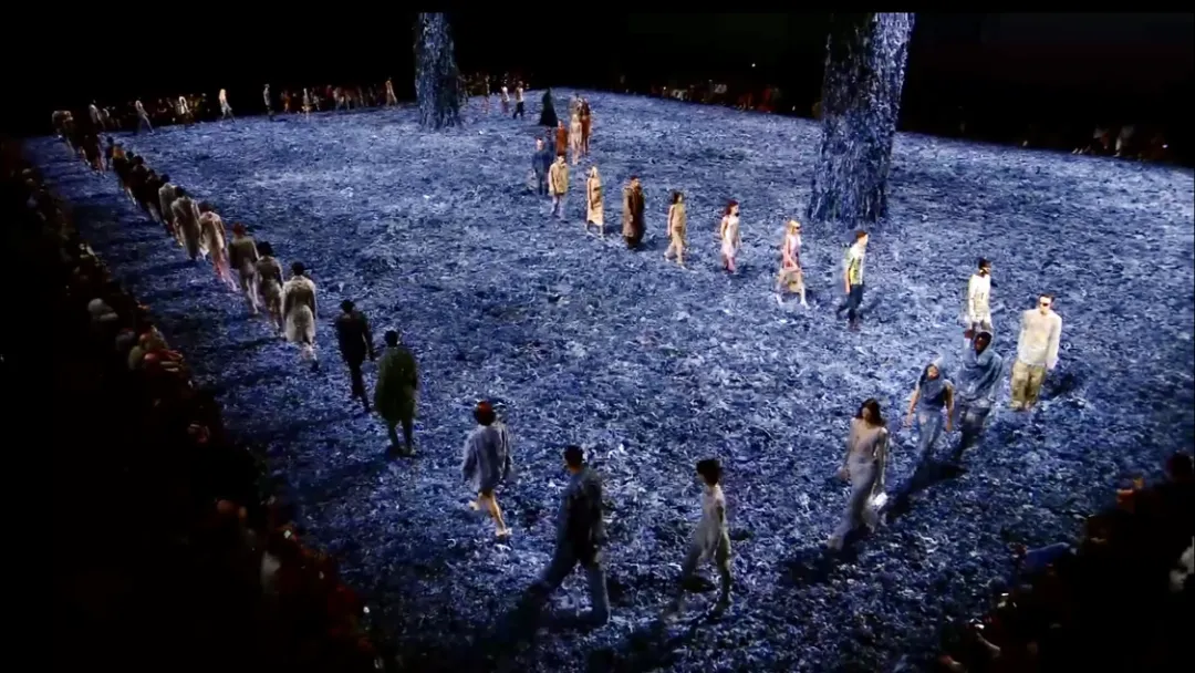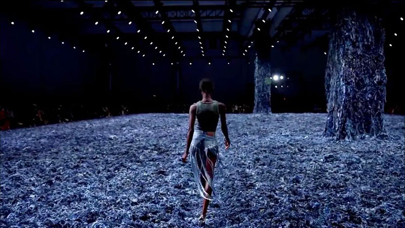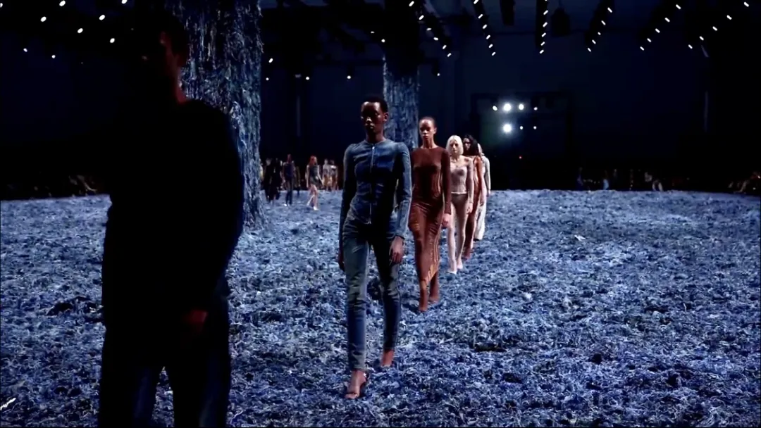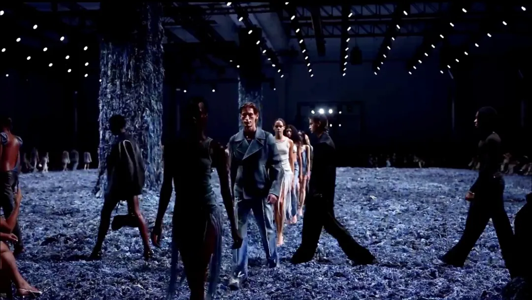 Diesel2025春夏系列时装秀,以再生面料为灵感,借以宣扬时装的可持续性,使用了14,800公斤牛仔布废料打造了一个极具视觉冲击力的沉浸式秀场。不仅仅模特身穿的服饰是由回收印花丝巾、纱线等材料制作而成,现场这14800公斤牛仔废料也都会在秀后重新回收利用制作服饰,艺术时尚与环保可持续完美结合。满地的牛仔废料,感官刺激的同时也是对末日一种艺术化表达,当然更是对模特台步功底的考验。