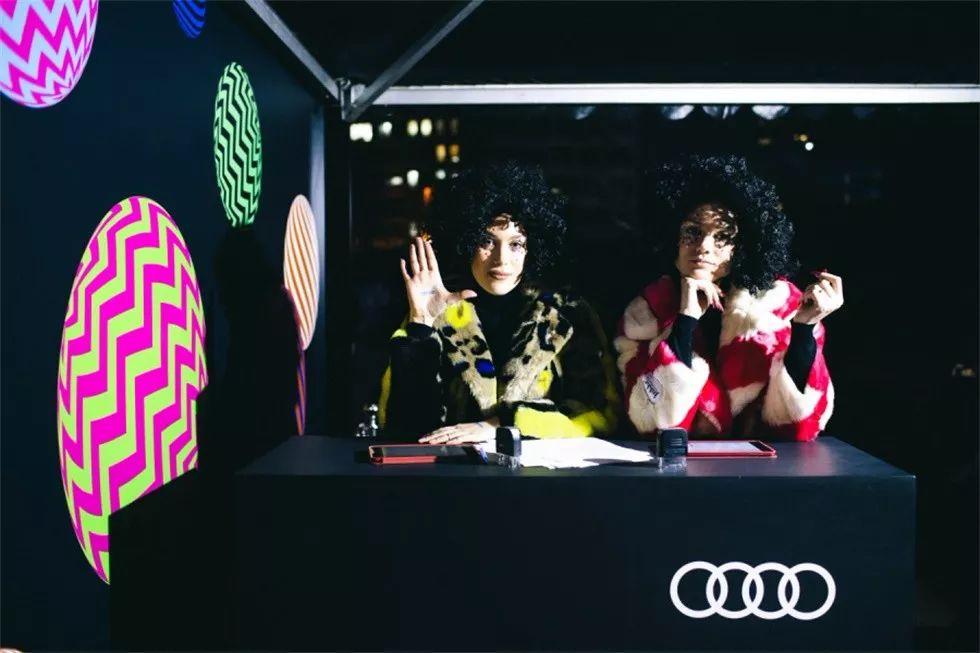 第二个区域的主角是一顶神秘的“魔术师帽子”,由LED显示屏搭建而成。随着客人们的到来,灯光熄灭,视频内容开始播放,让人更近距离地了解Q3的主要功能。但它不是你想象的那样,新车辆的外观完全不是熟悉的形象。当视频结束时,“魔术师的帽子”被升起,露出了里面停放的Q3。客人们被邀请去探索两个艺术装置: 马戏团“笼子”里的豹子(Q3被涂装成了豹纹样式),四周的激光束代表了笼子,而另一个装置是代表老虎的Q3准备跳过一个火环。