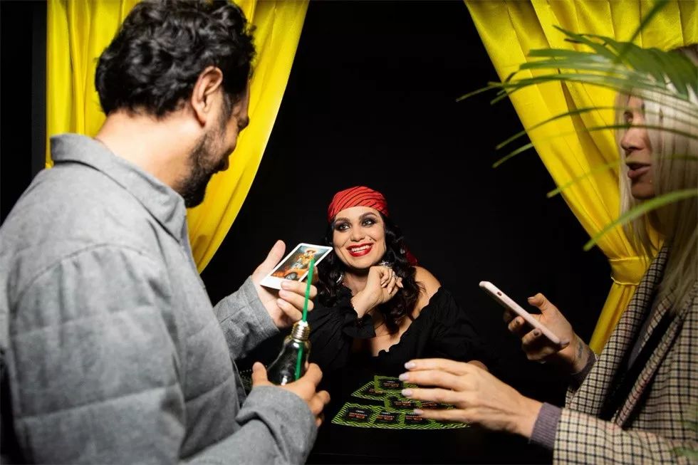 这个空间被划分为三个区域:一个拍照区,一个糖果女孩分发马戏团食物的偶遇区,一个算命摊,在那里他们可以面对自己的命运。