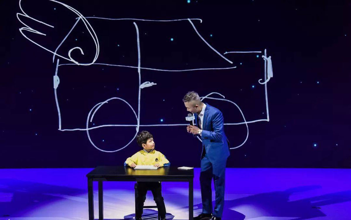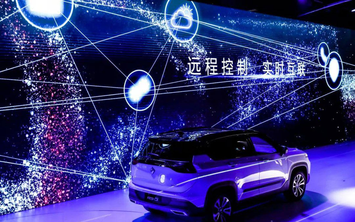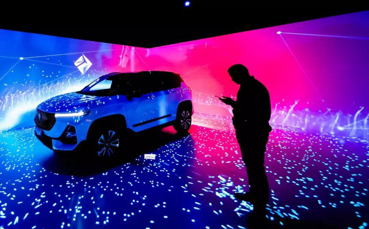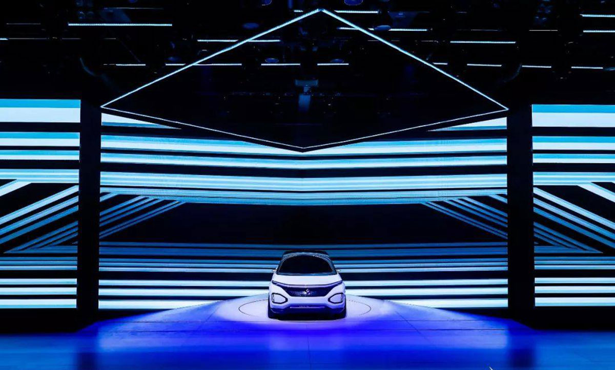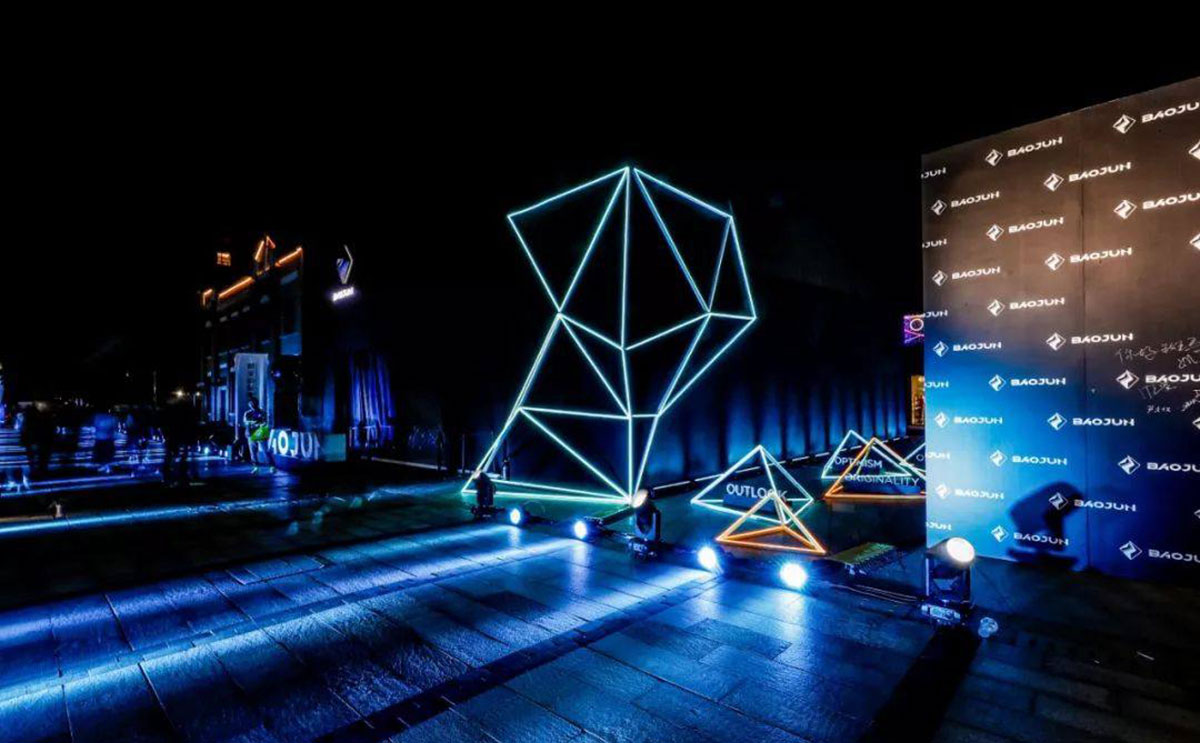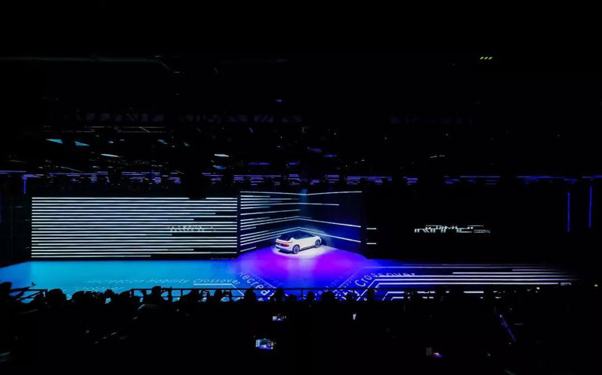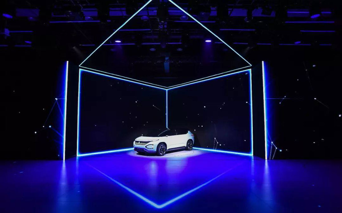 这次会议改变了屏幕结构,以可移动变化的屏幕和时尚的光带结构展示时尚和科技形象,屏幕结构随着链接的变化而移动,打开隐藏的空间创造了一个惊喜。在技术方面,实现了精确的同步,视听灯一个按钮精确同步。舞蹈、数控灯条、CNC开合屏、激光和CNC旋转转盘共同营造出时尚科技的氛围,帮助品牌完成新面貌的亮相。而大气的整屏幕和地面投影在不规则的灯光装饰下,呈现出年轻而充满活力的氛围。最醒目的菱形折角隐藏空间,打开了宝骏RM-C,激光聚焦在视线上,完美呈现星际几何设计理念。