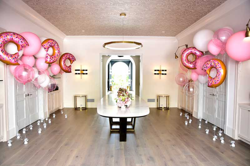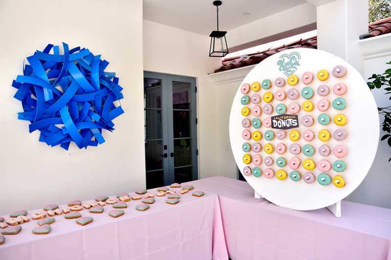 FIX 伏特加赞助了该活动,服务员们为客人们递上了香槟和西瓜伏特加鸡尾酒等饮料。36号街的一家寿司店用柔和的粉色和绿色做出了寿司卷,用紫色的兰花装饰客人的盘子。现场的糕点来自“加利福尼亚甜甜圈”,它在现场进行了制作,还设计了复古的甜甜圈墙。“SusieCakes”提供符合女性审美的纸杯蛋糕,冷库豪斯提供了冰淇淋三明治。