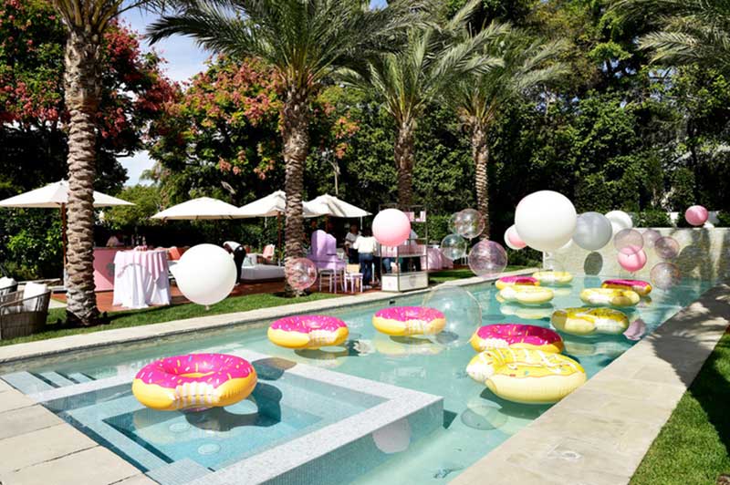 在泳池处,气球和甜甜圈漂浮物一起装点着泳池,营造出一种水花四溅的效果。在头顶上,一台机器在后院喷吐着泡泡,变装皇后“肉丸”(绰号)在派对进行到一半时突然冒了出来。