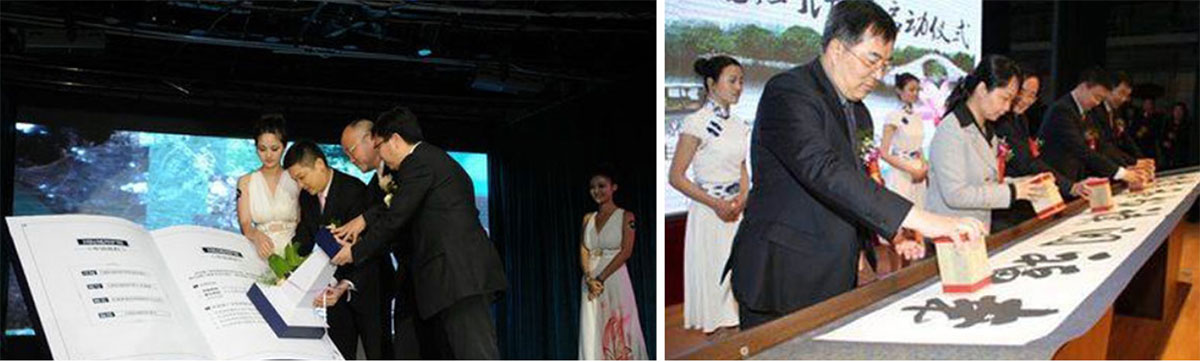 领导把印章印在书卷上,LED大屏开始播放企业文化视频,舞台两侧礼炮响起