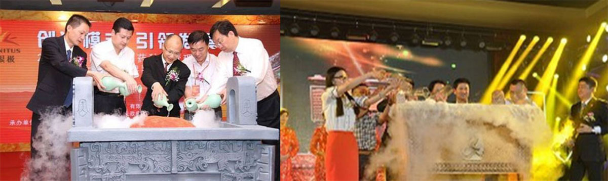 领导把红酒倒入金鼎中,这是雾气升起,呈现一片祥和气氛,舞台两侧礼炮响起