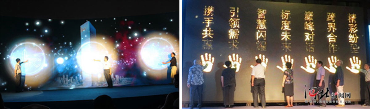 领导把手放在大屏手印上,大屏开始播放企业文化视频,舞台两侧礼炮响起