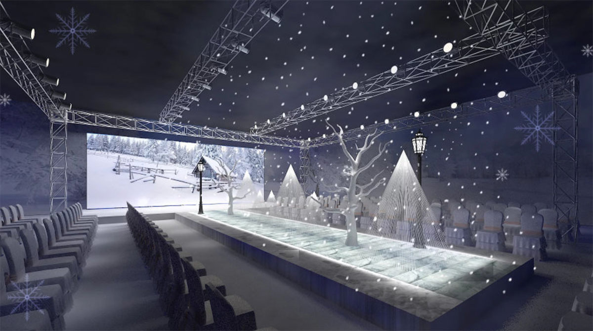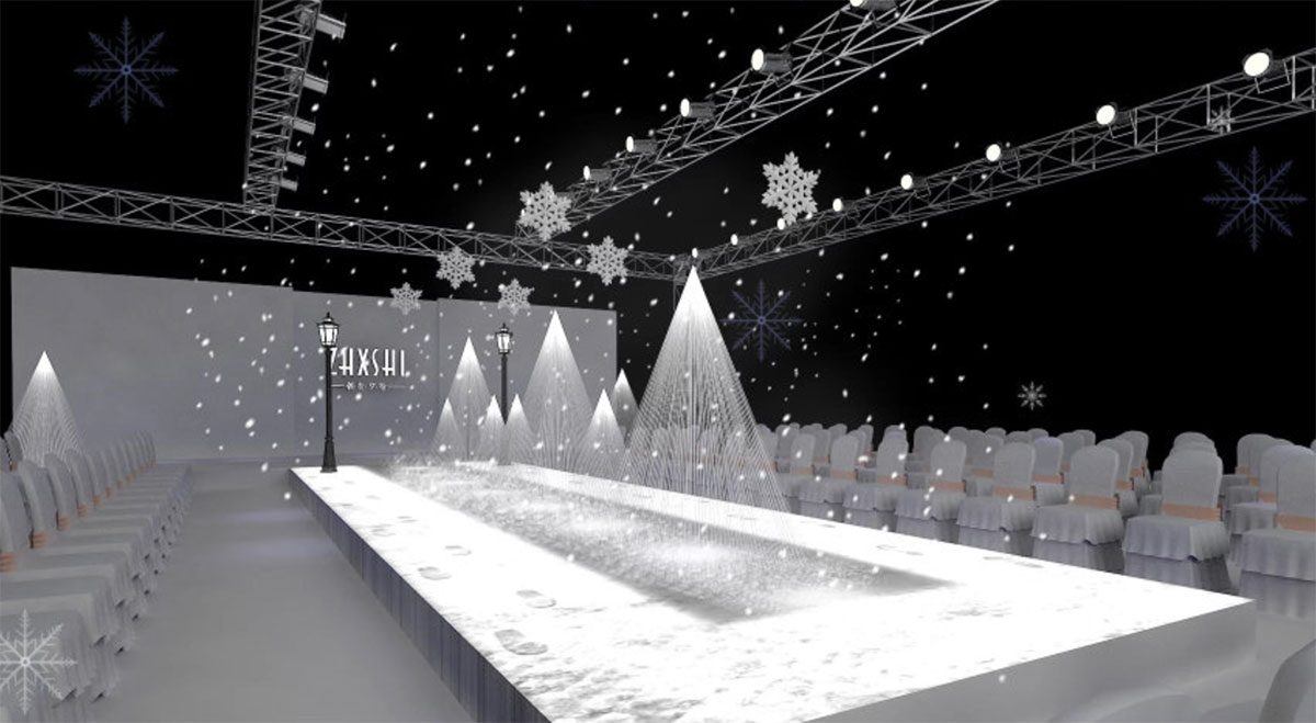 此次服装秀场转变成一个雪王国,整个秀场雪白雪白的,T台上方悬挂雪花挂件,墙上打满雪花logo等与飘下来的雪花形成虚实结合的场景,模特儿们就算穿上厚重的冬装,也能咨意地在雪王国中绽放最耀眼的姿态。