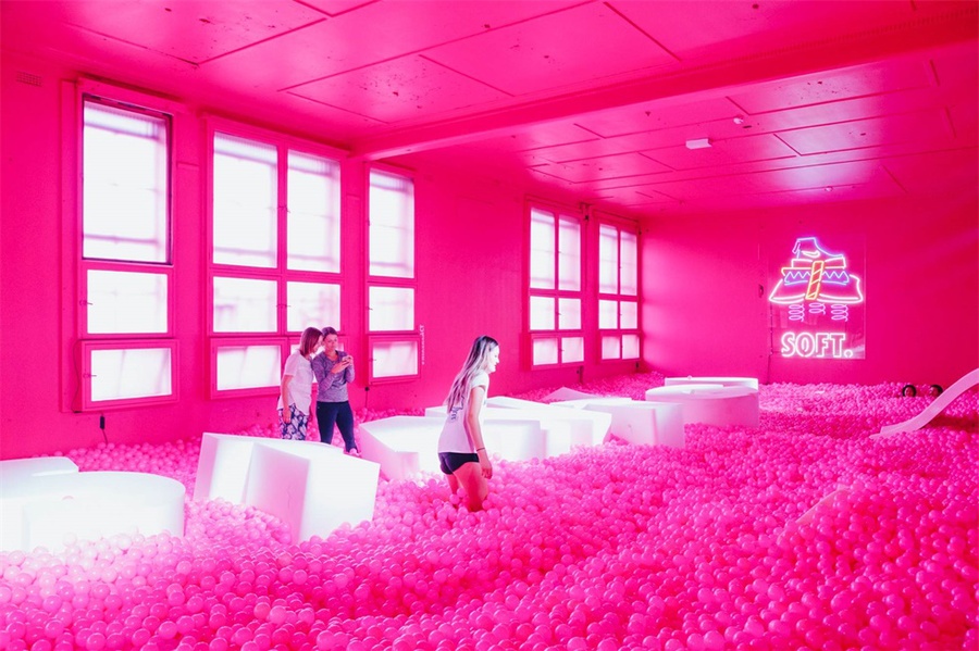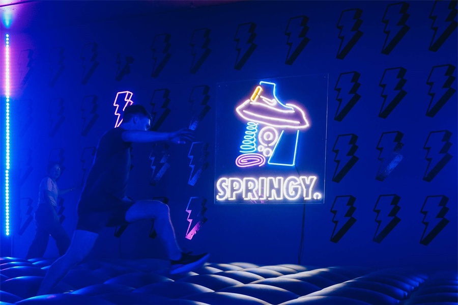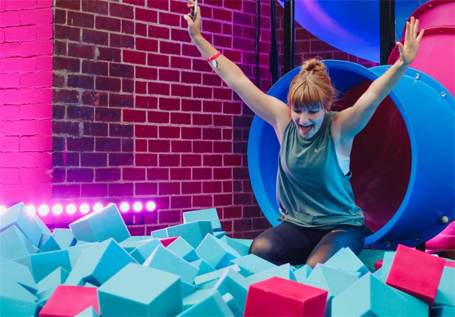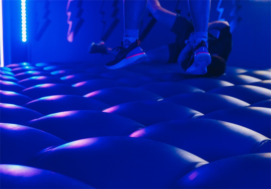 乐园的名字叫The Nike House of Go,其特色是迷宫般的房间布局,每个房间里有不同的功能,有的是弹跳房、跑步房,甚至还有滑梯,所有的运动体验都是为了让粉丝们体验Nike React跑鞋的核心功能。体验的旅程开始于一个巨大的粉色海洋球坑,里面据说有50万个粉色海洋,紧随其后的是一个室内跳跃城堡,一个气泡屋里充满了氦气球,随着气球的舞动,室内的灯光也在不断变化色彩,走出气泡屋粉丝们将开始在一个在虚拟现实屏幕前跑步,他们将穿越弗吉尼亚首府里士满,最后是一个漩涡型的滑道,客人将滑到屋外地面的一个泡沫坑里。