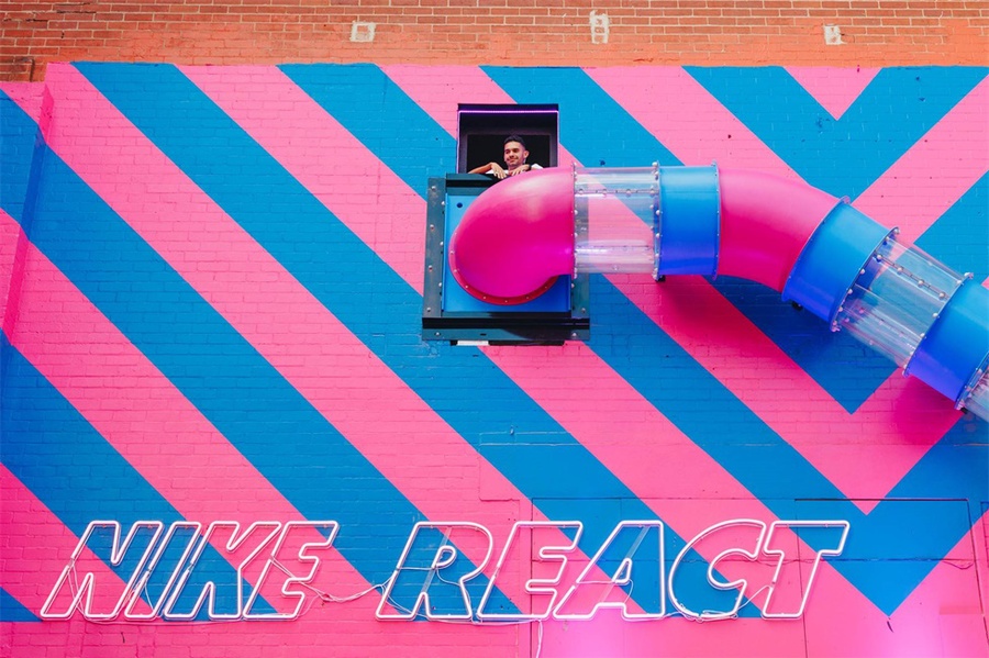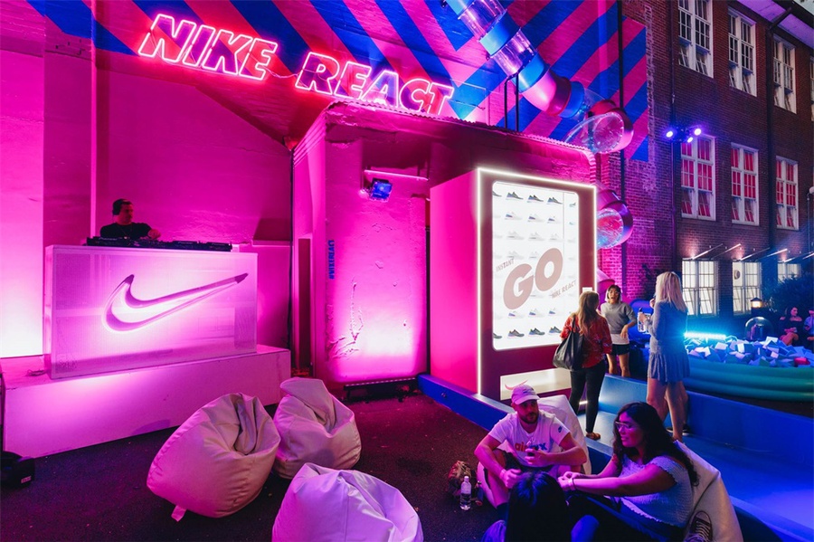 耐克为其新款的耐克Epic React运动鞋的发布设计一个体验中心。这双鞋的关键词是好玩、让人惊喜、色彩缤纷、有趣,所以,创造了一种身临其境的体验,活动关键词也是有趣、让人惊喜、色彩缤纷、超感官,最重要的是面对面体验品牌时的乐趣。为了庆祝耐克的新Epic React跑鞋的发布,科林伍德艺术区被改造成一个适合成年人的互动乐园。