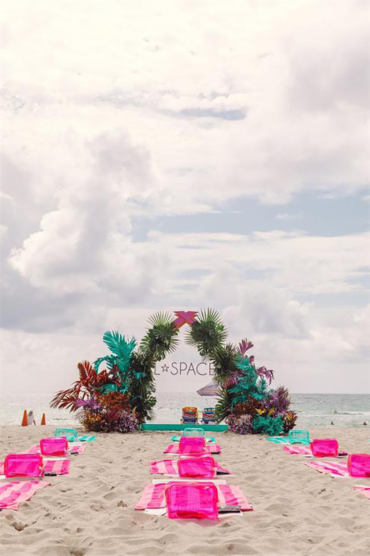 活动在红颜酒店后面的海滩上开始,健身课在定制的品牌形象装置前面进行,装置上用热带植物和鲜花装饰,补充了现场缺乏的色彩,也代表了品牌推出的明亮、大胆、多彩的新系列。
