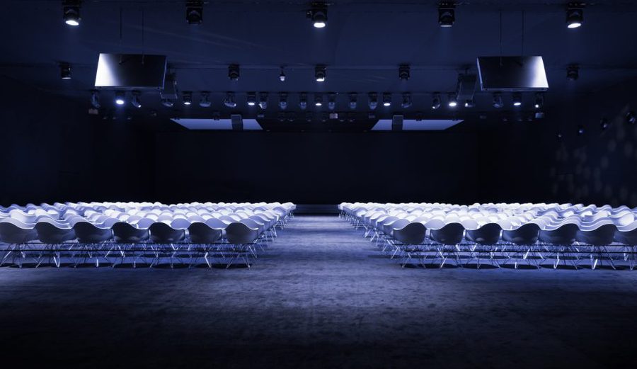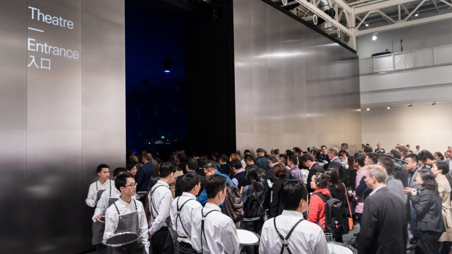 “盒子”里有一个专为发布会设计的剧场,这里将举行极星1号轿车的发布,主题演讲和媒体拍摄。一个长26米、高5.5米的LED屏幕作为舞台背景。在“盒子”外,是活动的等待区。一个360度的极星金色吧台提供茶点,金色是为了配合极星轿车Akebono刹车的颜色而开发的,空旷的场地点缀了六张沙发,现场流露出简约的设计风格,在这里还有一场有特色的极星1号摄影艺术展。