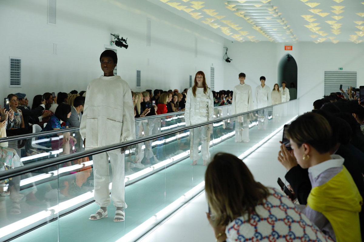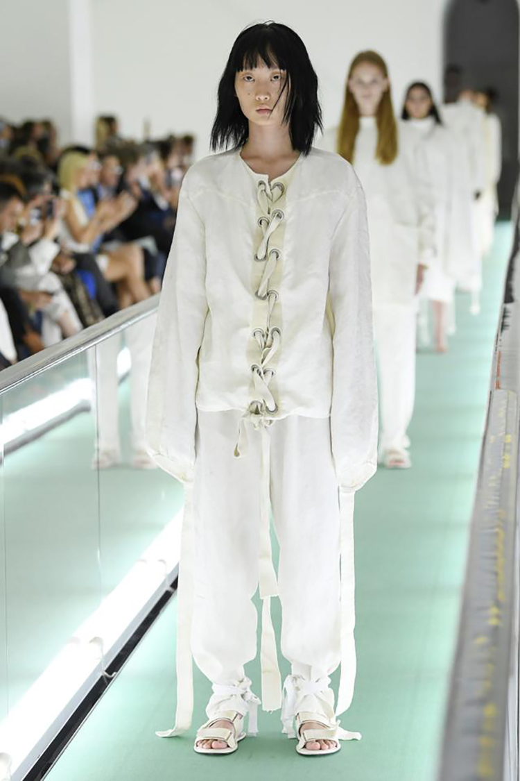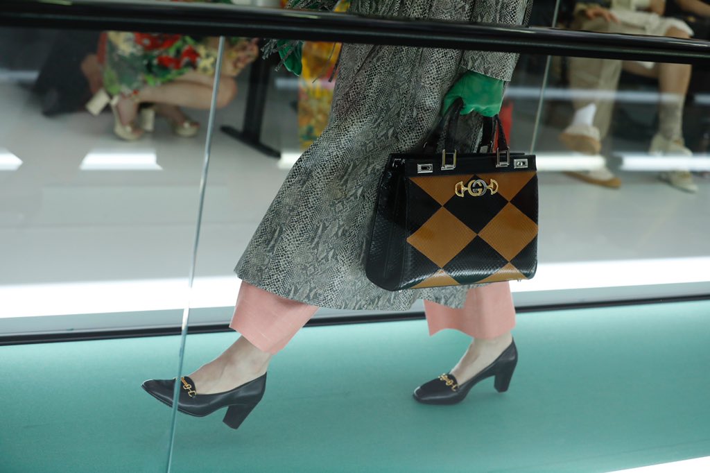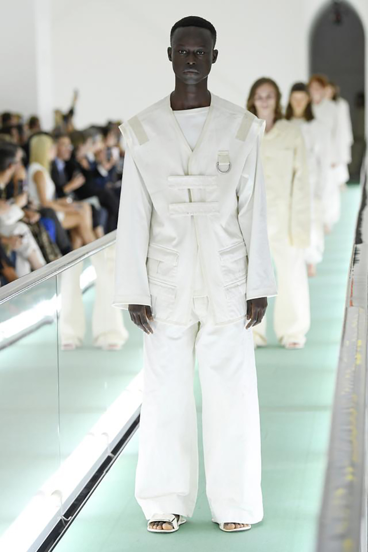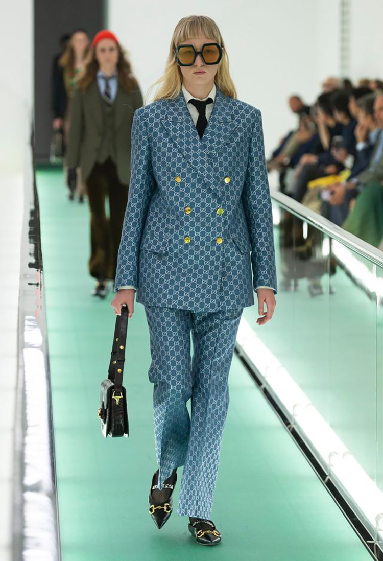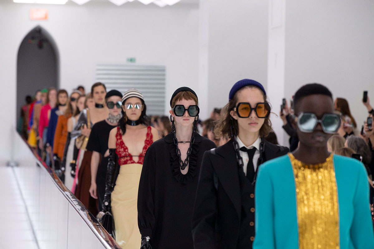 GUCCI SS20秀场,选在了自家的米兰GUCCI HUB,简洁空间,白色空间,传送带秀台,实际秀场中模特有的需要走秀,有的靠传送带传输。而创意总监Alessandro Michele也在Gucci 2020春夏系列设计中,加入了一部分很不Gucci的设计,一系列纯白色的服装被男女模特展示,这部分服装更贴近最原始的色彩,像是未经染色的白坯布,模特们则像被传送带传送出来,异常“死板”。
